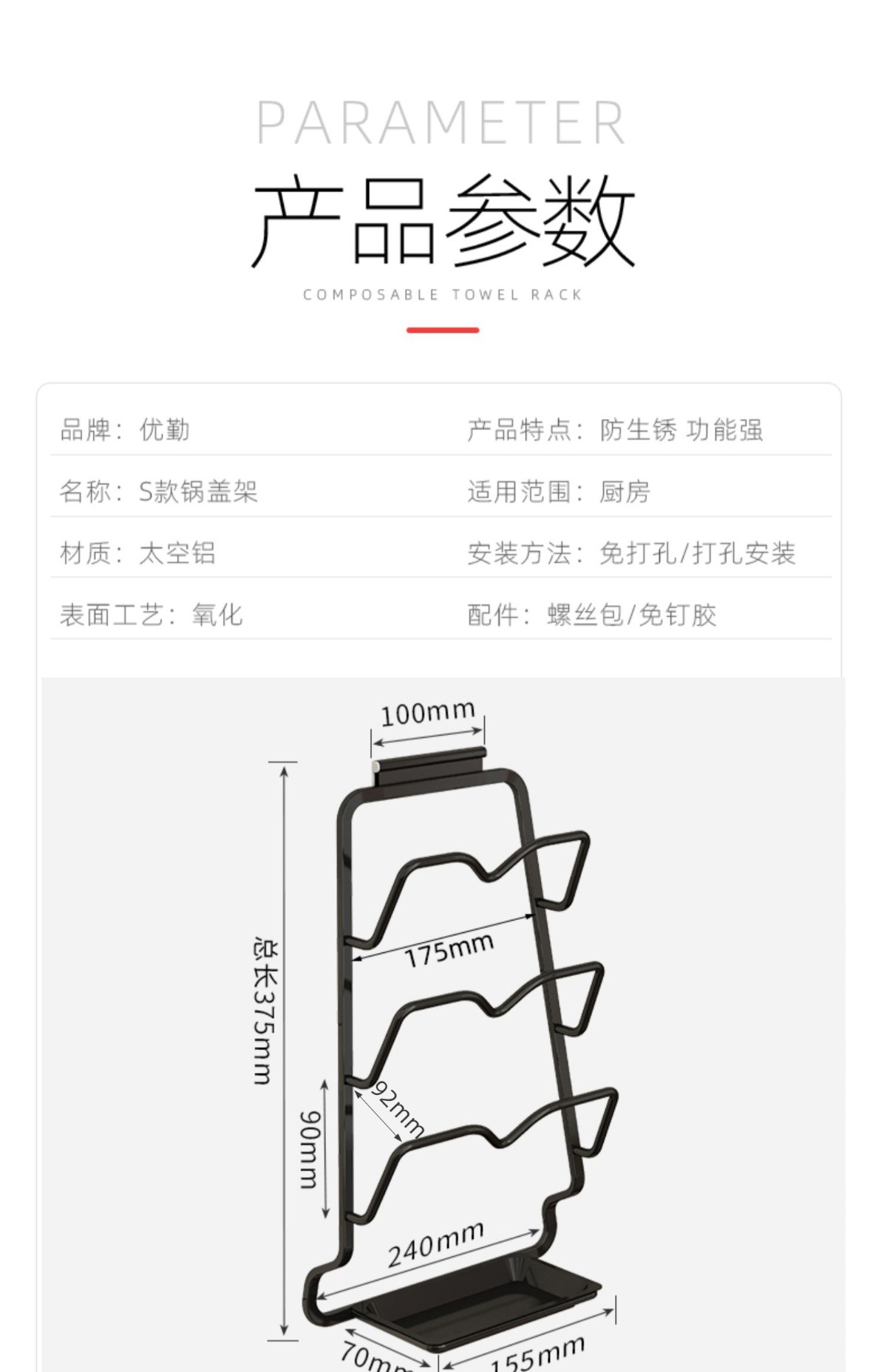 • 3단 벽걸이 냄비 뚜껑 홀더 - 건그레이