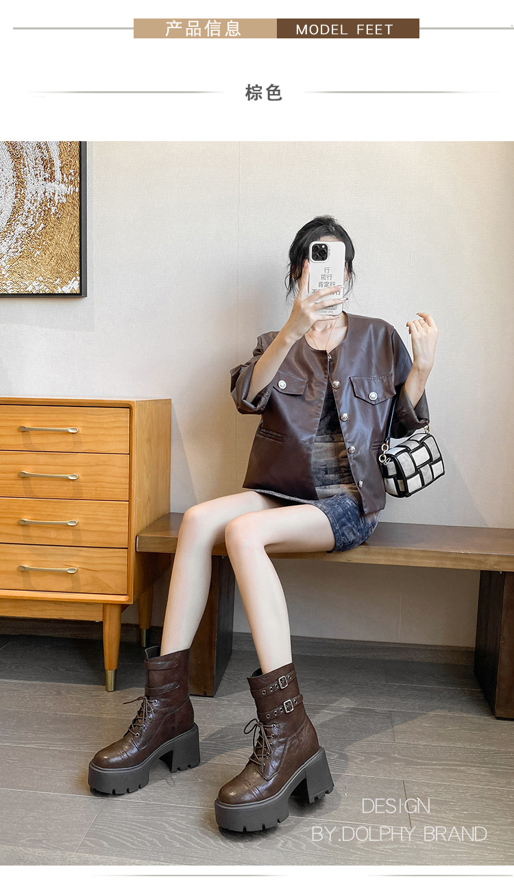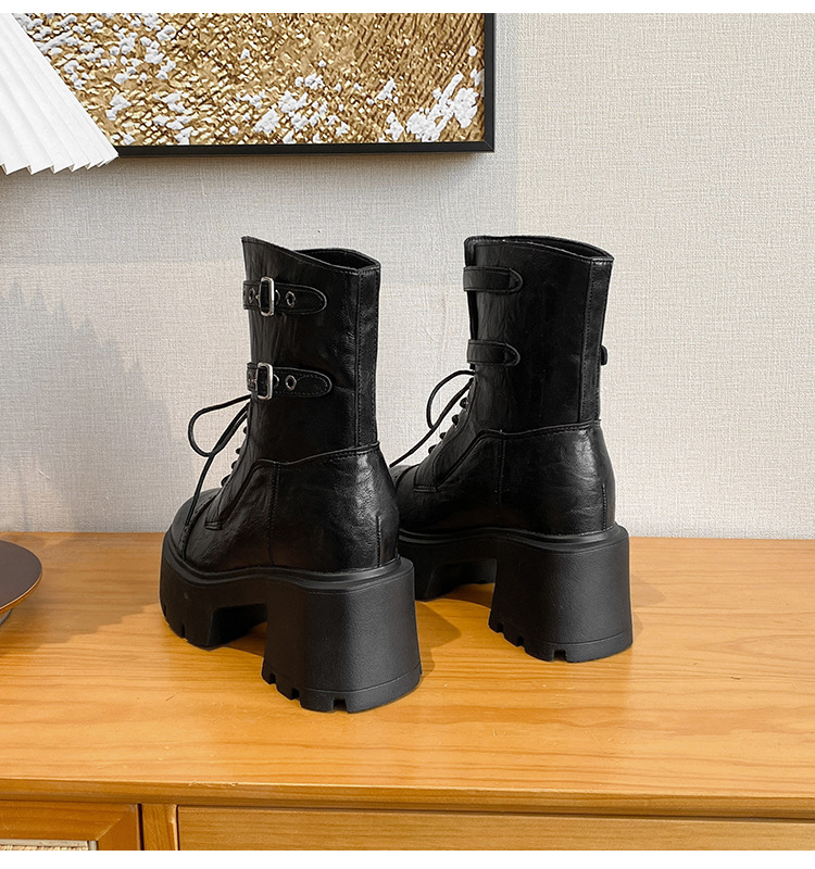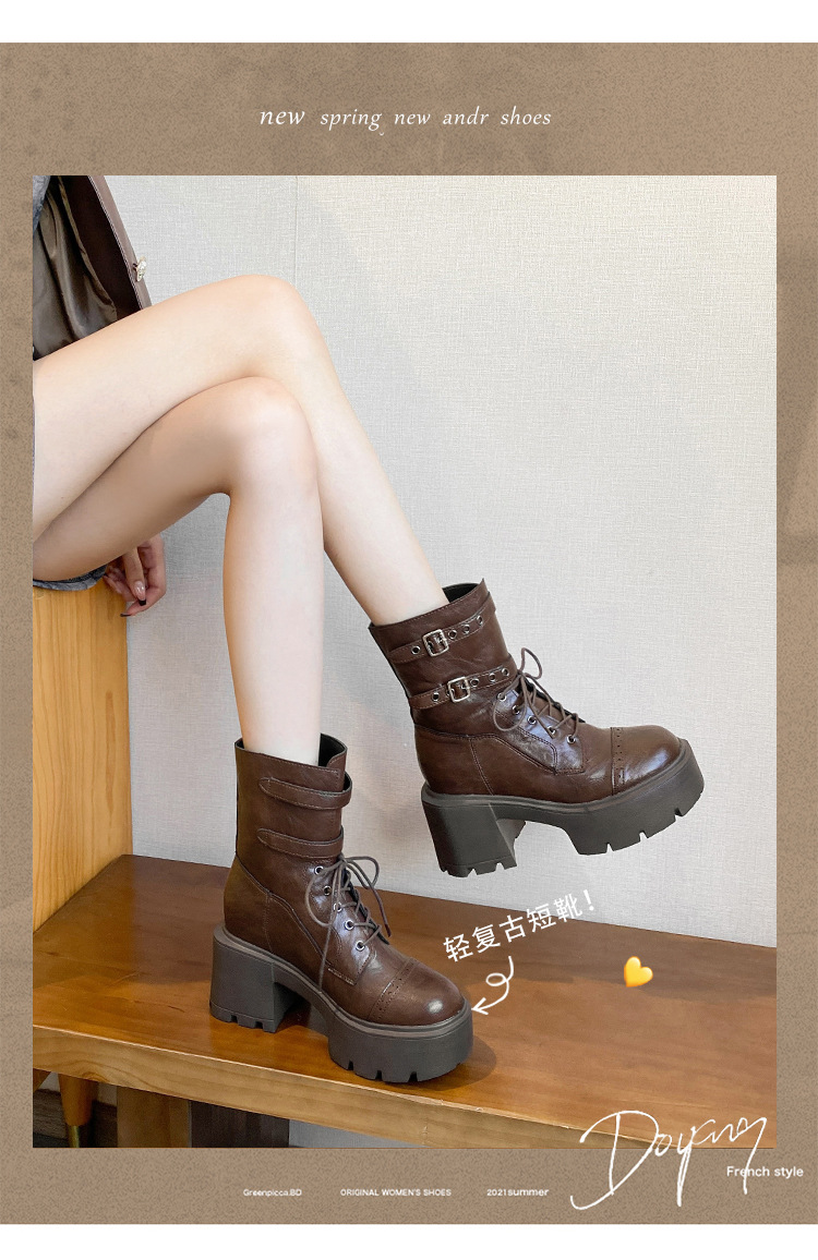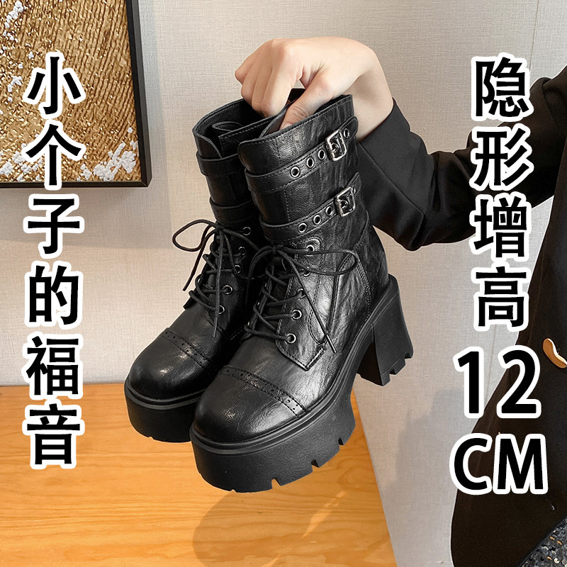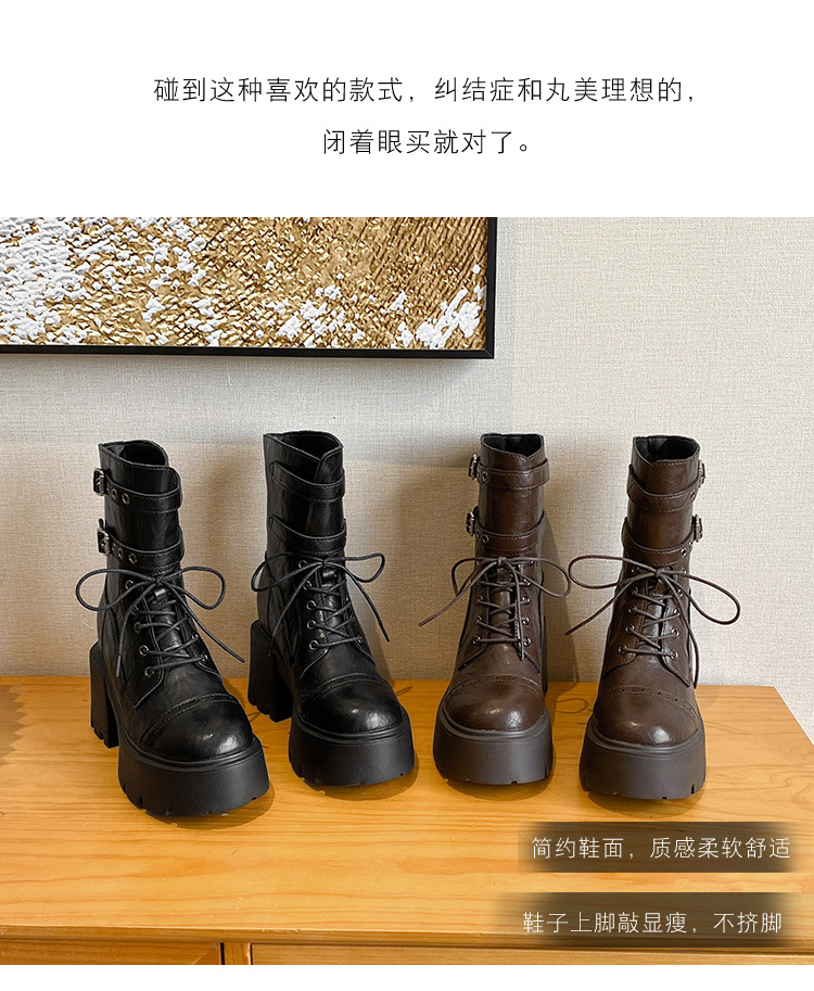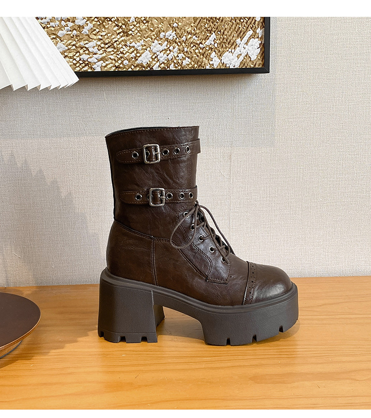 내부 높이 12cm 작은 다크 브라운 마틴 부츠 여성 영국 스타일 벨트 버클 오토바이 부츠 두꺼운 단독 높은 짧은 부츠스토어 가기