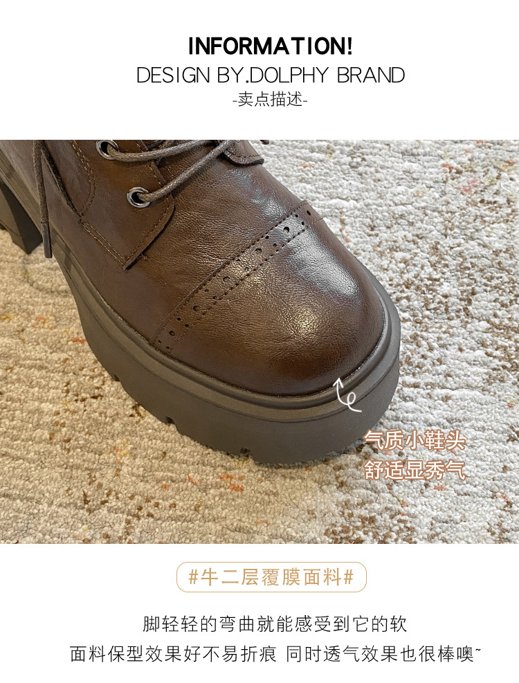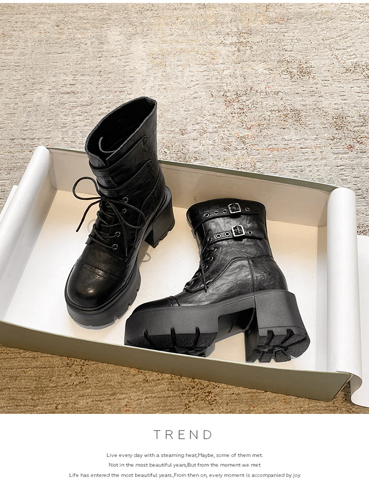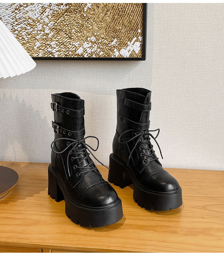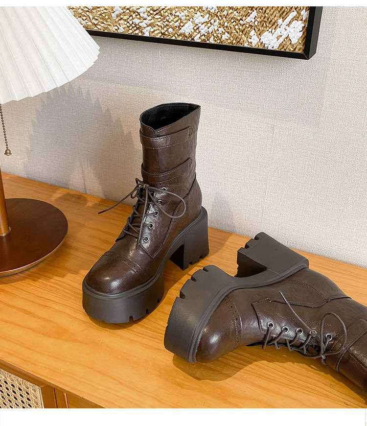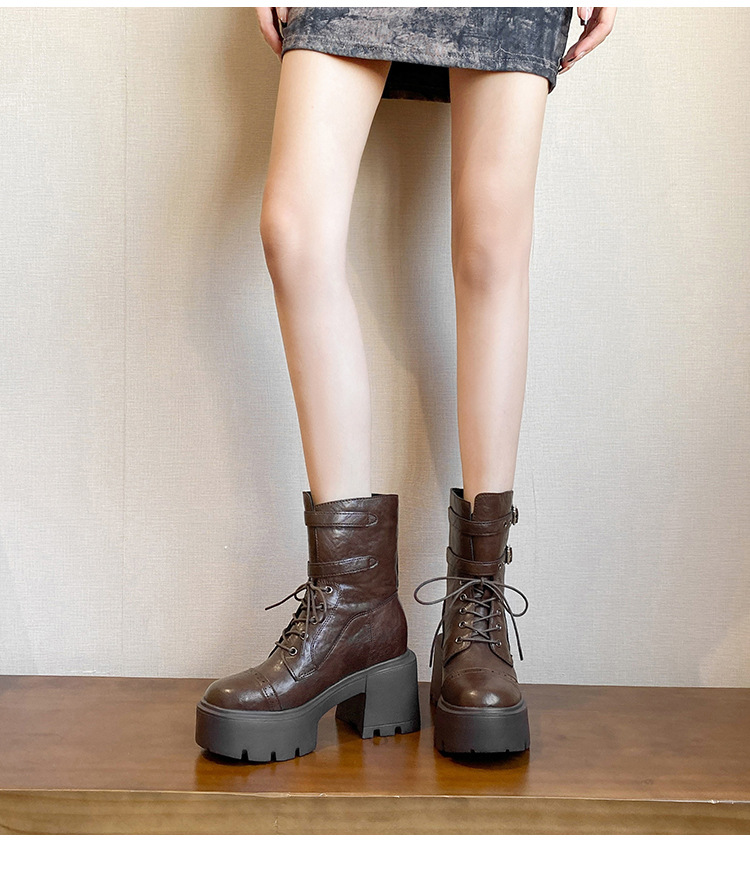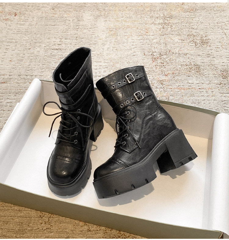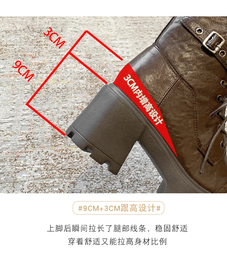 내부 높이 12cm 작은 다크 브라운 마틴 부츠 여성 영국 스타일 벨트 버클 오토바이 부츠 두꺼운 단독 높은 짧은 부츠스토어 가기