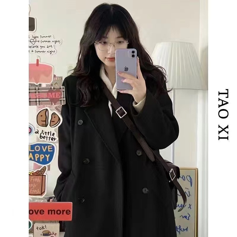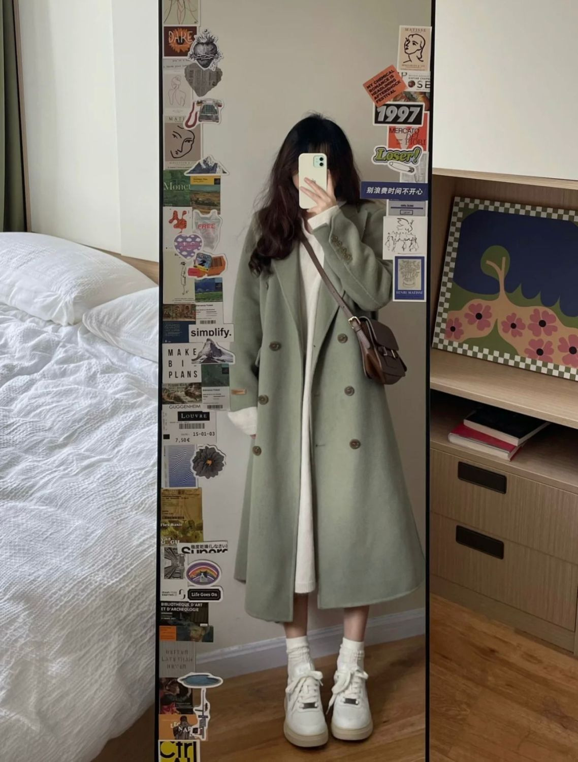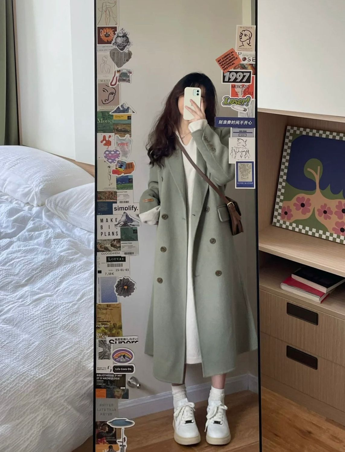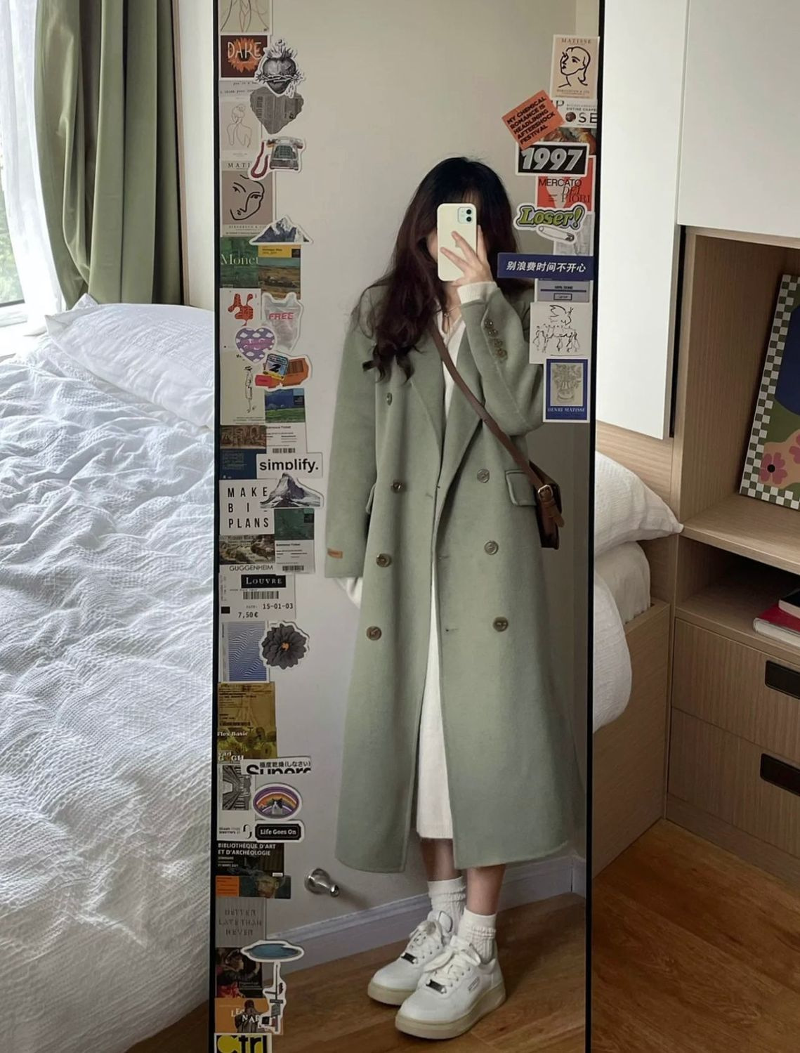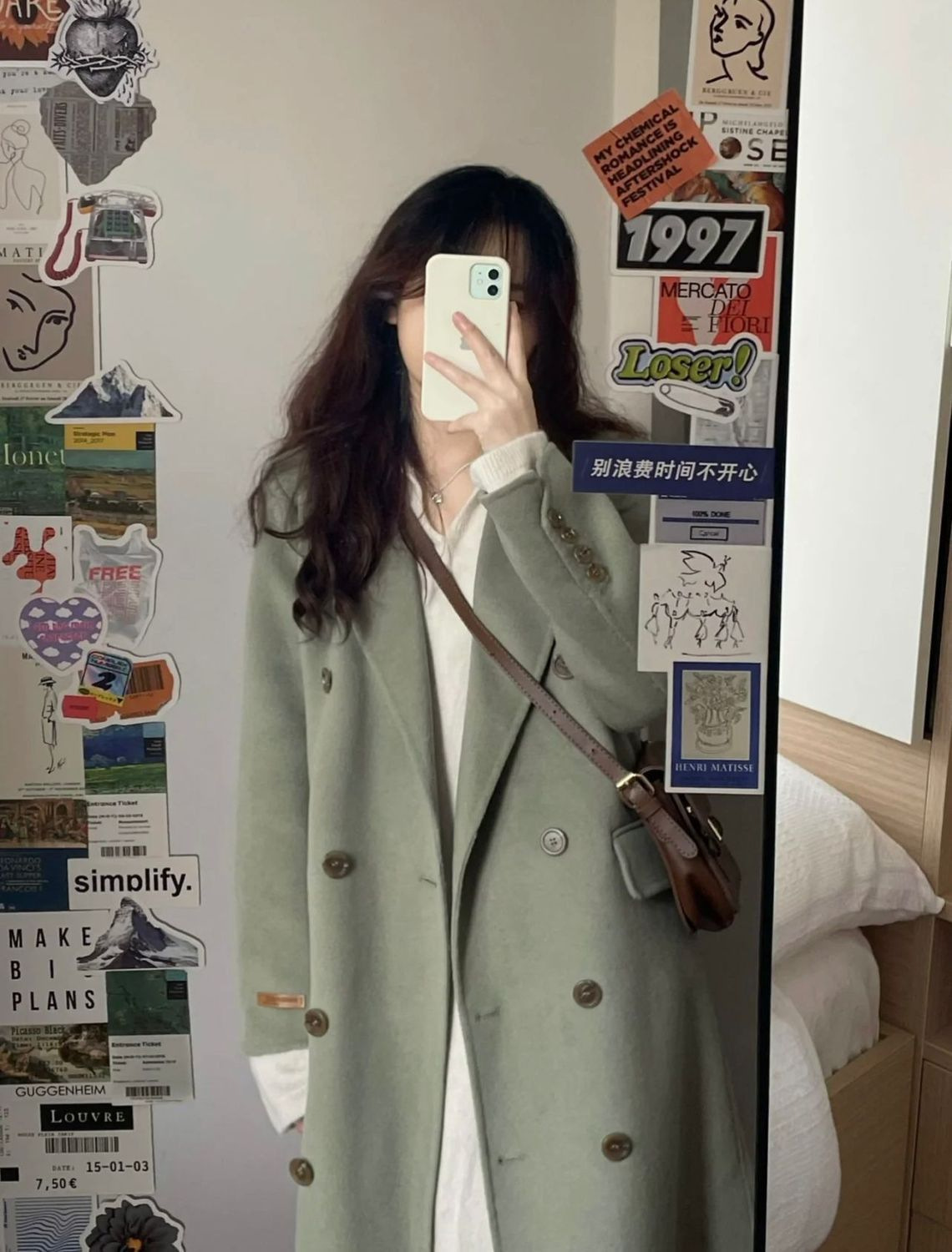 2024 겨울 새 코트 코트 여자 한국 스타일 게으른 스타일 말차 컬러 모직 중간 길이의 모직 코트 코트스토어 가기