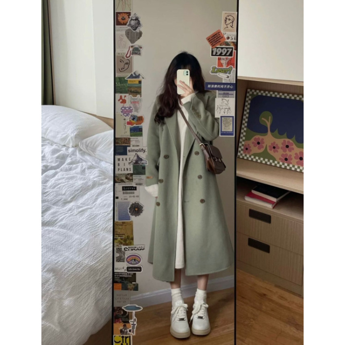 2024 겨울 새 코트 코트 여자 한국 스타일 게으른 스타일 말차 컬러 모직 중간 길이의 모직 코트 코트
