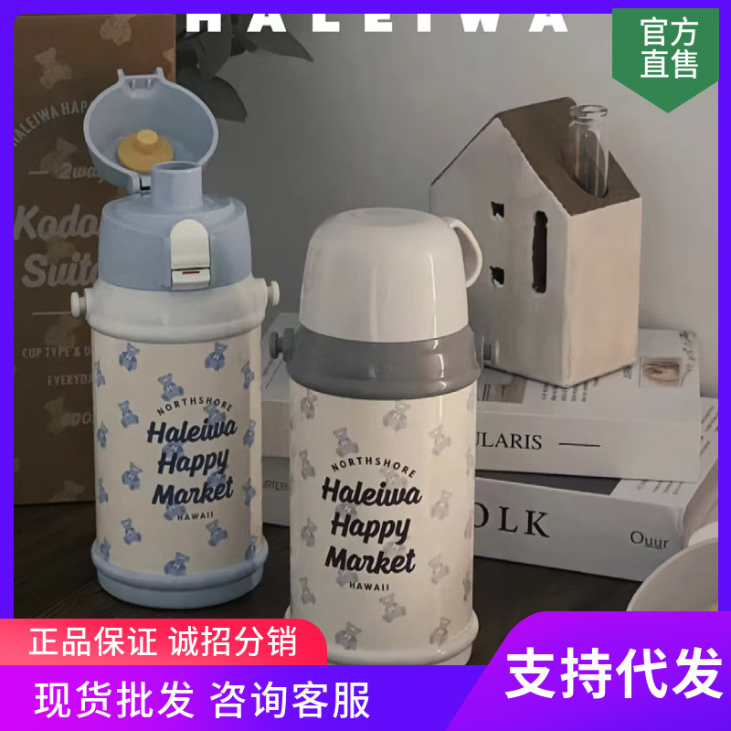 Haleiwa 어린이 보온병 컵 316 스테인레스 스틸 물 컵 대용량 물병 짚 학교 컵 전체 인쇄 곰 새스토어 가기