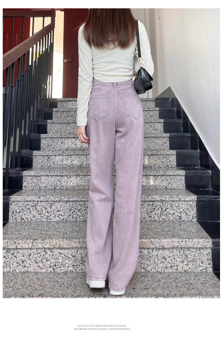 오래 된 보라색 스트레이트 청바지 여성의 봄 높은 허리 느슨한 학생 슬리밍 디자인 센스 드레이핑 넓은 다리 바닥 바지