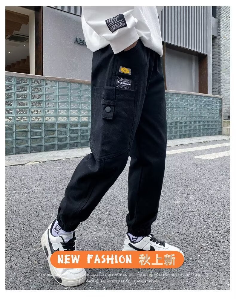 2024 새로운 소년 봄과 가을 바지 바지 포켓 크록 바지 캐주얼 스포츠 중 큰 어린이 가을 유행 바지