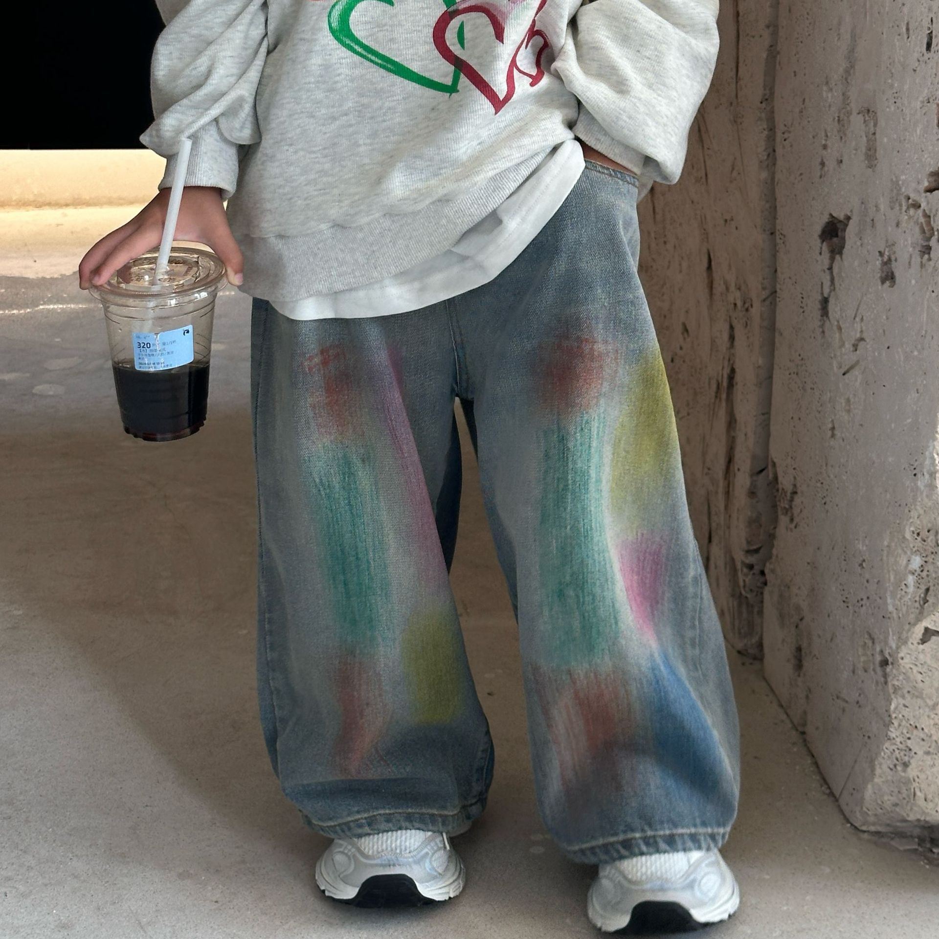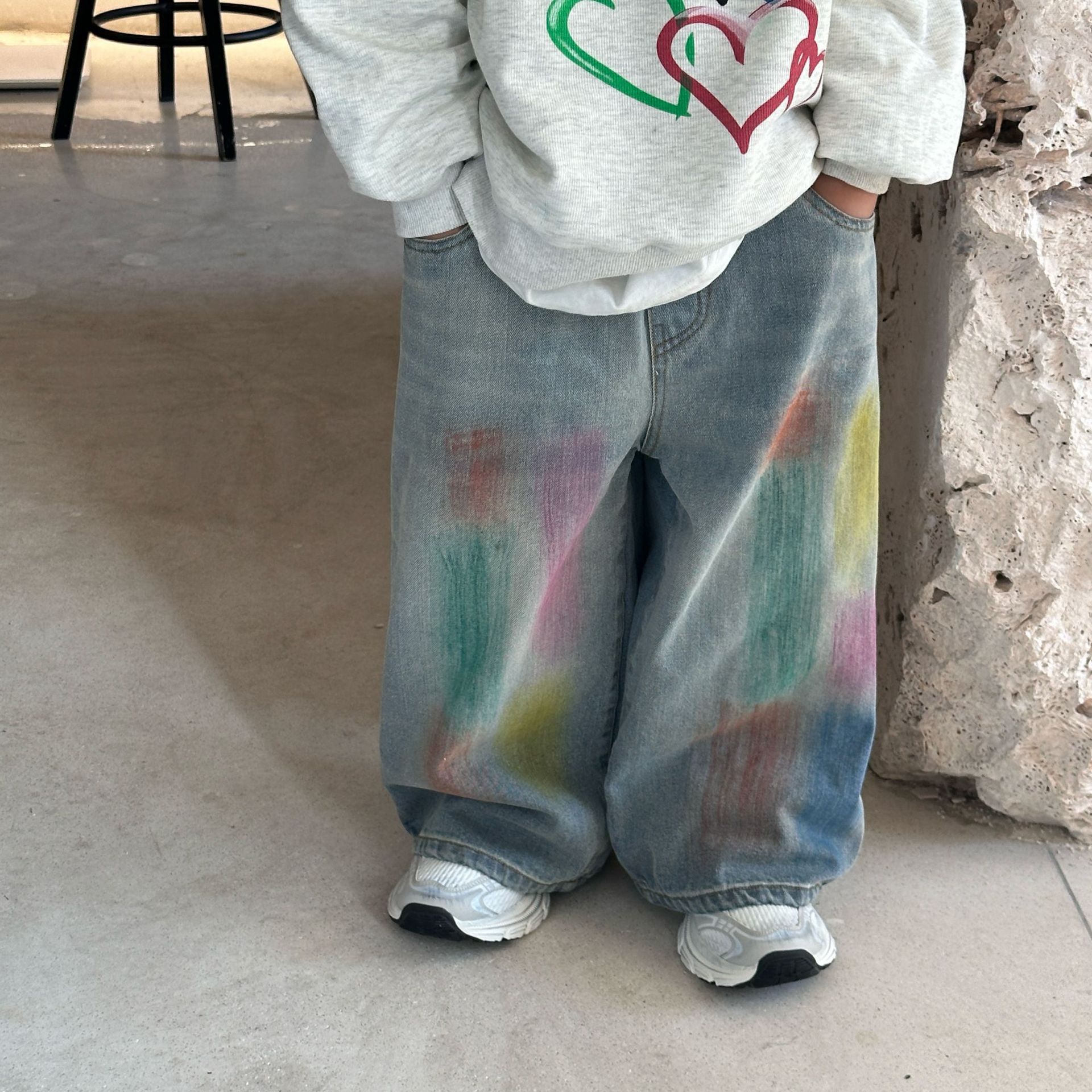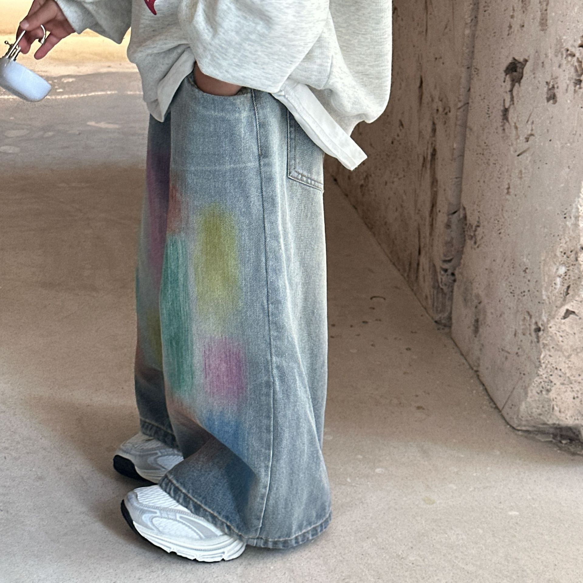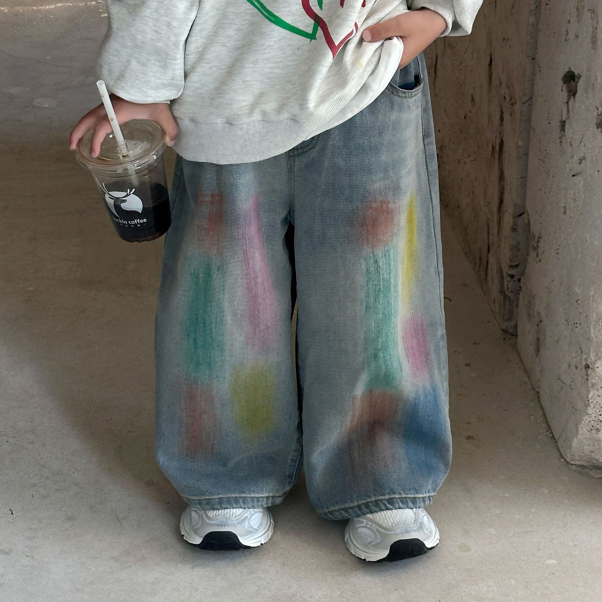 2024 가을 새로운 어린이 청바지 한국 스타일 유행 수제 페인트 데님 남학생과 여자를위한 바지스토어 가기