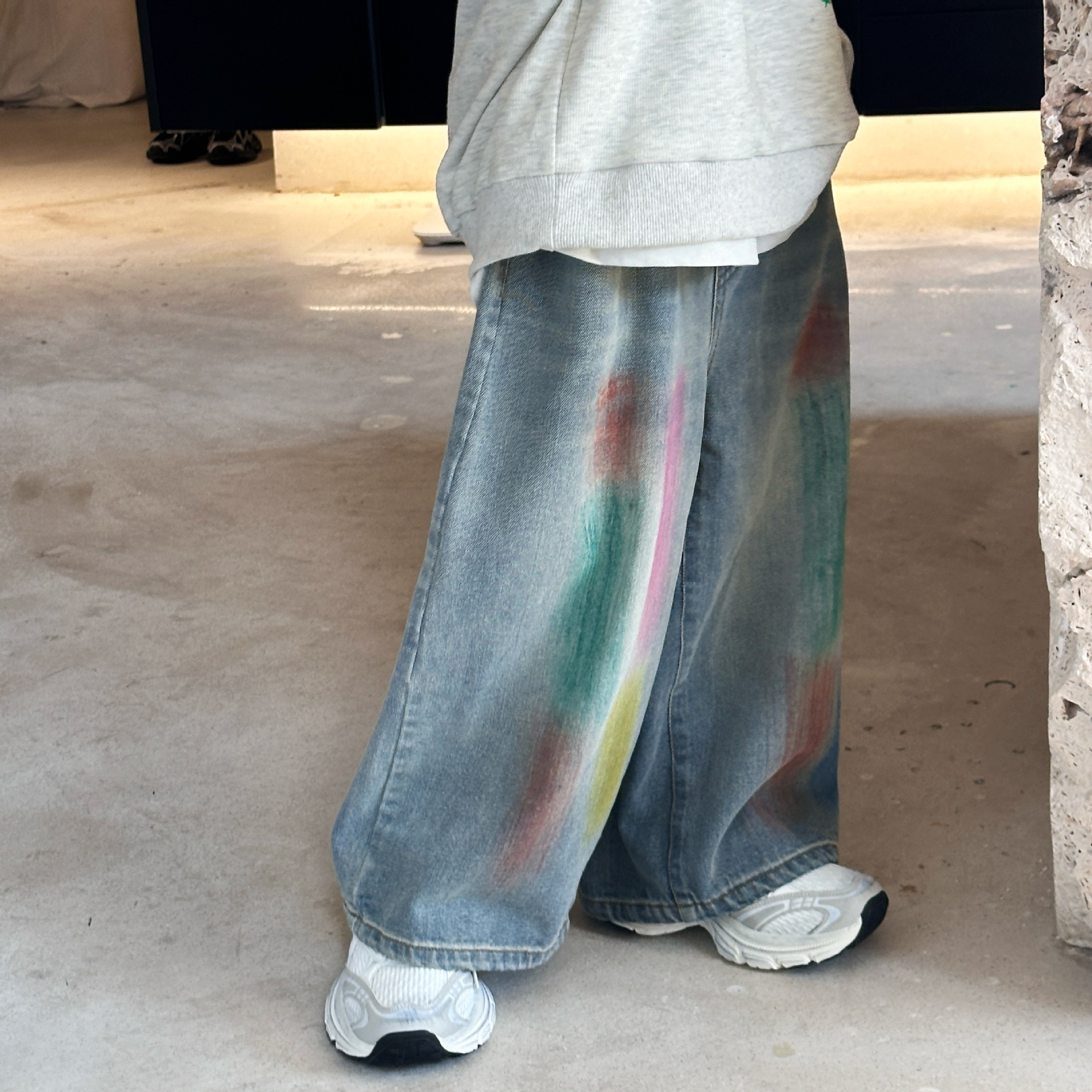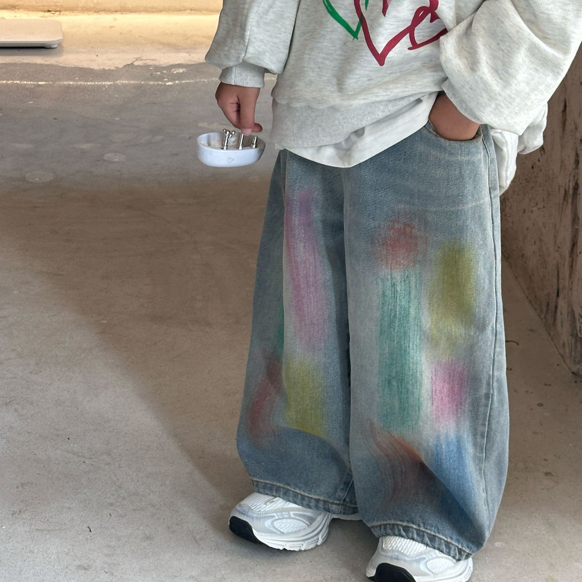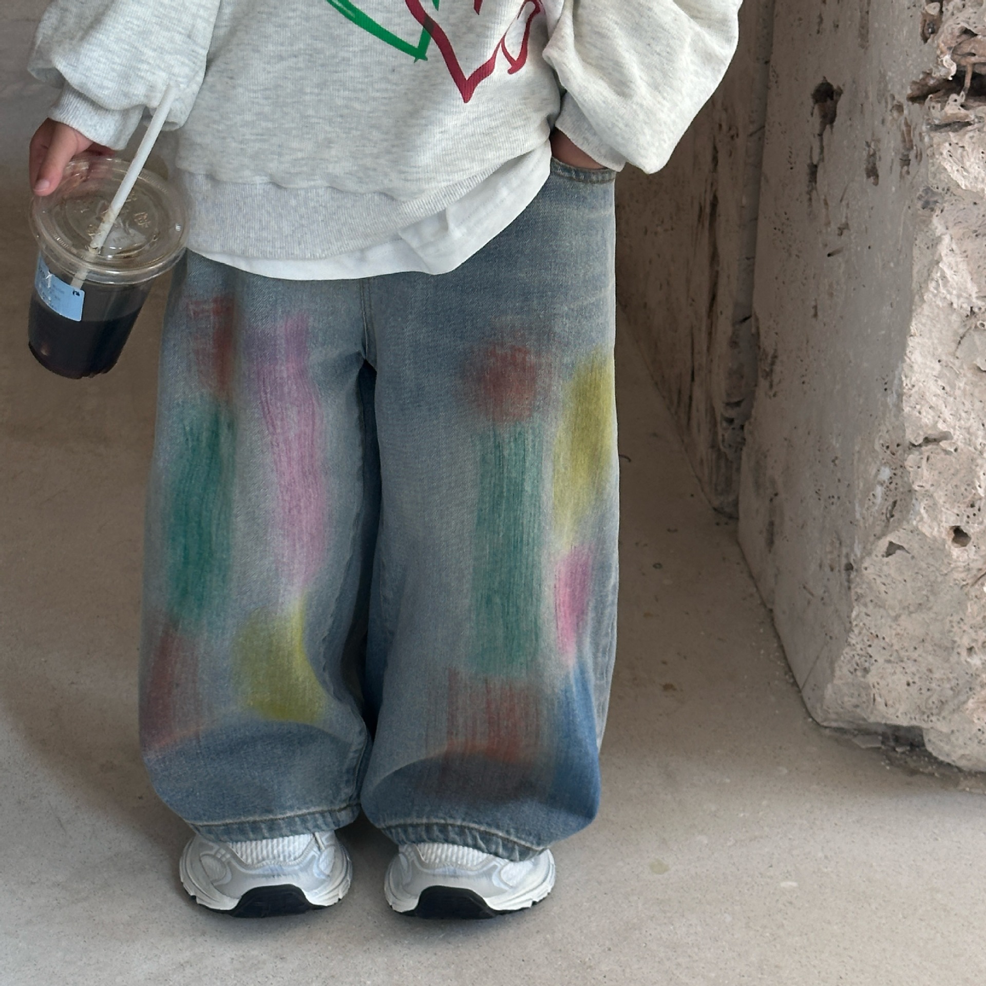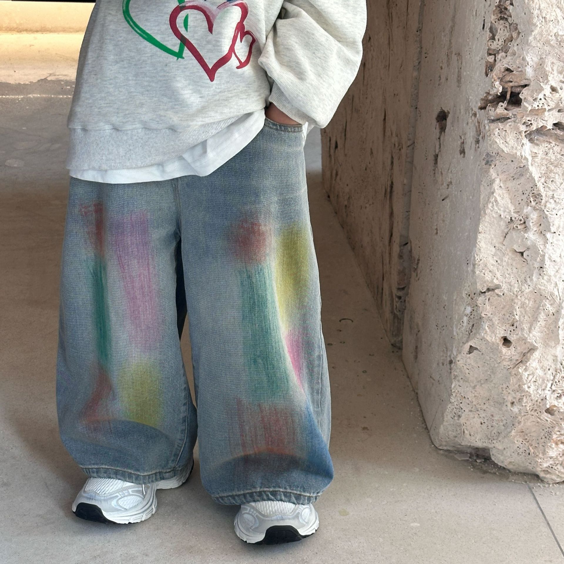 2024 가을 새로운 어린이 청바지 한국 스타일 유행 수제 페인트 데님 남학생과 여자를위한 바지스토어 가기