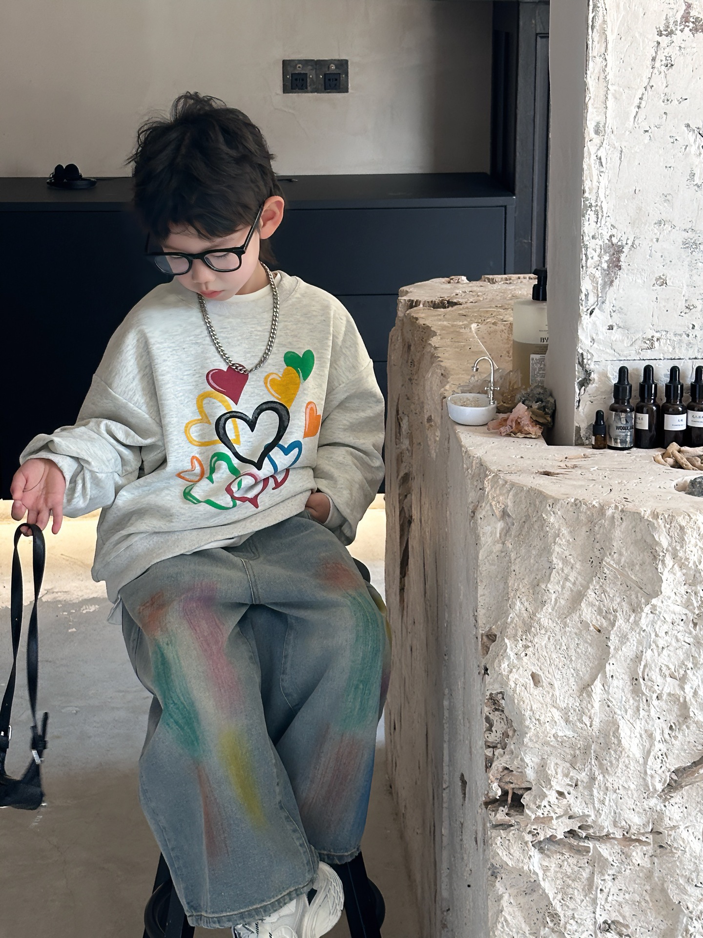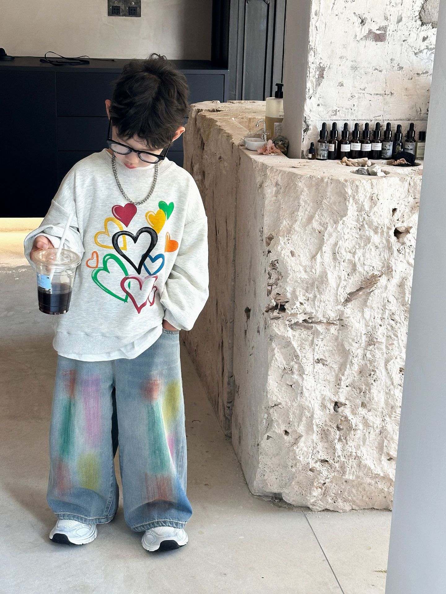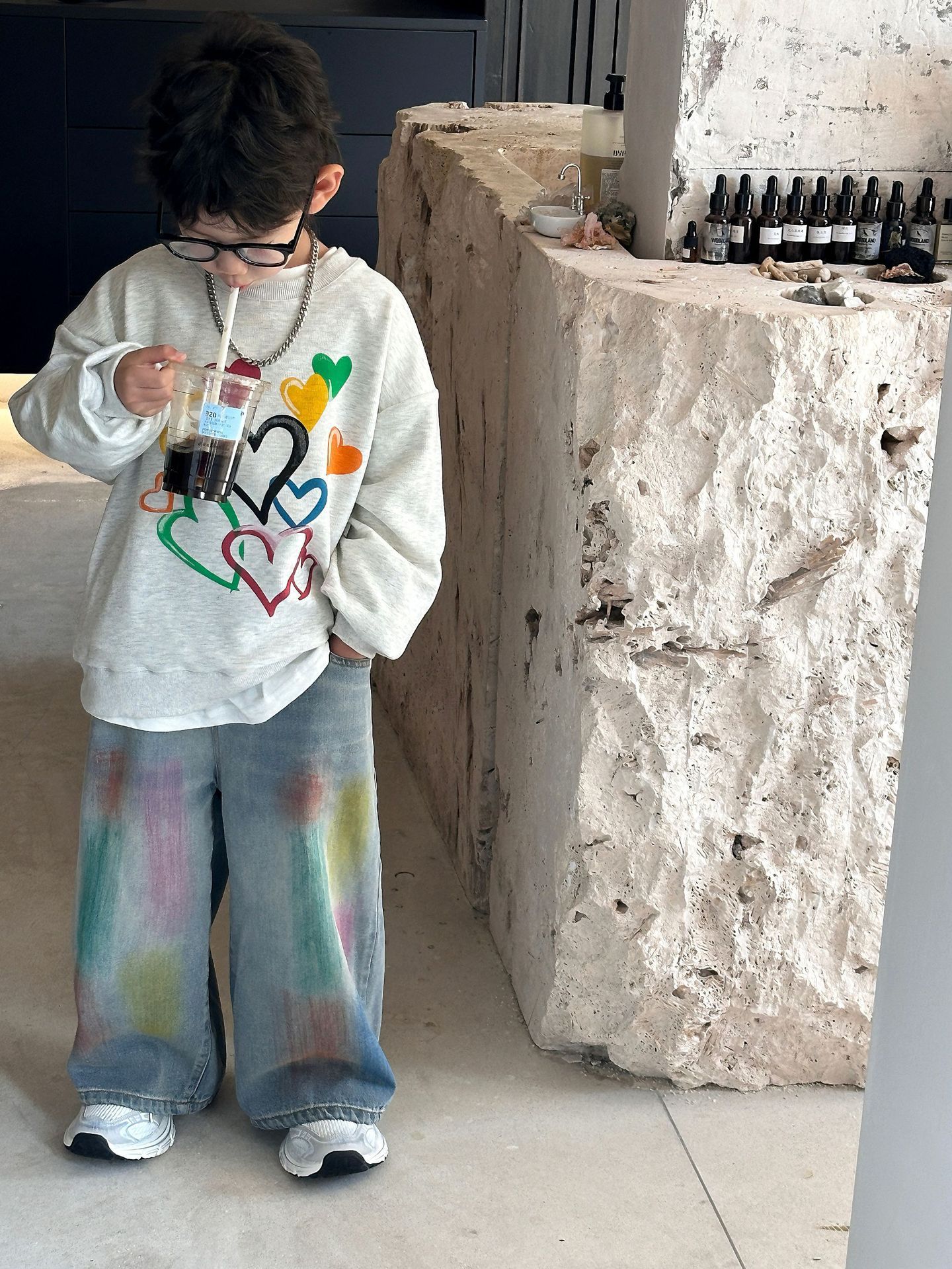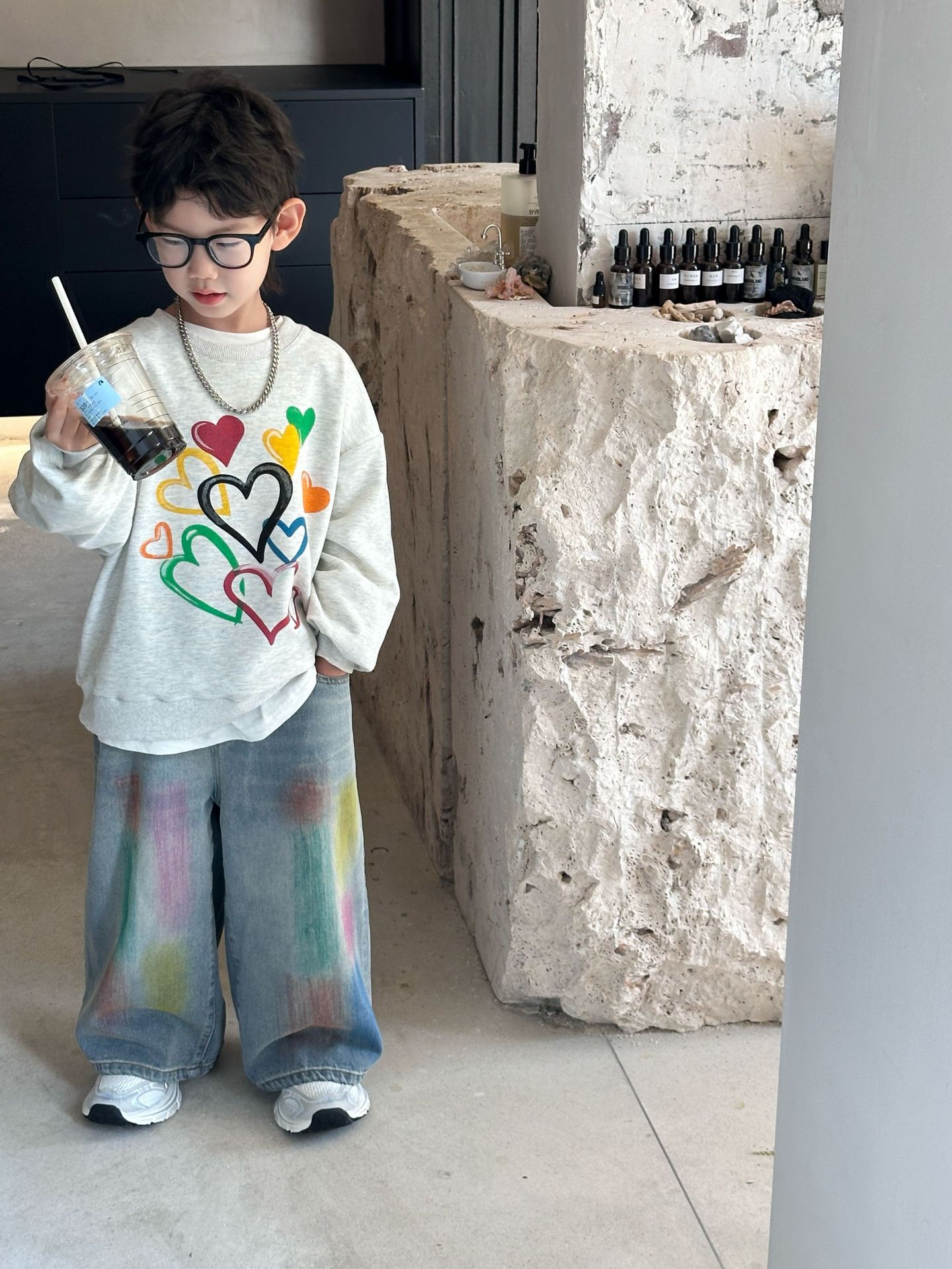 2024 가을 새로운 어린이 청바지 한국 스타일 유행 수제 페인트 데님 남학생과 여자를위한 바지스토어 가기