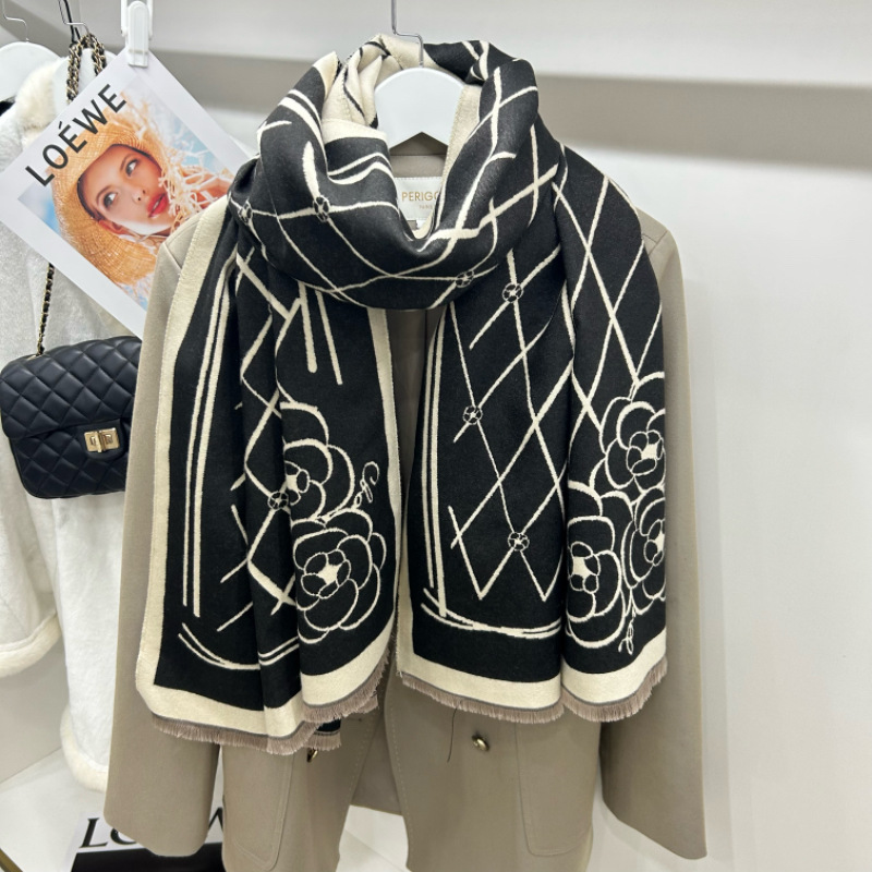 라이브 동백 모방 캐시미어 스카프 여자 겨울 하이 엔드 올 매치 두꺼운 따뜻한 목 에어컨 목도리 샤넬