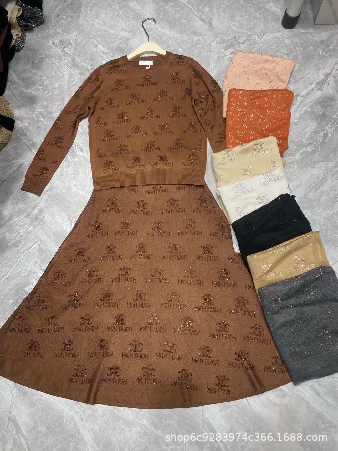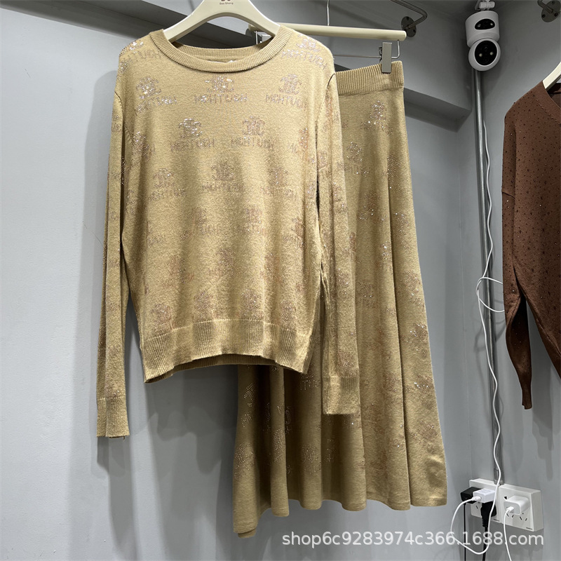 2024 가을과 겨울 새로운 둥근 목 모조 다이아몬드 문자 긴 소매 스웨터 풀오버 투피스 니트 스커트 세트 여성스토어 가기