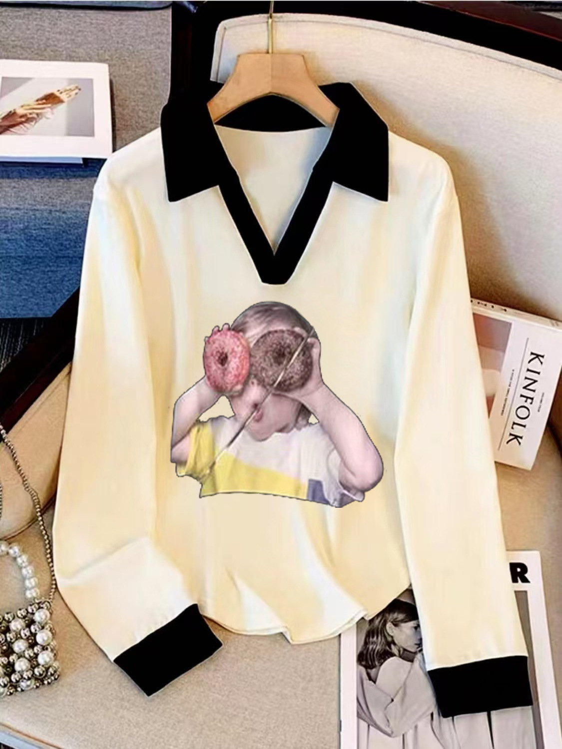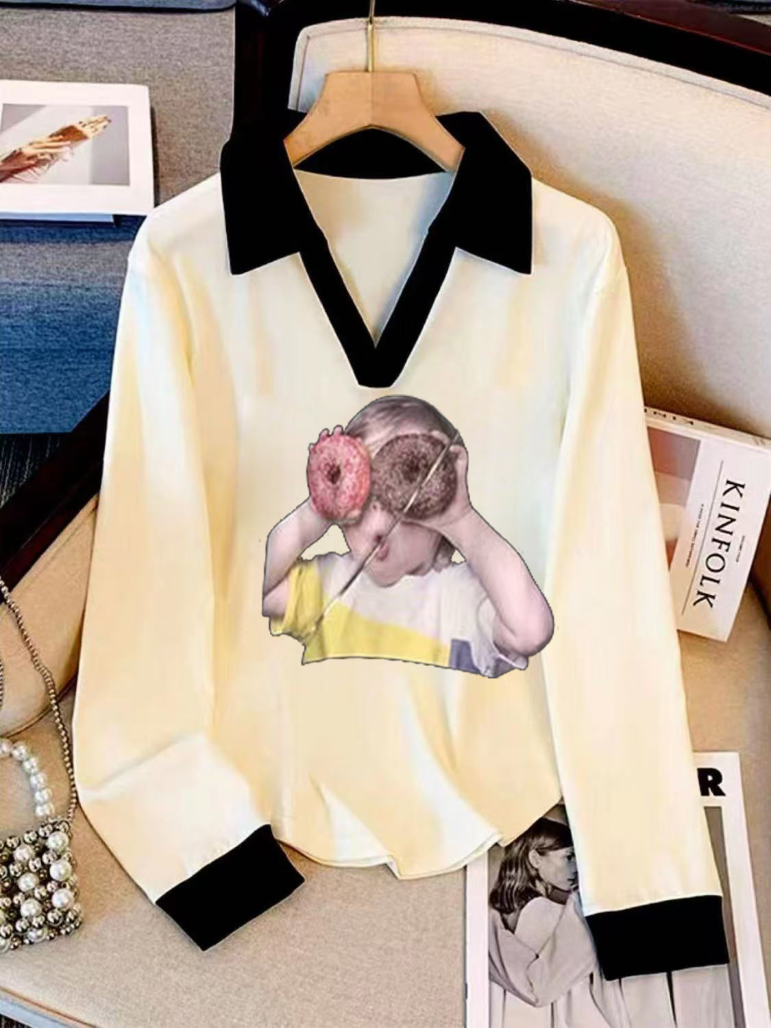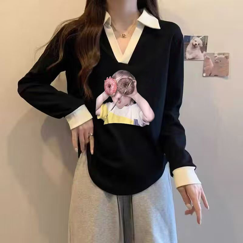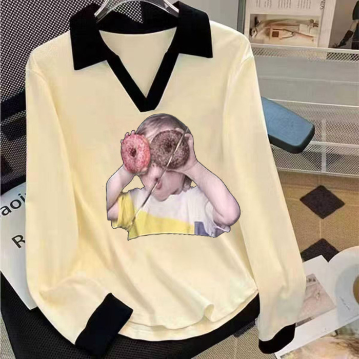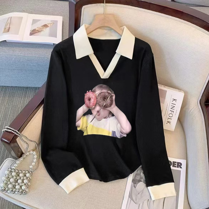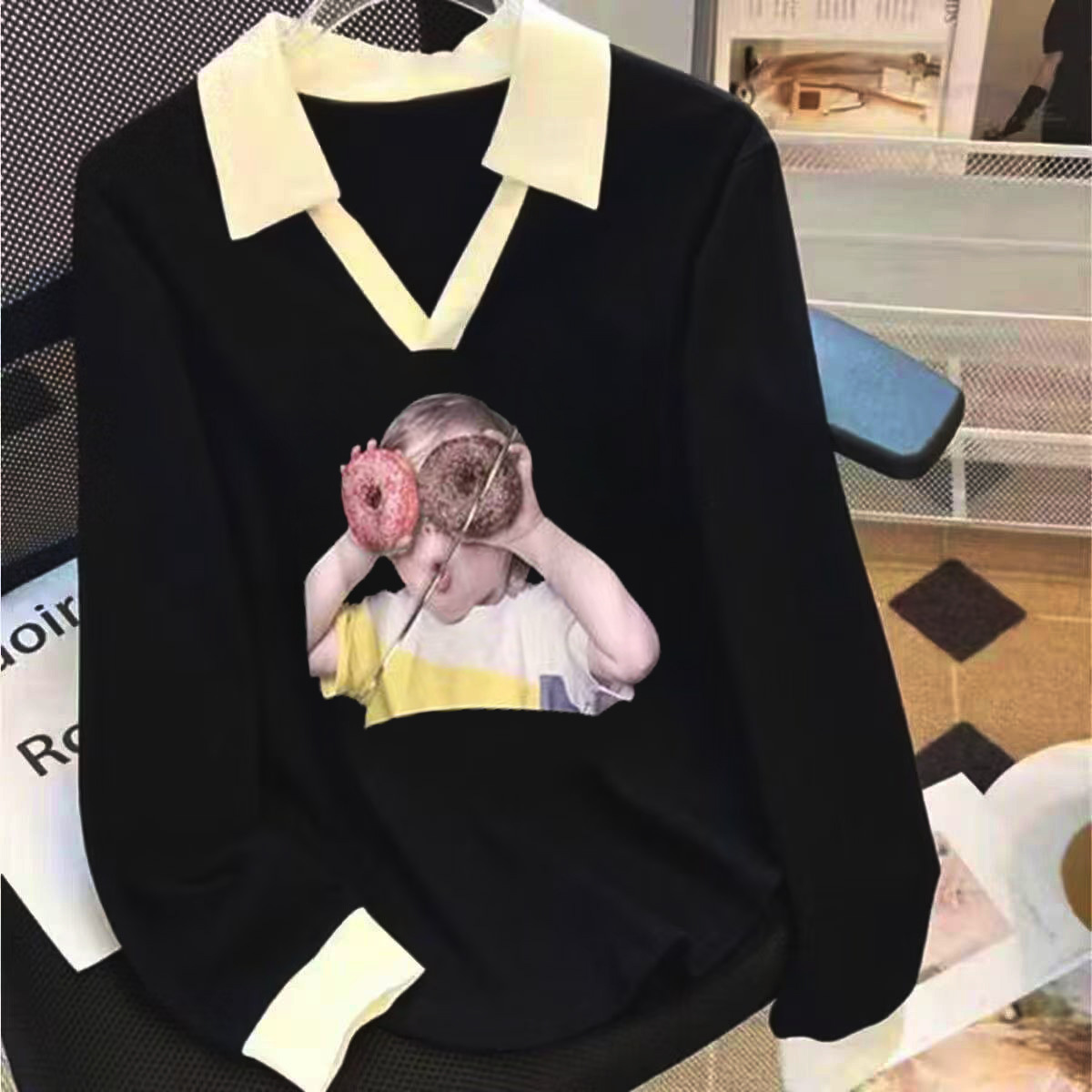 1.00 kg-150.00 kg 플러스 사이즈 여성의 봄과 가을 서양식 연령 감소 긴팔 티셔츠 여성용 통통녀 벨리 커버 슬림 폴로 칼라 탑