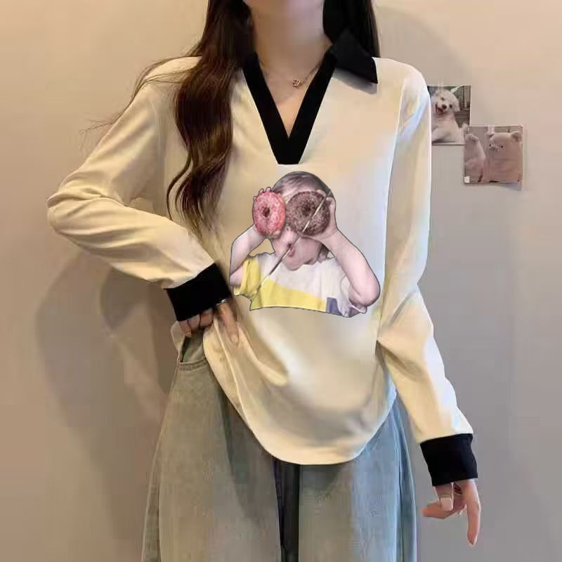 1.00 kg-150.00 kg 플러스 사이즈 여성의 봄과 가을 서양식 연령 감소 긴팔 티셔츠 여성용 통통녀 벨리 커버 슬림 폴로 칼라 탑스토어 가기