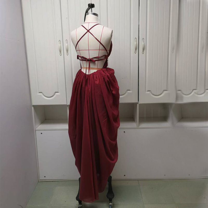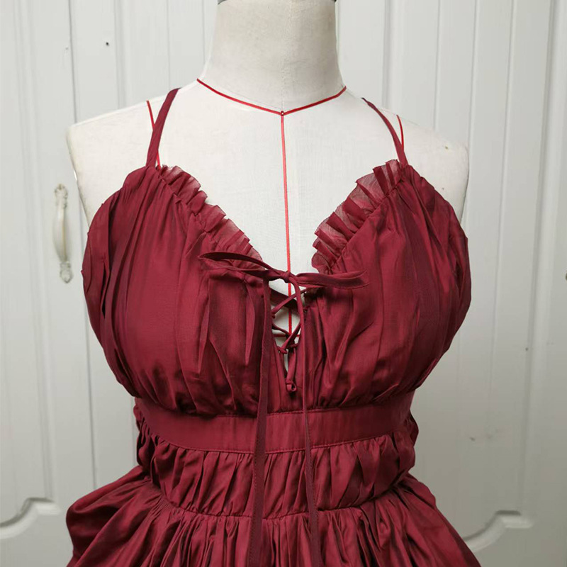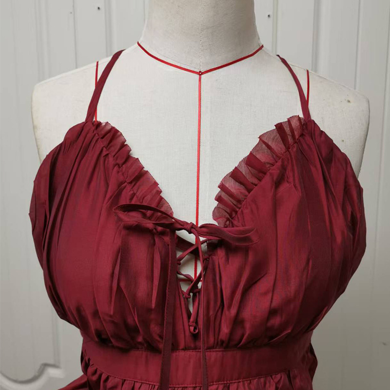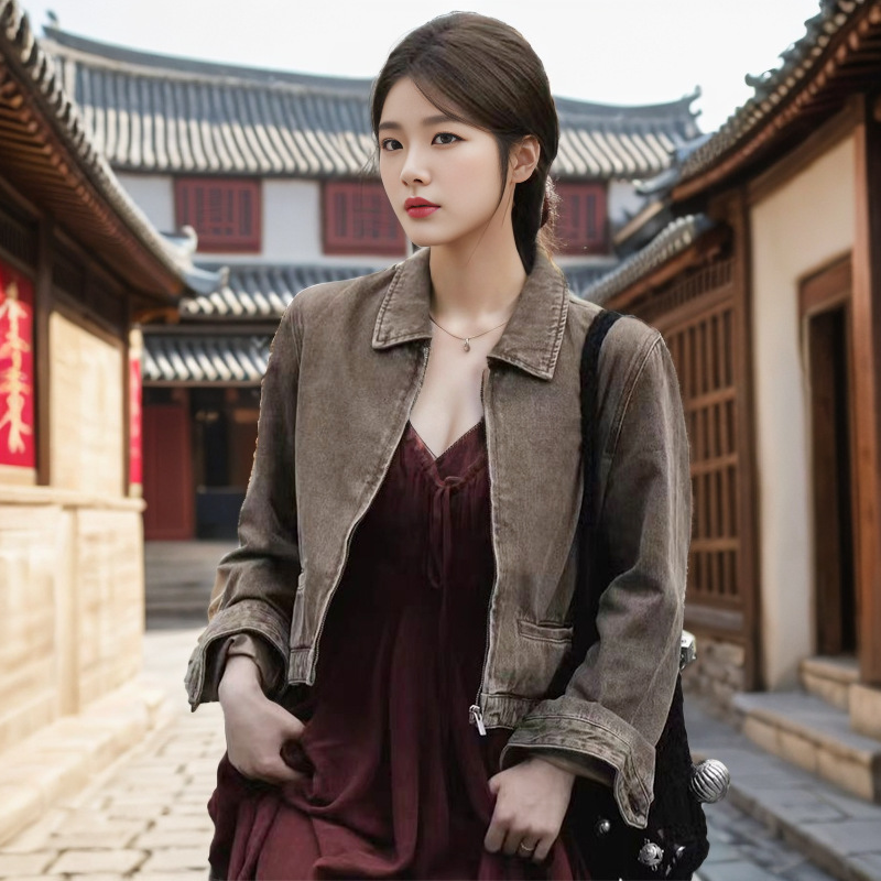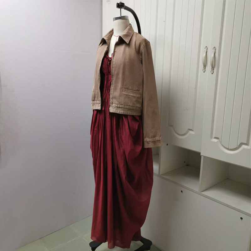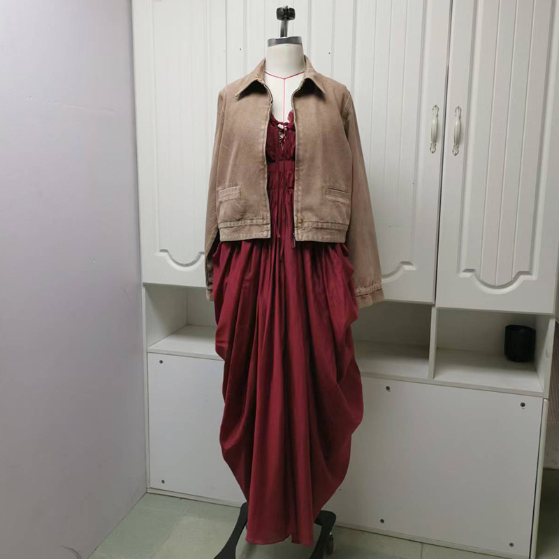 스타 같은 스타일 다크 브라운 빈티지 짧은 코트 버건디 긴 원피스 스트랩 원피스 우아한 세트 봄과 가을 여성스토어 가기
