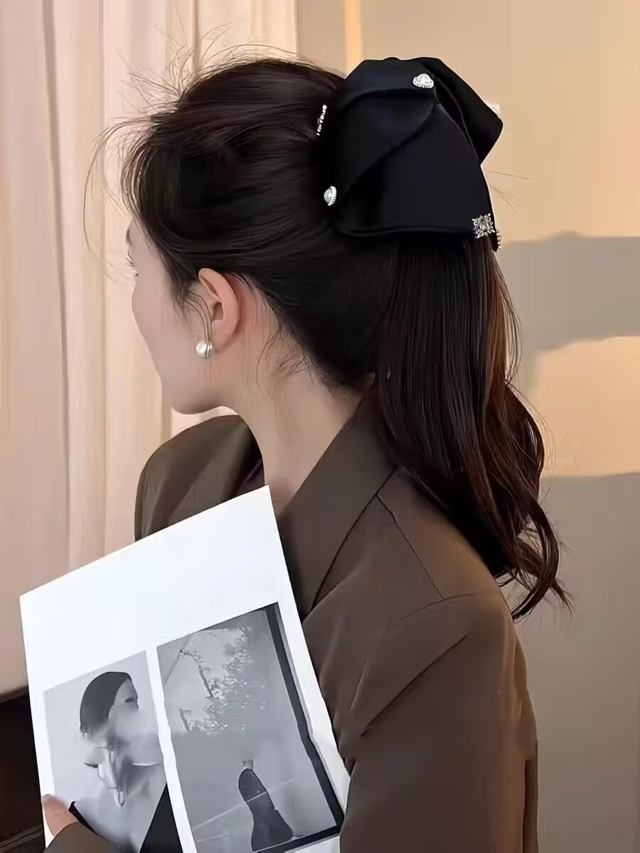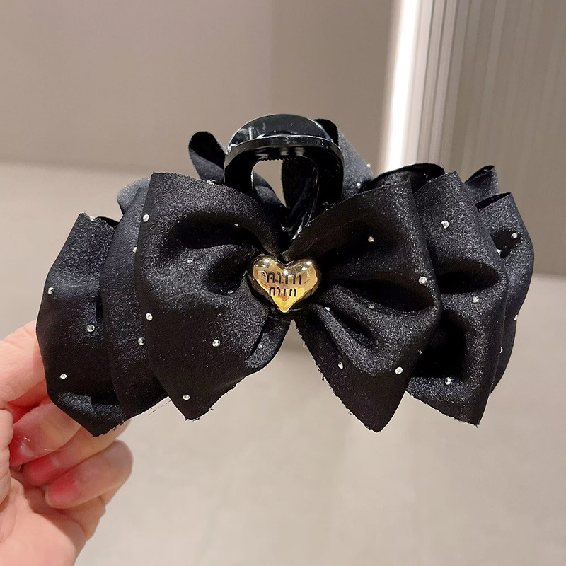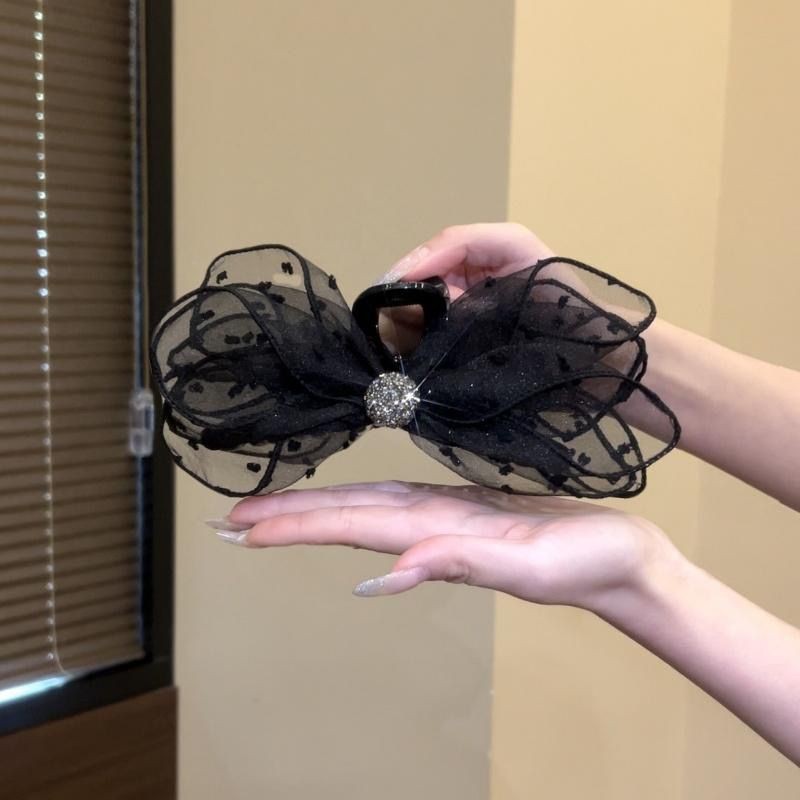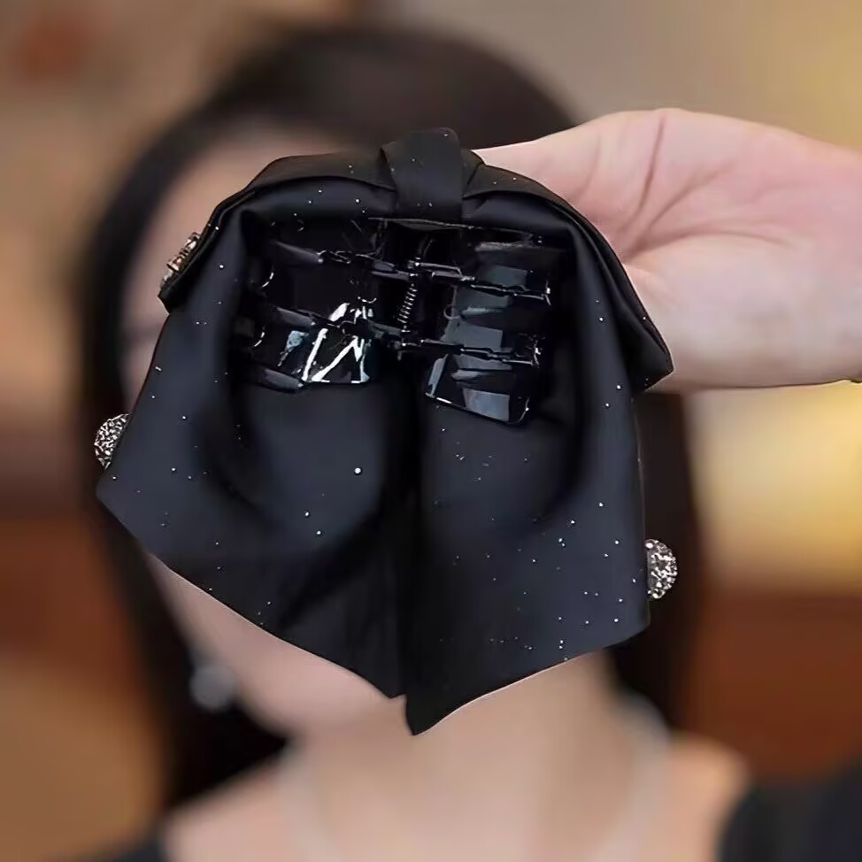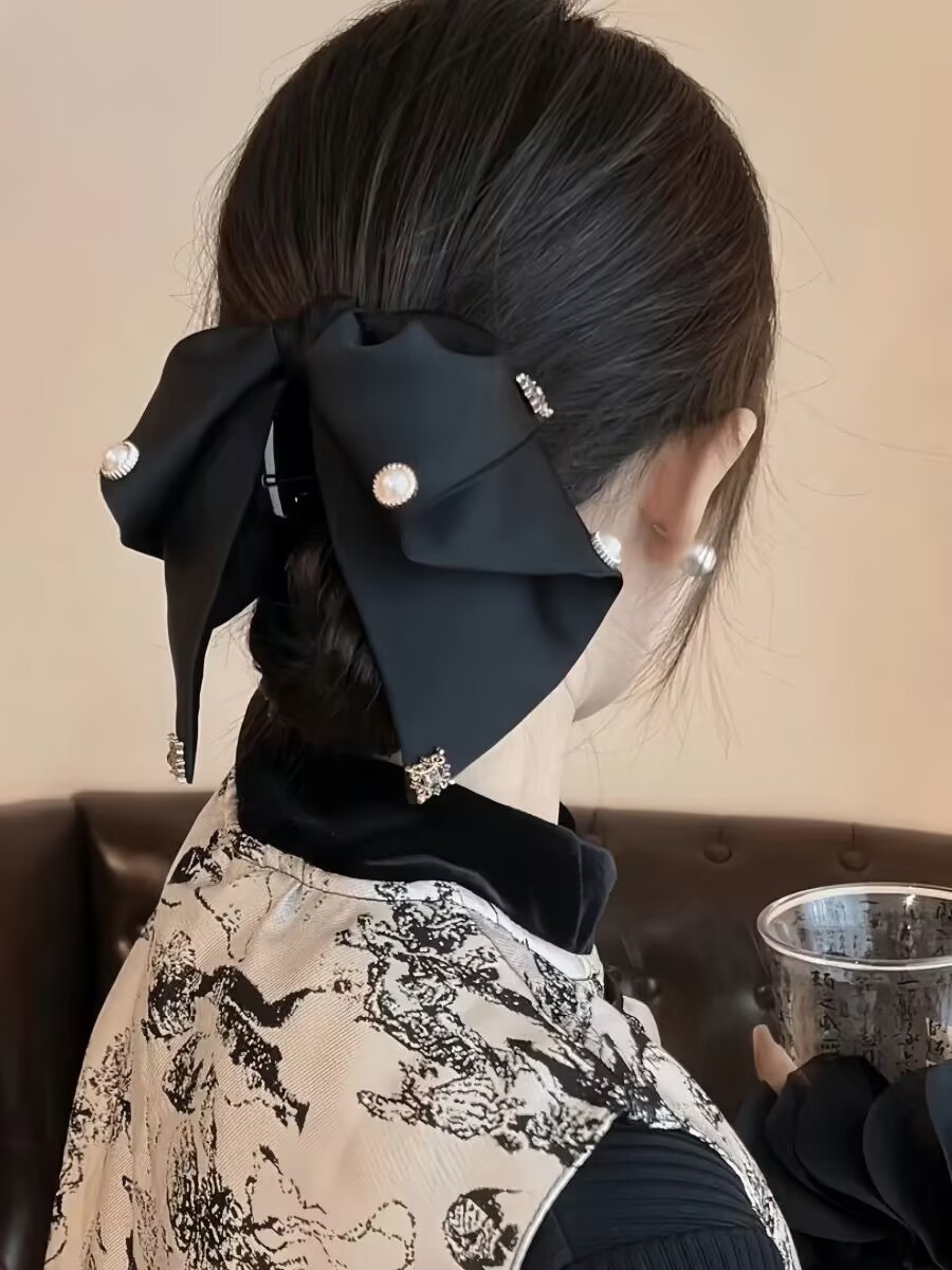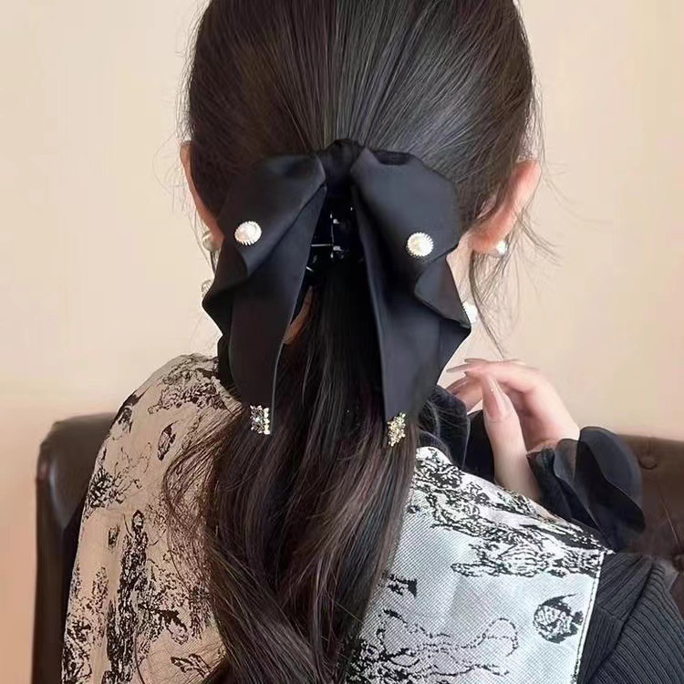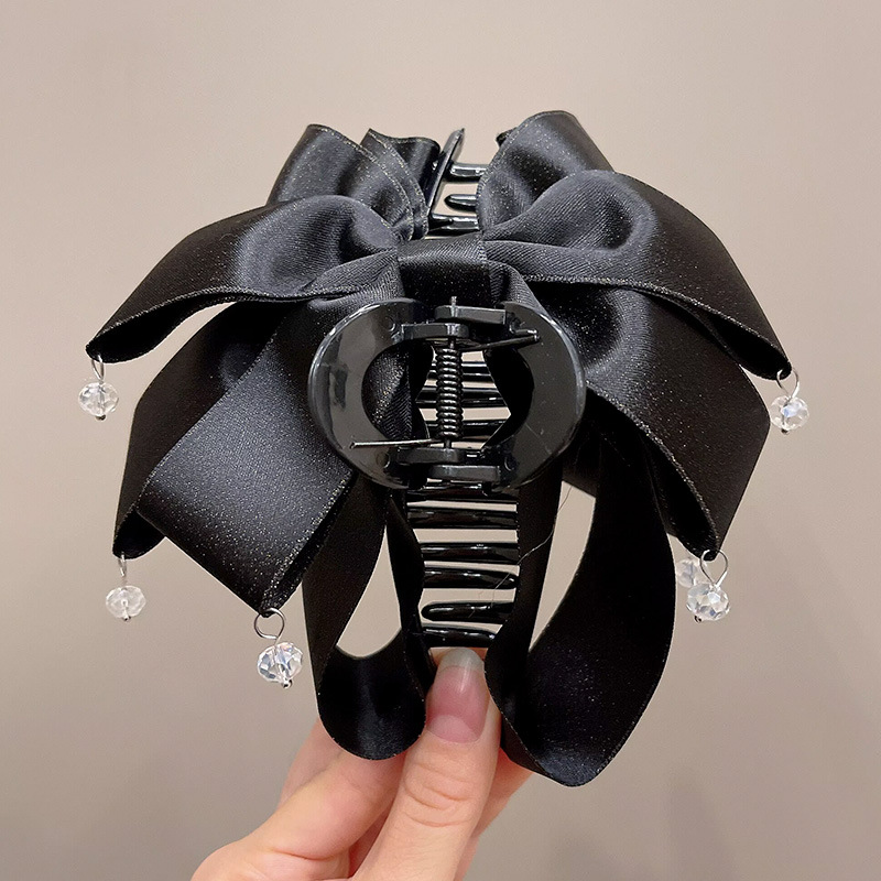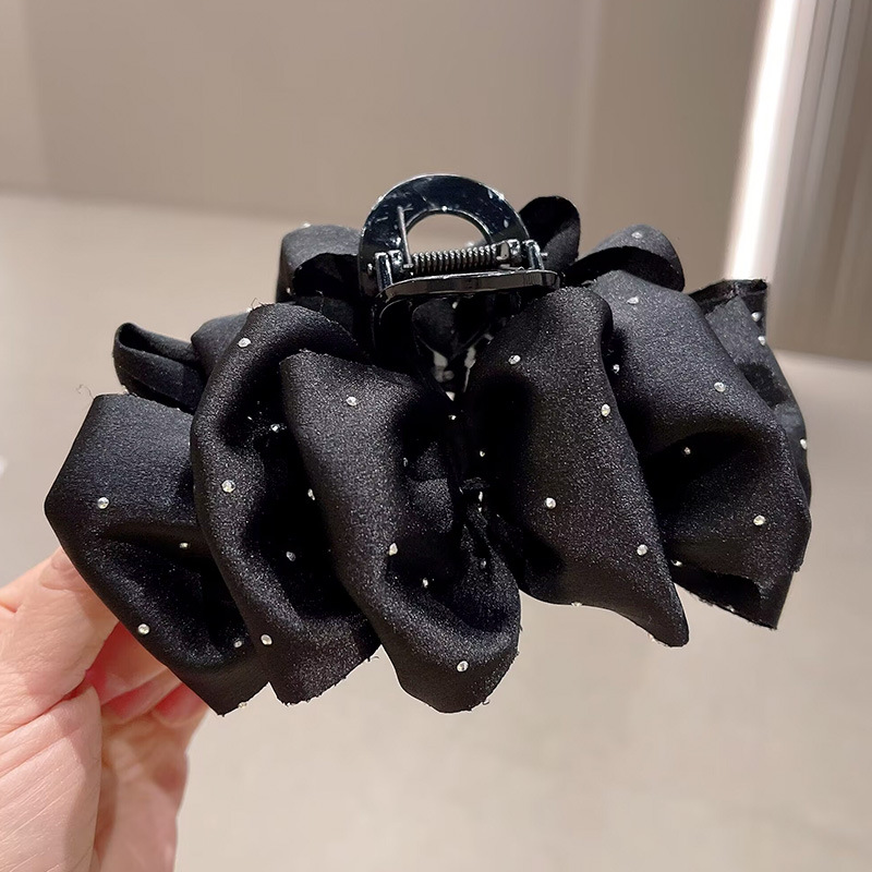 高级感缎面大号黑色蝴蝶结鲨鱼夹头饰方形钻后脑勺发夹抓夹女发卡