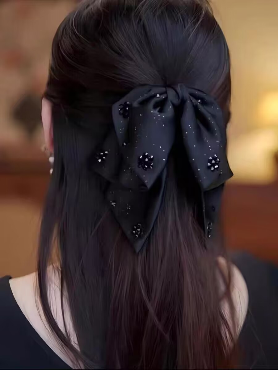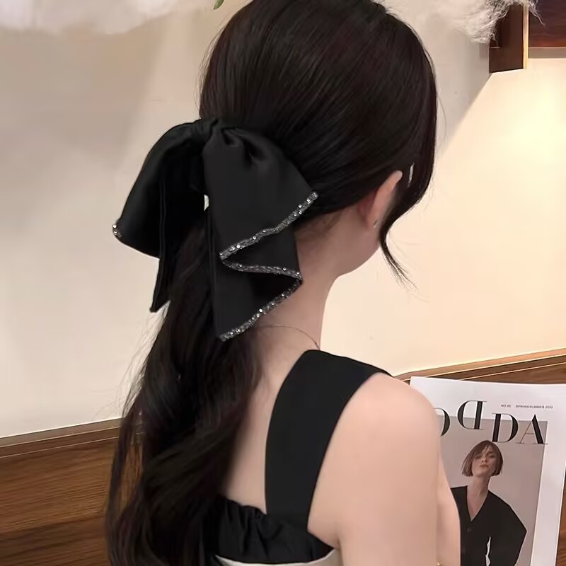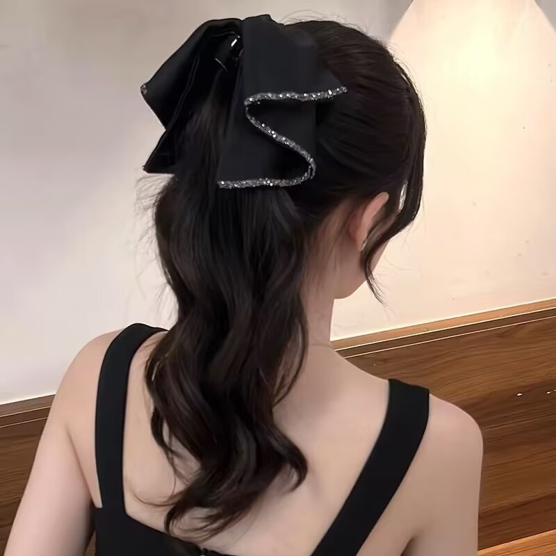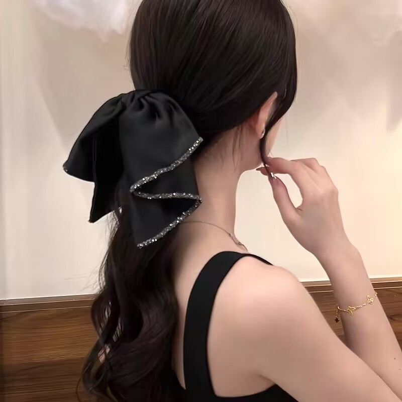 • 블랙 크리스탈 새틴 리본 포니테일 클립