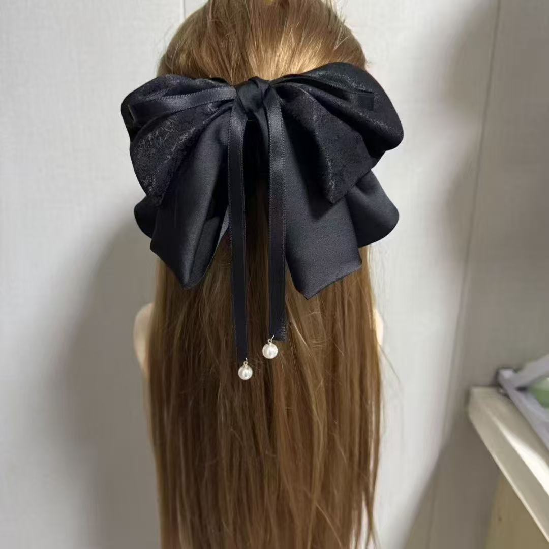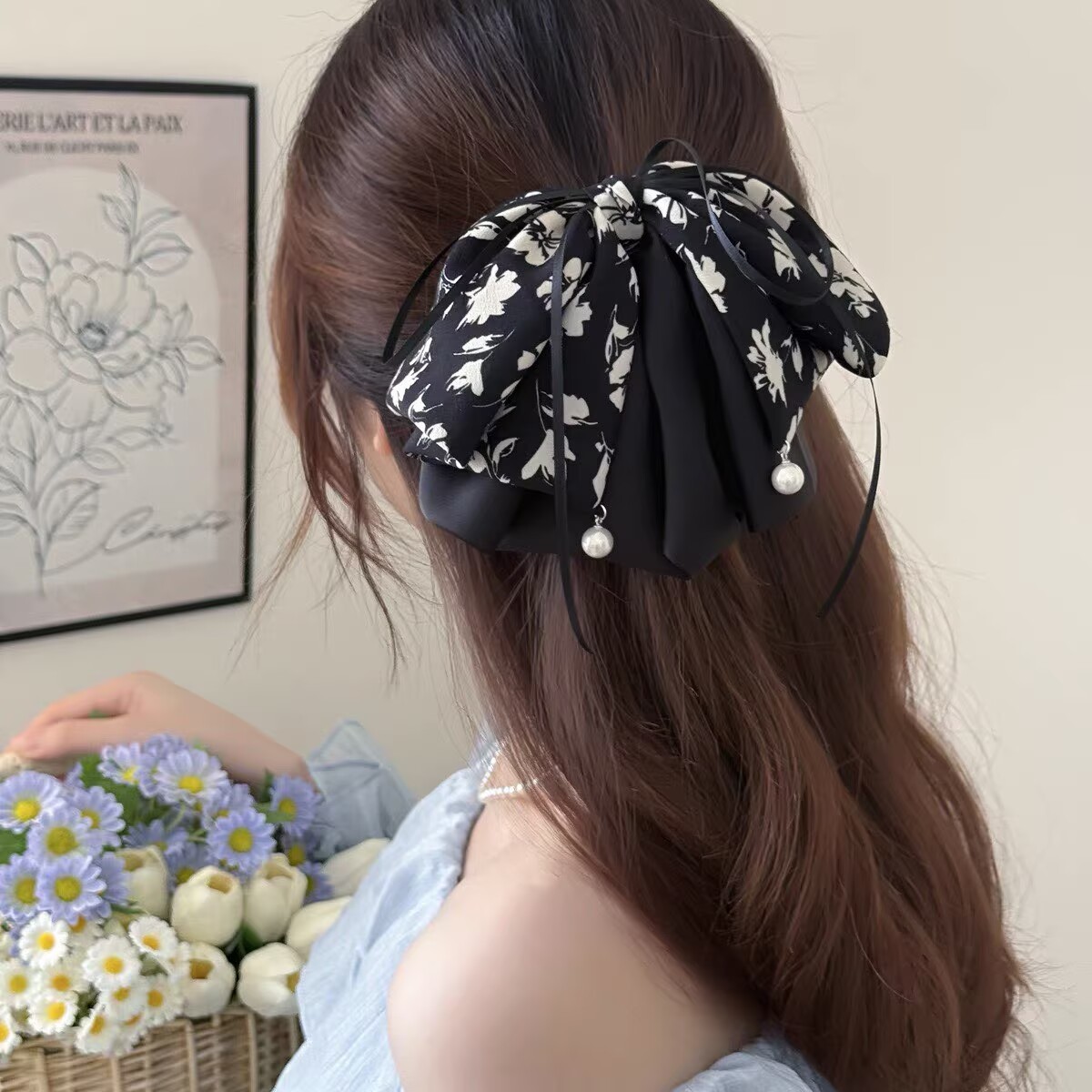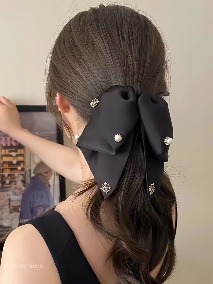 • 검정 구슬 장식 새틴 리본 포니테일 집게핀