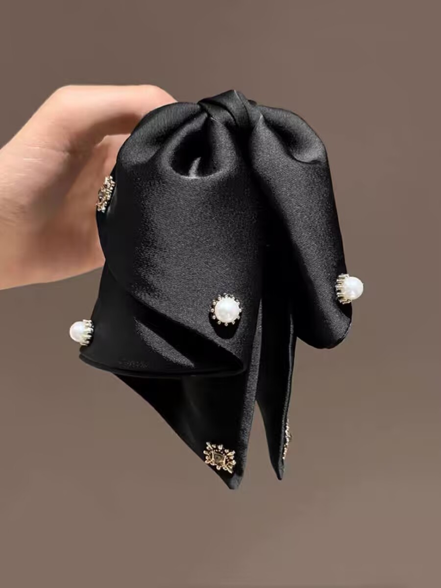 • 블랙 빈티지 진주 새틴 리본 포니테일 클립