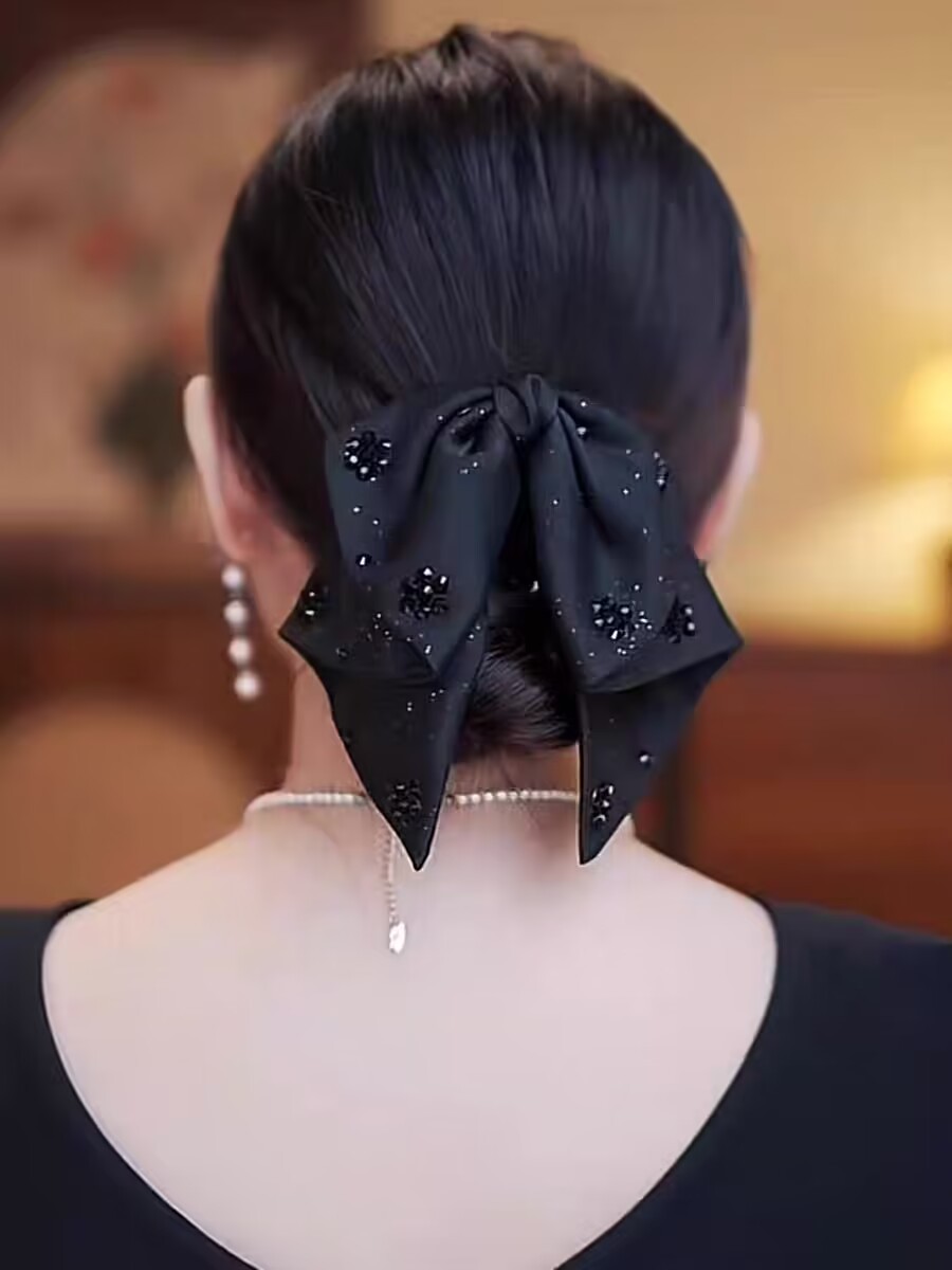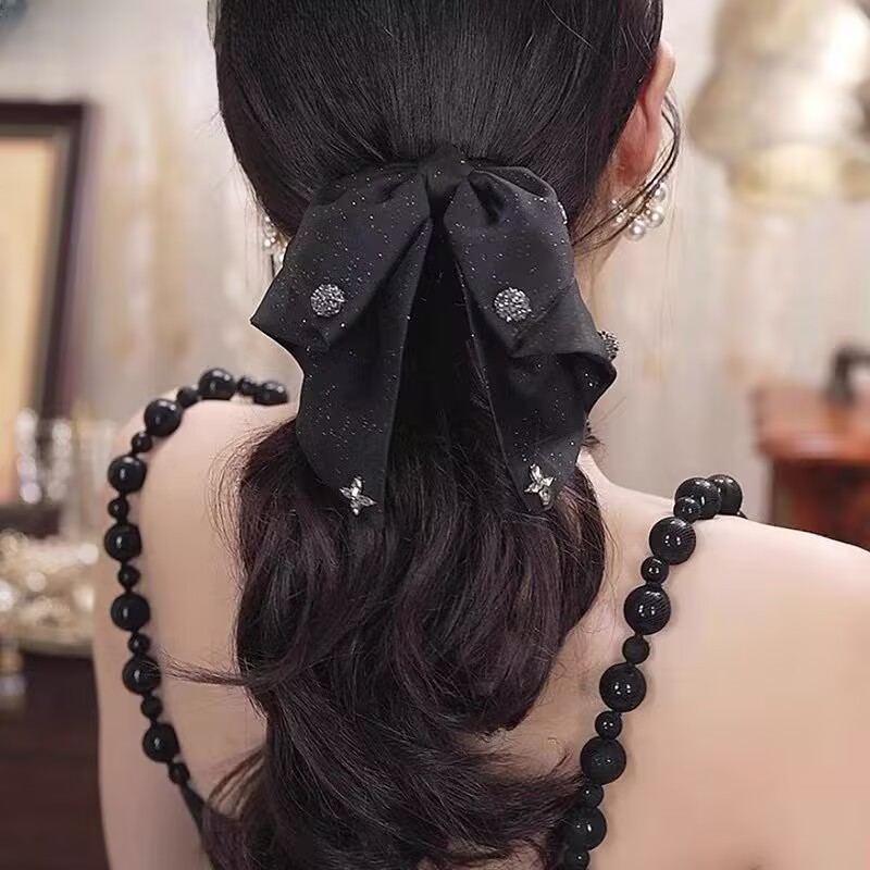 • 다크 나이트 블랙 리본 크리스탈 집게핀
