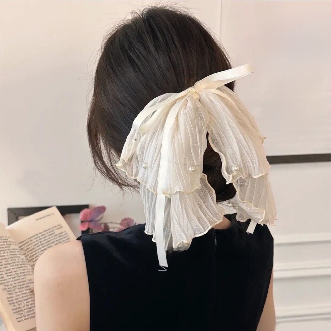 • 흰색 망사 진주 나비 클립 포니테일 집게핀