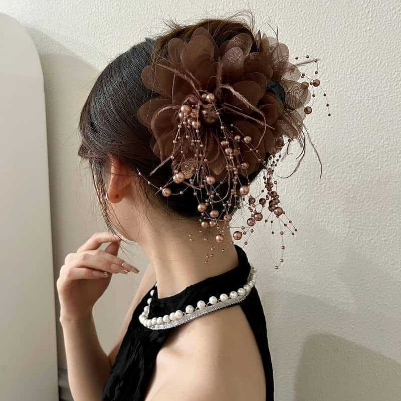 轻奢高级感咖色珍珠水钻抓夹女后脑勺盘发鲨鱼夹大号发夹头饰发卡