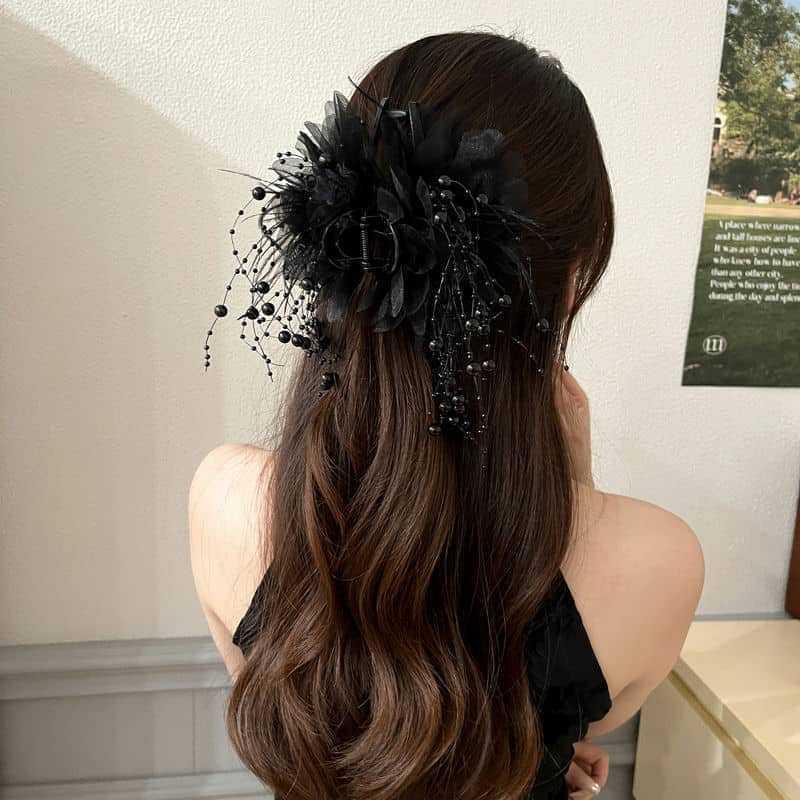 • 검정 망사 진주 나비 클립 포니테일 집게핀
