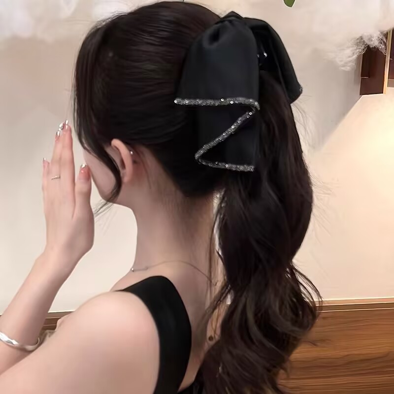 • 블랙 큐빅 장식 새틴 리본 포니테일 집게핀