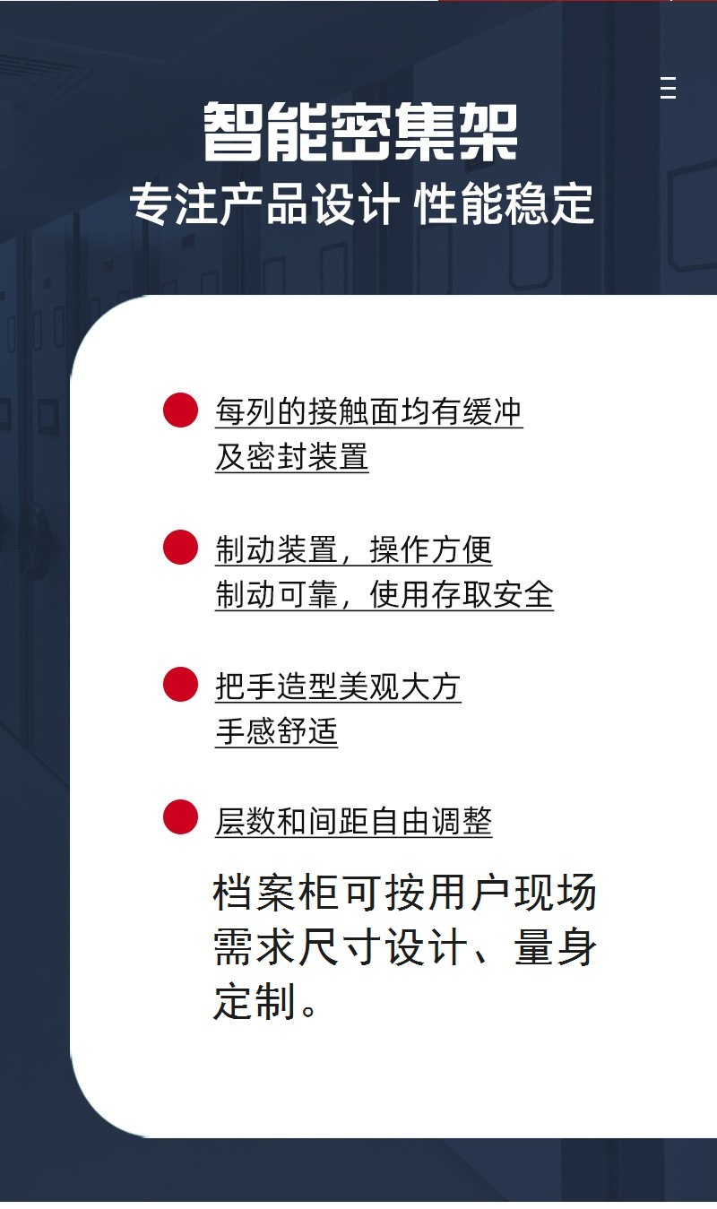 密集架可单列或多列一起在导轨上行走,每列具有手刹制动装置(自锁柄)。自锁柄在OFF位置时,架体不能移动,在ON位置时,架体可移动,每列架体的侧面板上有标签框,移动列底务上有防倒装置,每个组合箱体的前后各一列装有总锁,用于整体的锁闭,起到保密作用,导轨的端部安装限位装置。