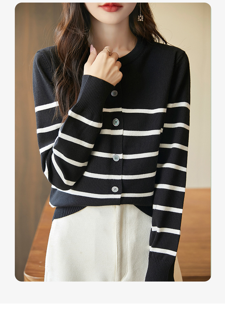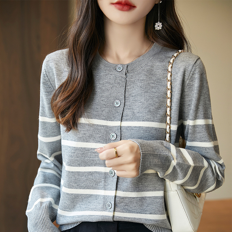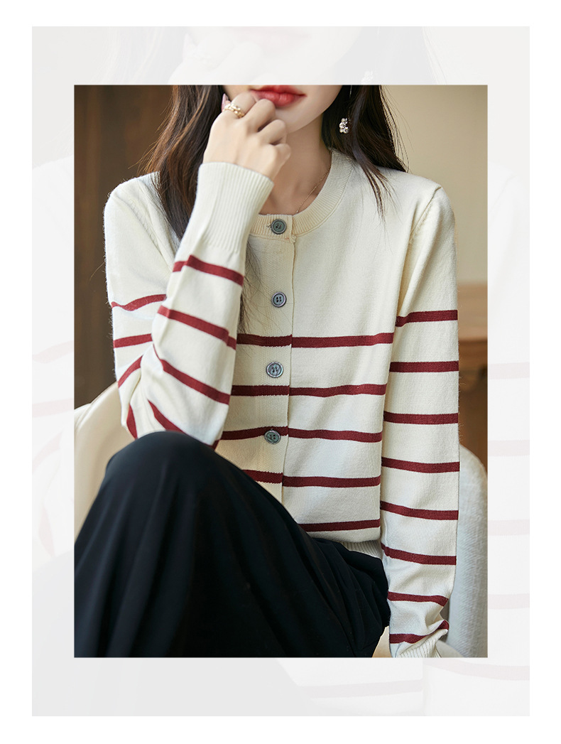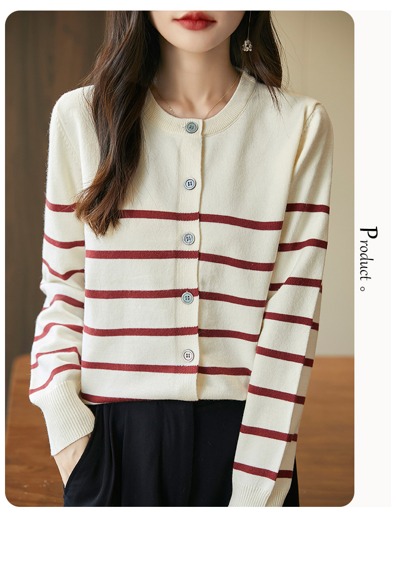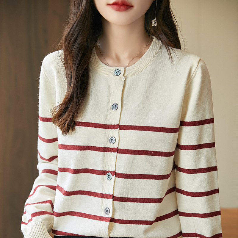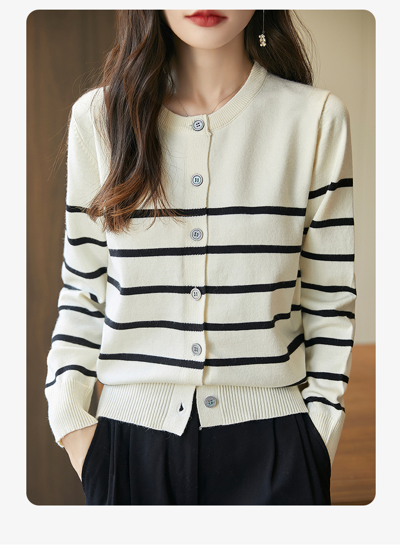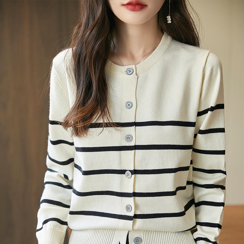 프렌치 롱 슬리브 스트라이프 크루 넥 니트 싱글 로우 멀티 버튼 카디건 여성용 초가을 통근 스웨터 여성용 코트 탑