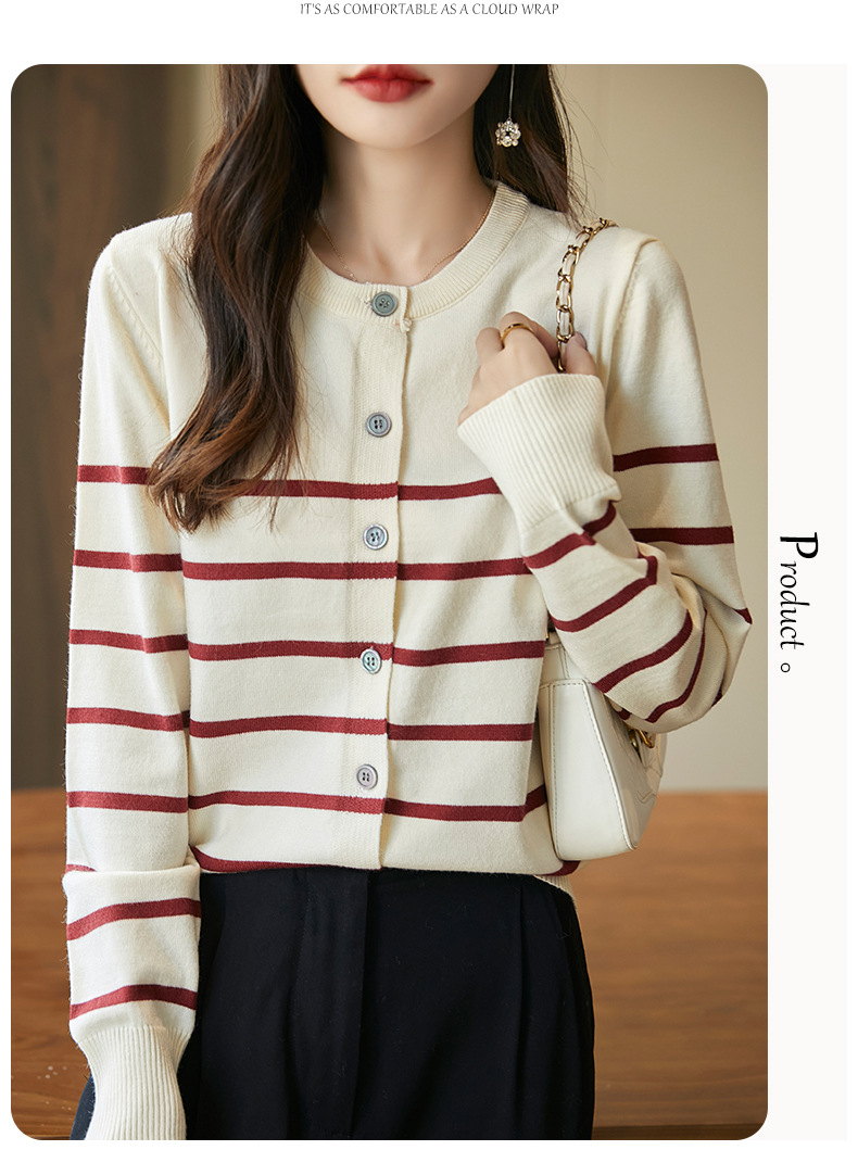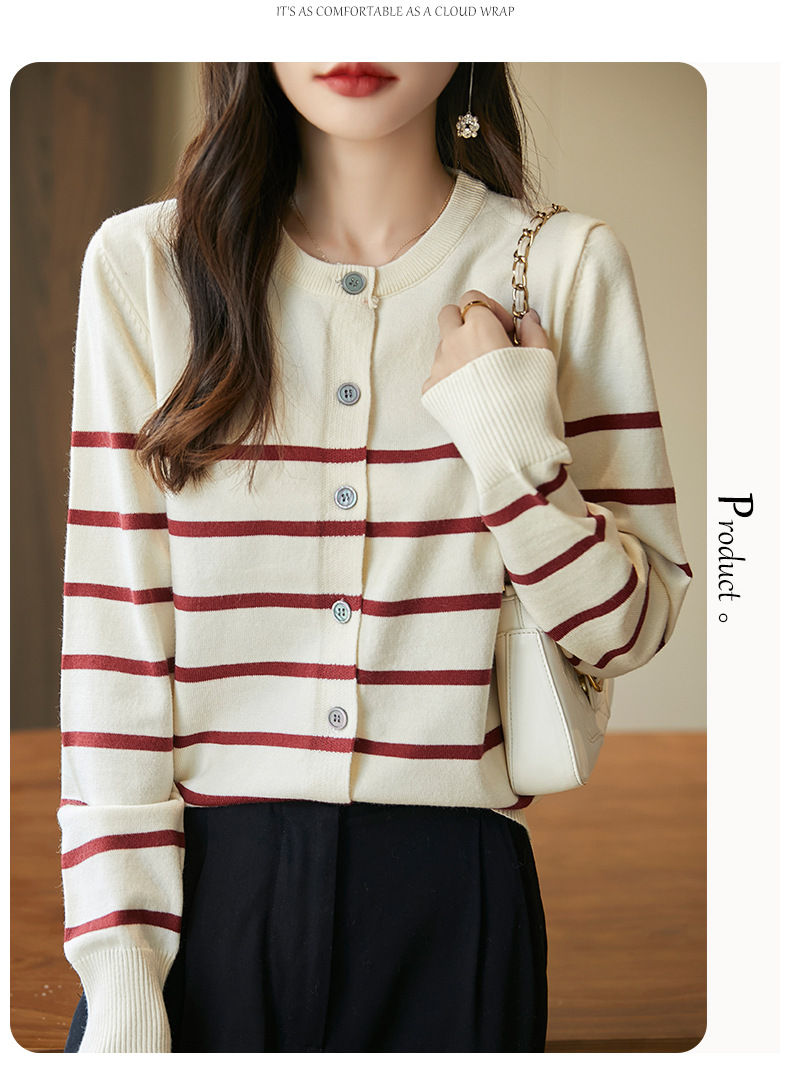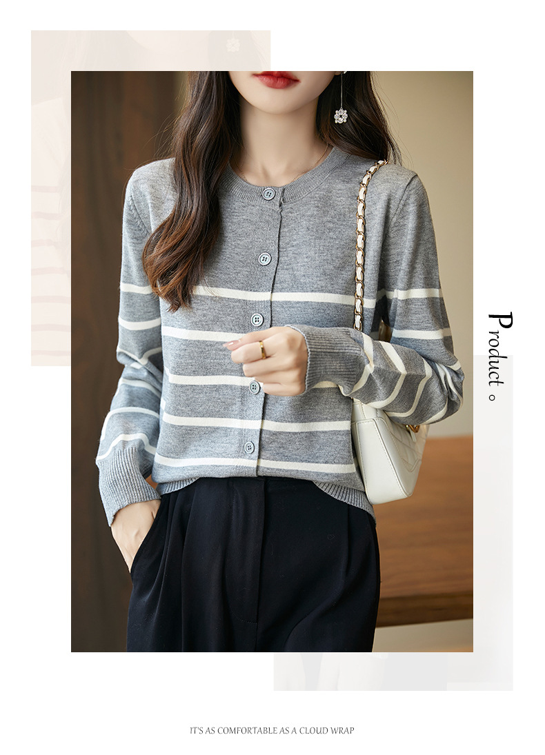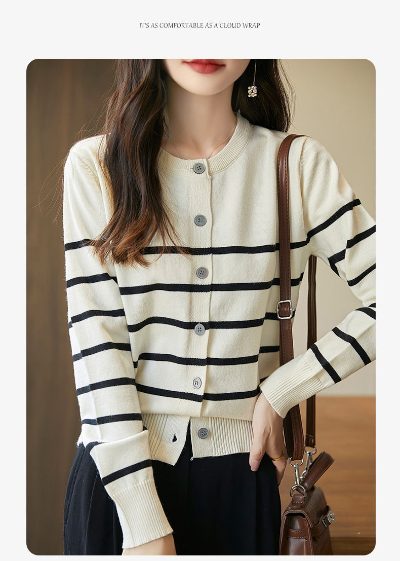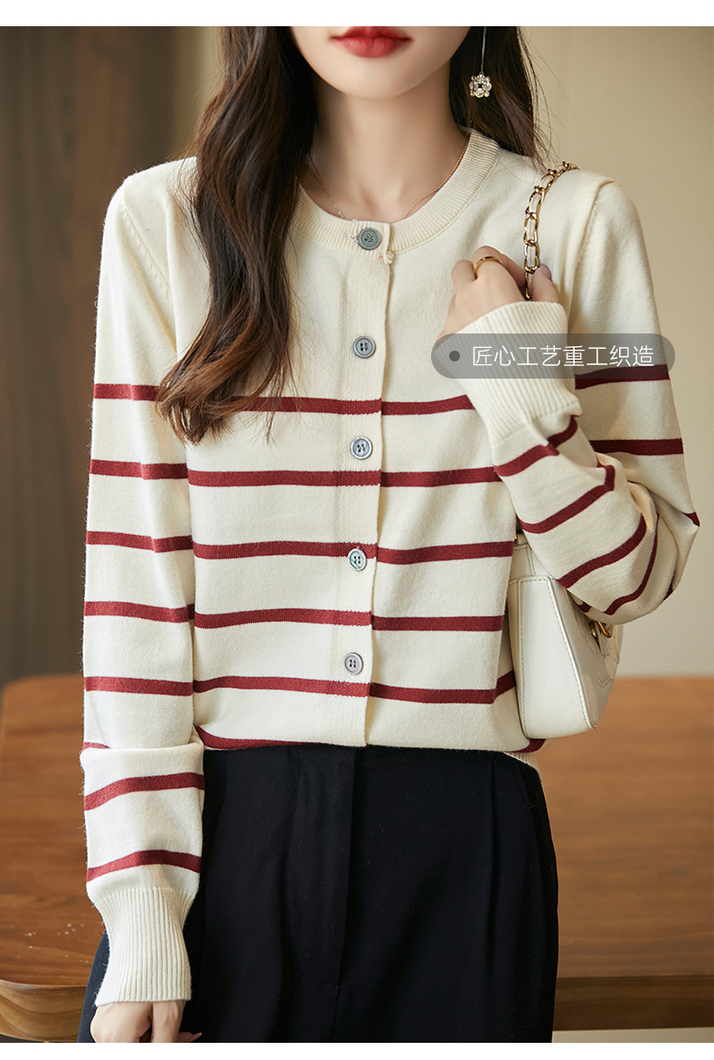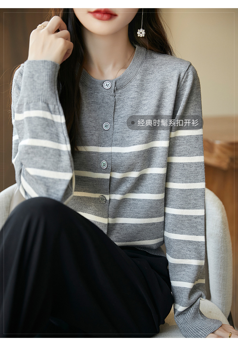 프렌치 롱 슬리브 스트라이프 크루 넥 니트 싱글 로우 멀티 버튼 카디건 여성용 초가을 통근 스웨터 여성용 코트 탑