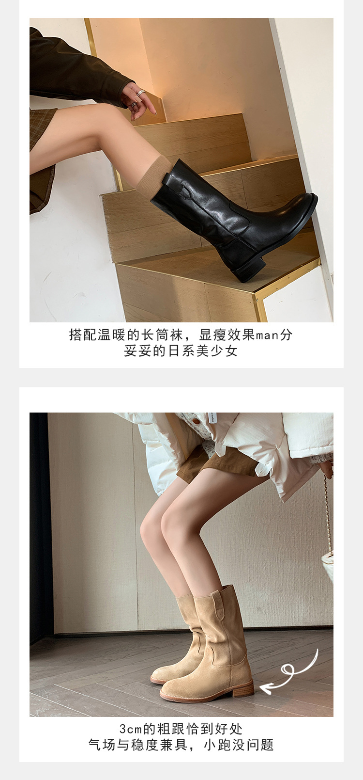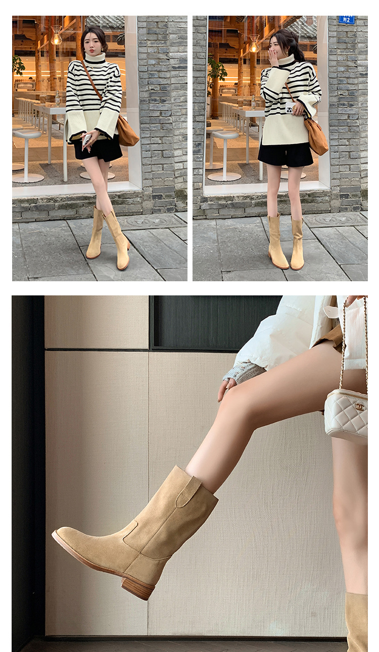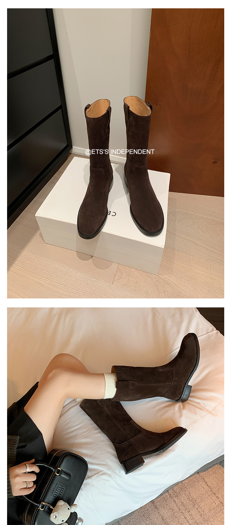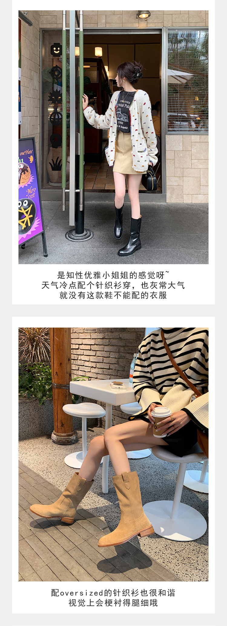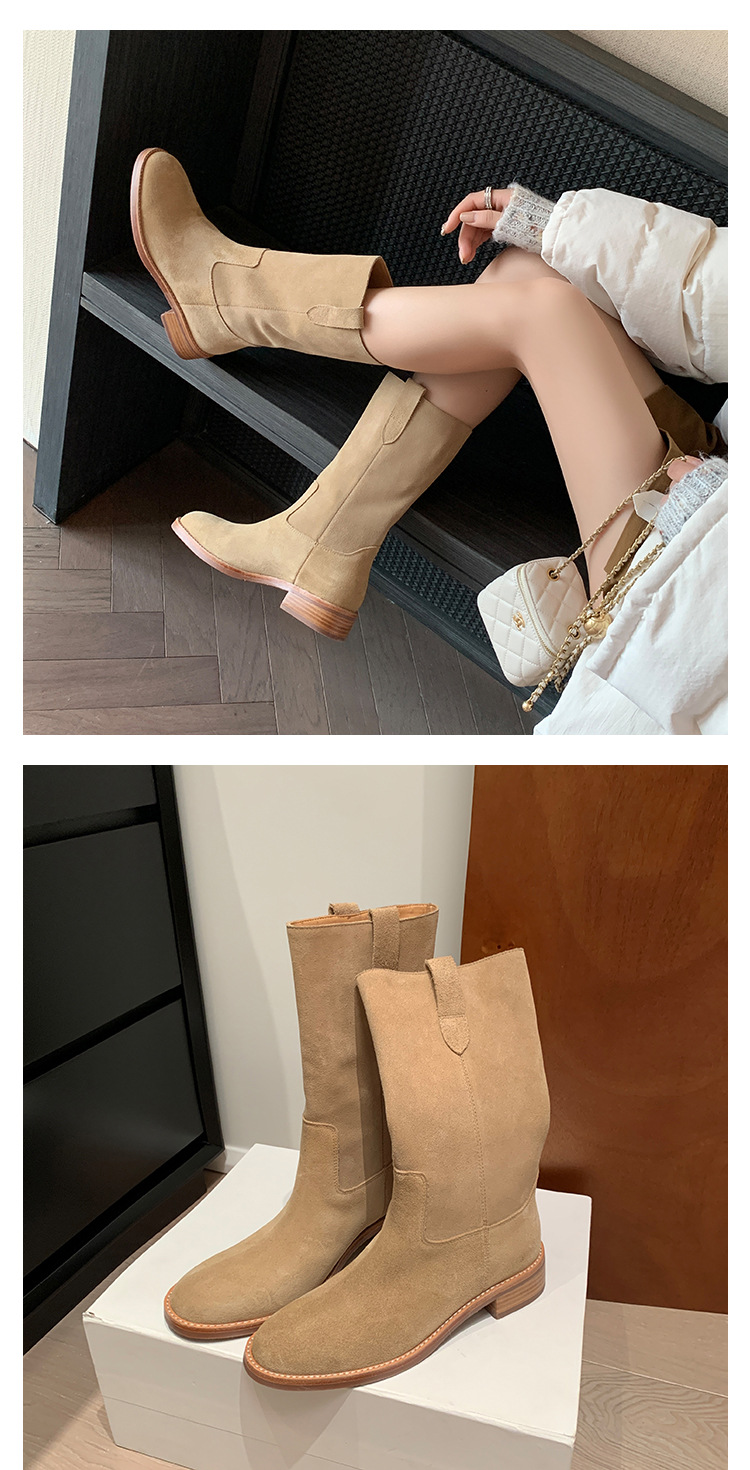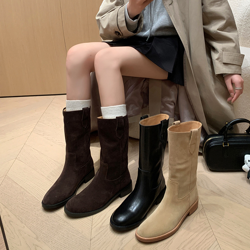 2024 새로운 순수 가죽 짧은 부츠 여성 가을 및 겨울 느슨한 스트레이트 나이츠 부츠 낮은 청키 힐 미드 부츠 올매치 웨스턴 부츠