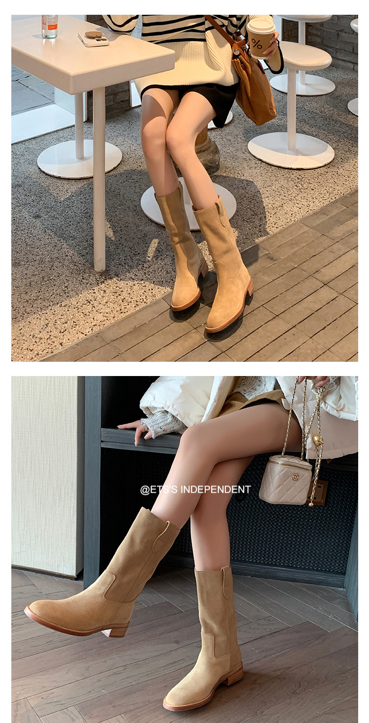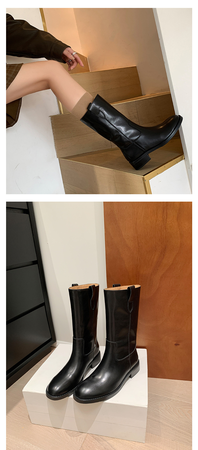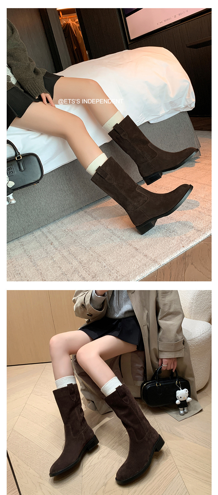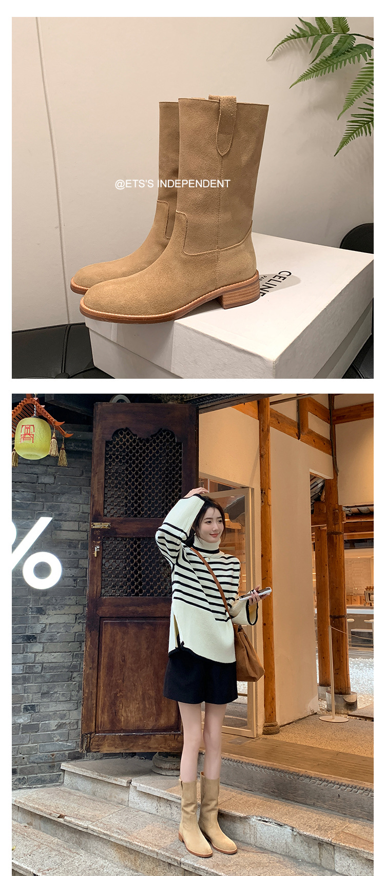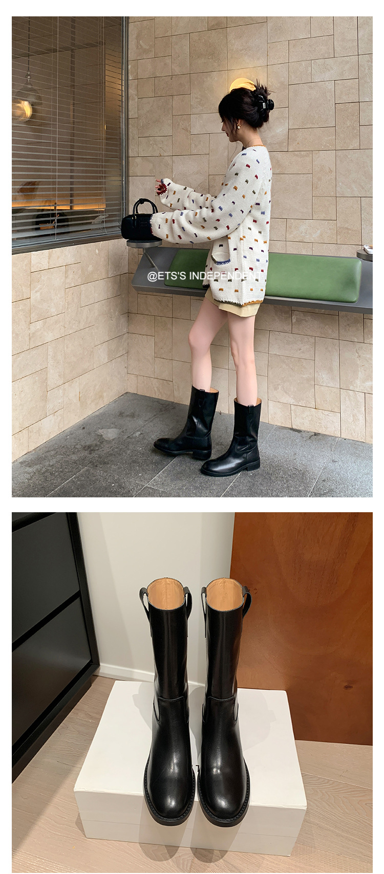 2024 새로운 순수 가죽 짧은 부츠 여성 가을 및 겨울 느슨한 스트레이트 나이츠 부츠 낮은 청키 힐 미드 부츠 올매치 웨스턴 부츠