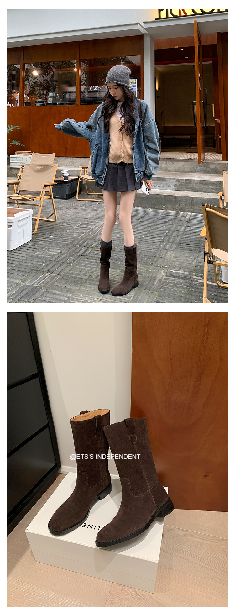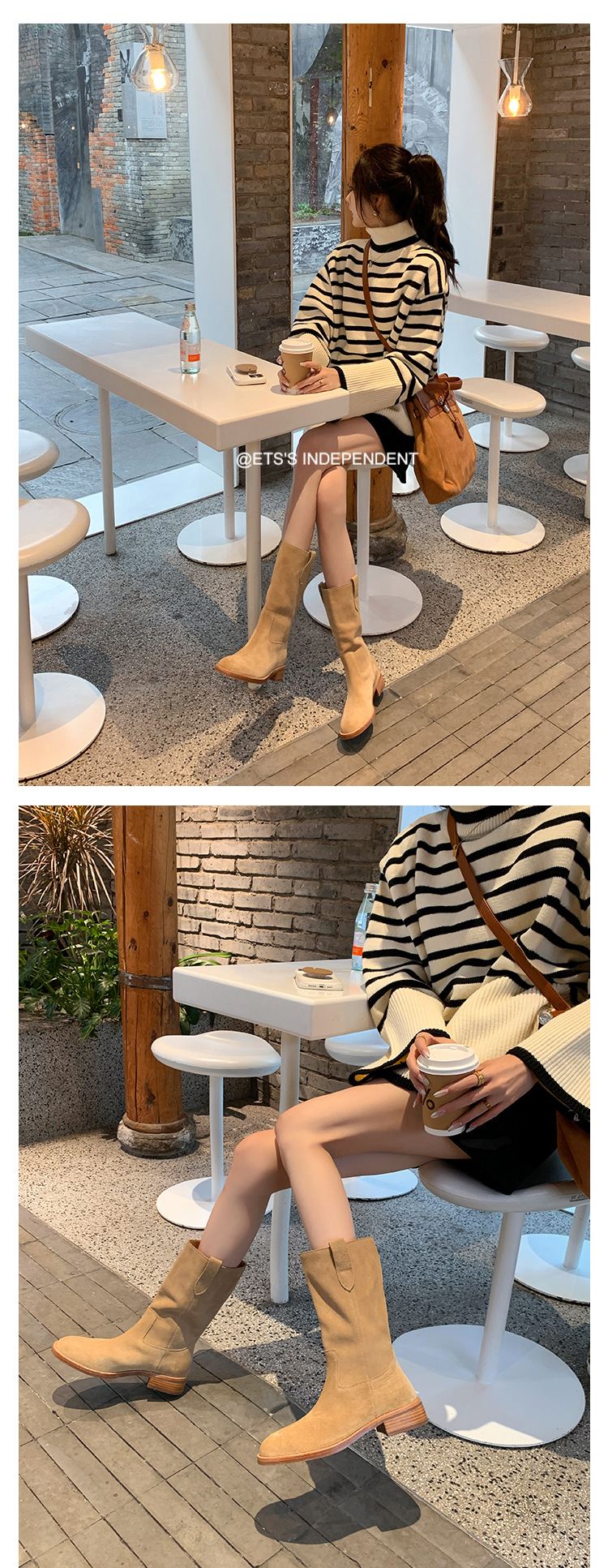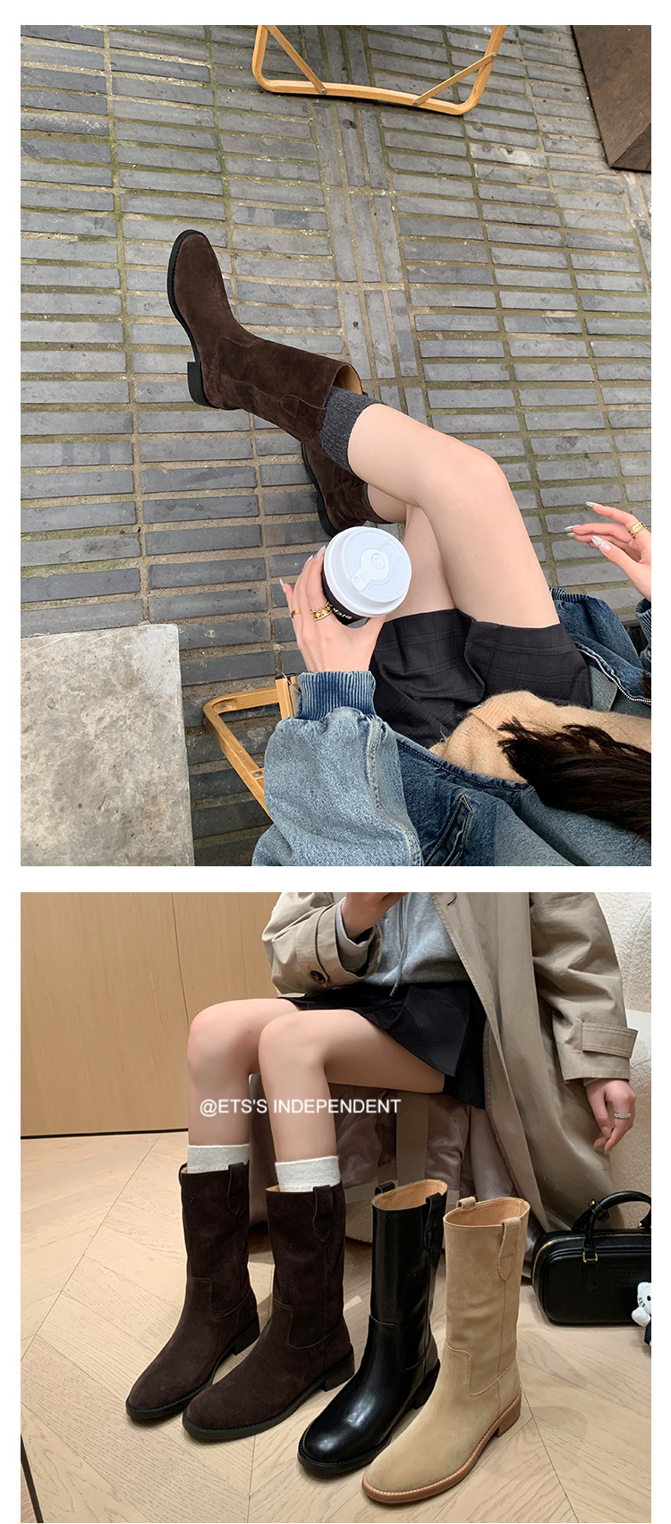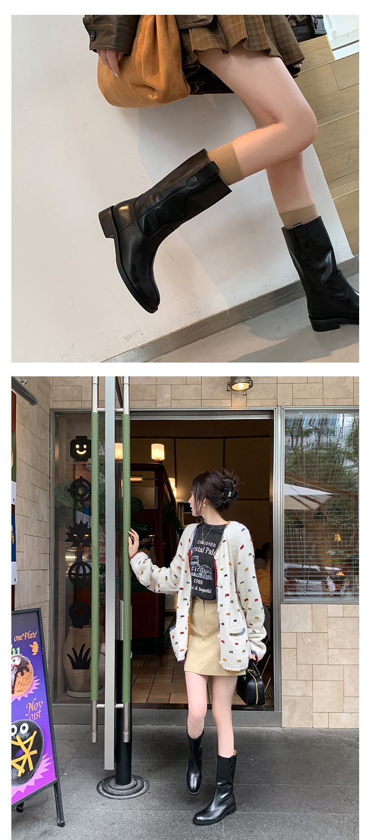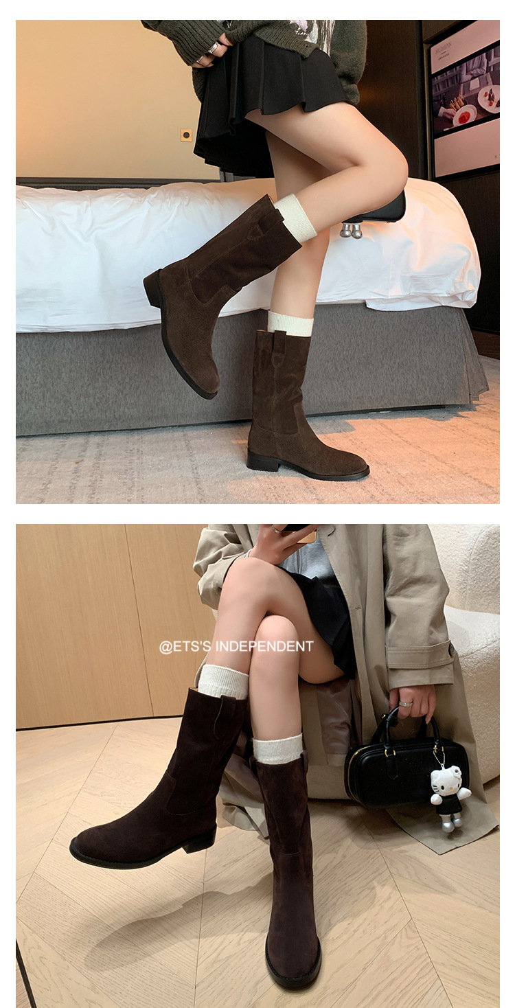 2024 새로운 순수 가죽 짧은 부츠 여성 가을 및 겨울 느슨한 스트레이트 나이츠 부츠 낮은 청키 힐 미드 부츠 올매치 웨스턴 부츠