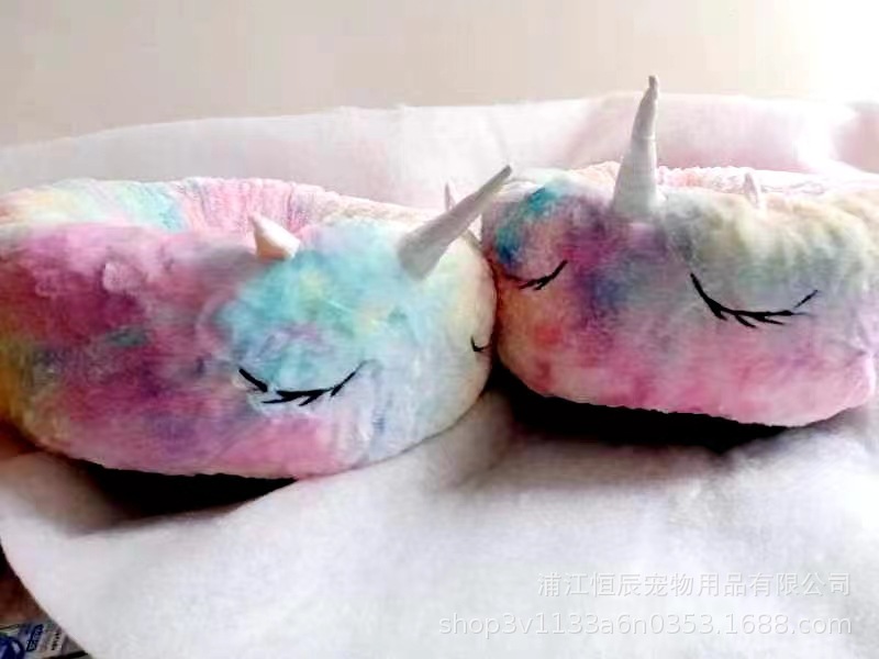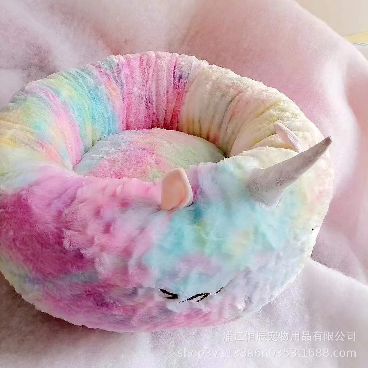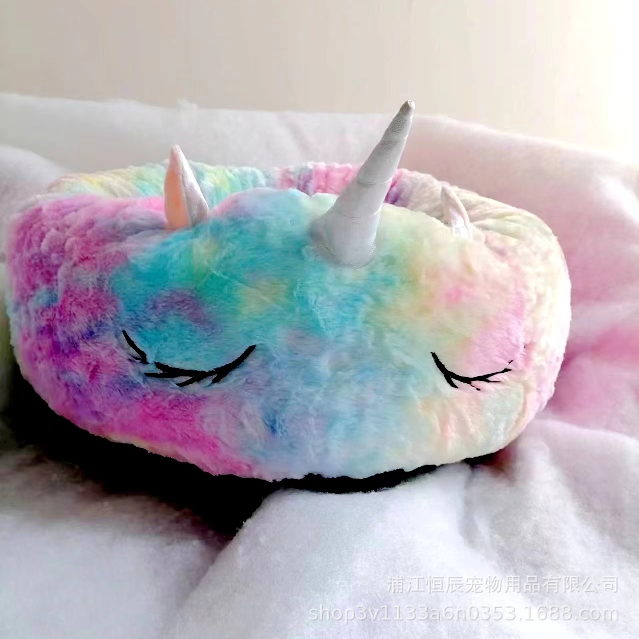 애완 동물을 위한 다채로운 유니콘 사육장 고양이 사육장 봉제 둥근 애완 동물 사육장 개 침대 겨울 개 매트 애완 동물 침대스토어 가기