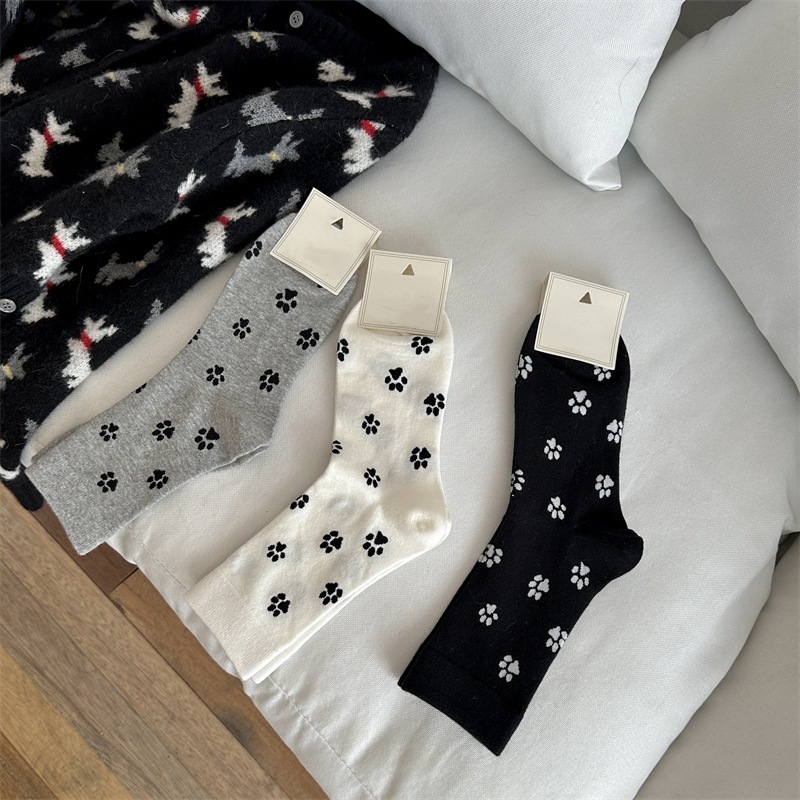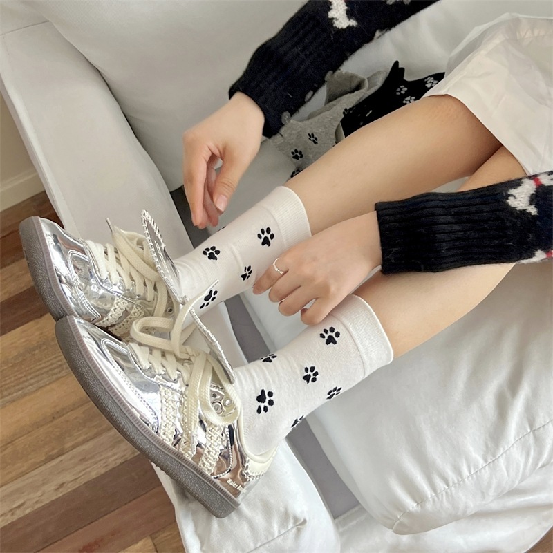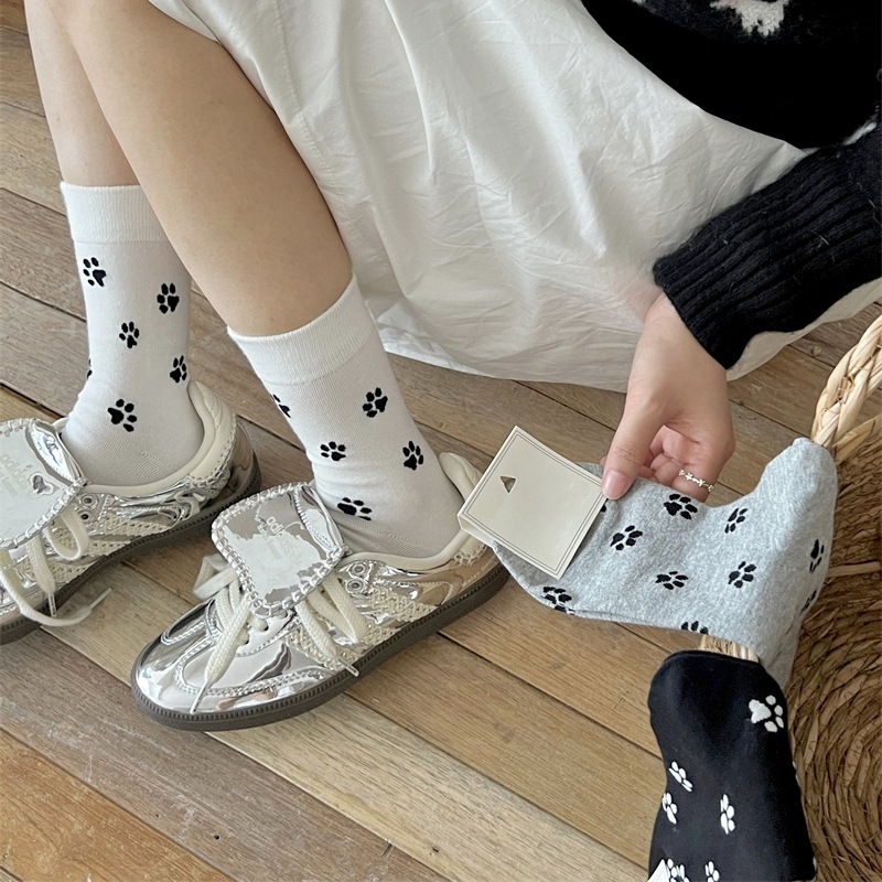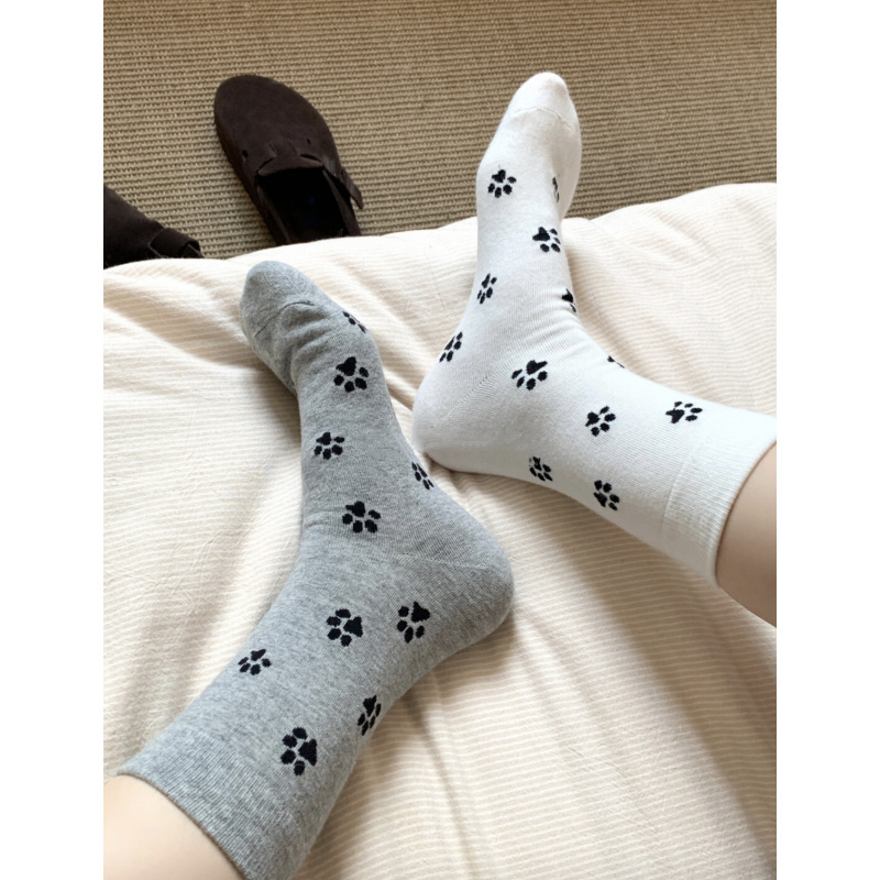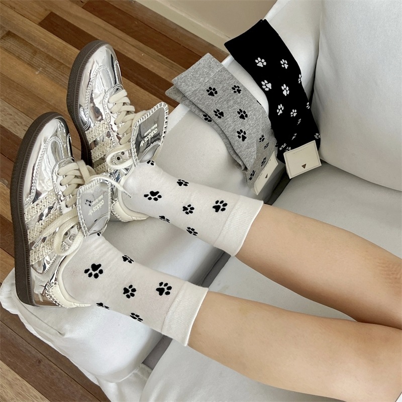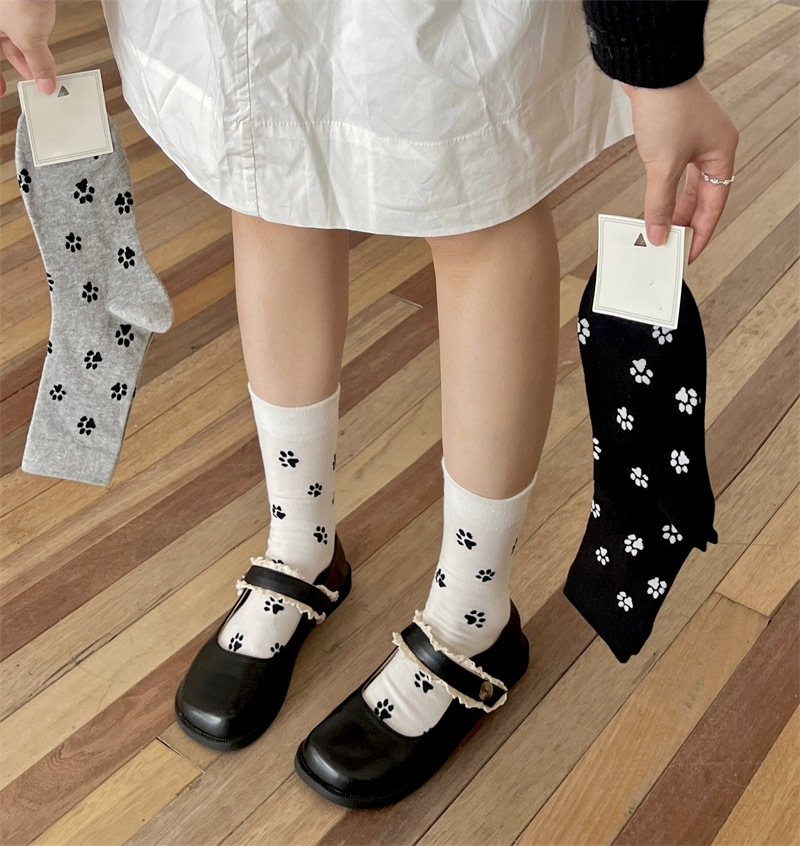 한국 스타일 s 스타일 귀여운 강아지 발 인쇄 양말 여성의 중간 튜브 양말 흑백 회색 틈새 디자인 순수한면 쌓인 양말