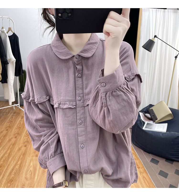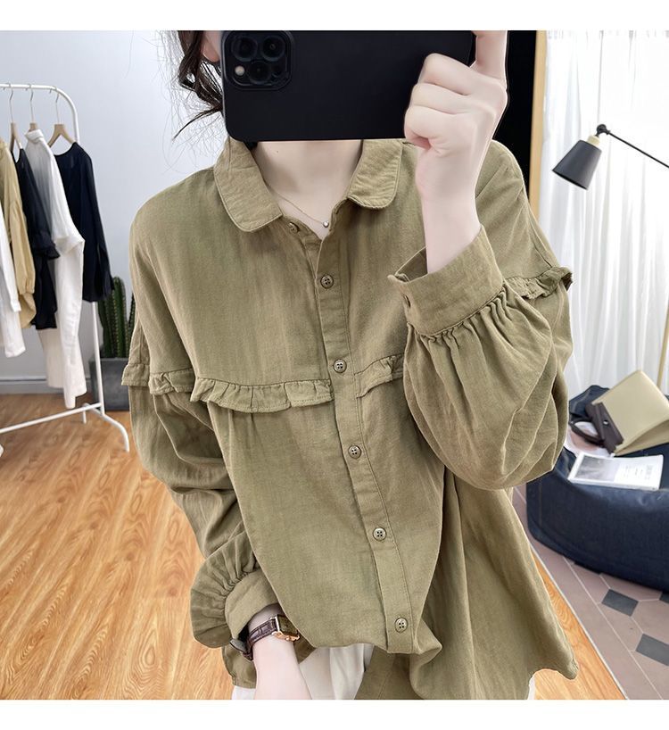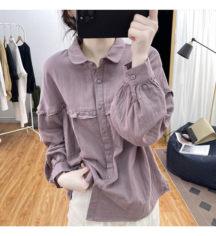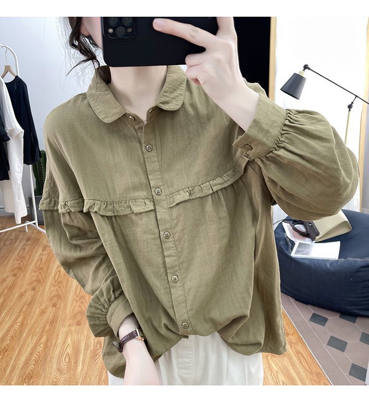 코튼 린넨 랜턴 슬리브 셔츠 여성의 봄과 가을 주름진 긴 소매 연령 감소 Yuanbao 칼라 퓨어 코튼 탑 빈티지 베이스 셔츠스토어 가기