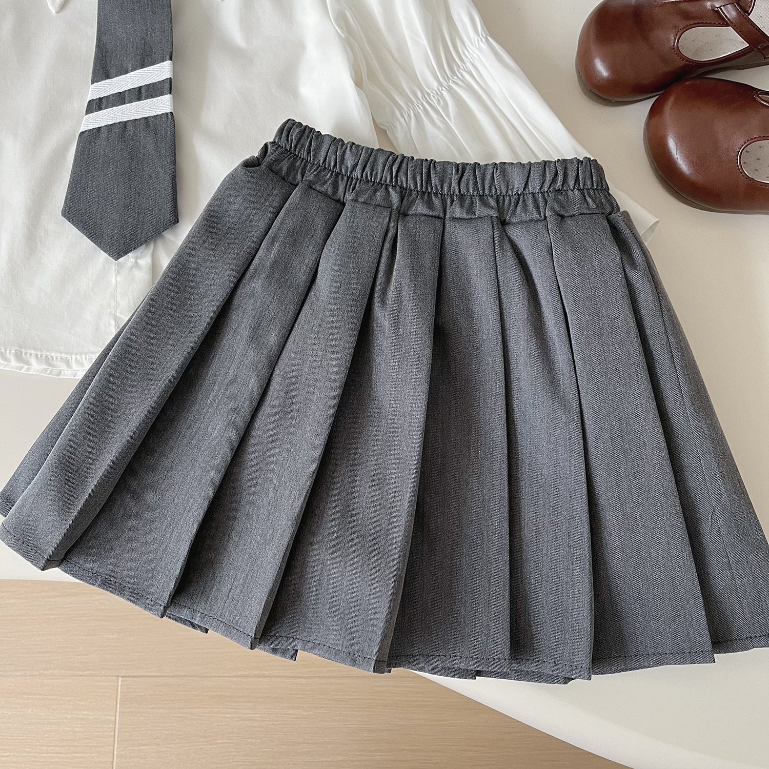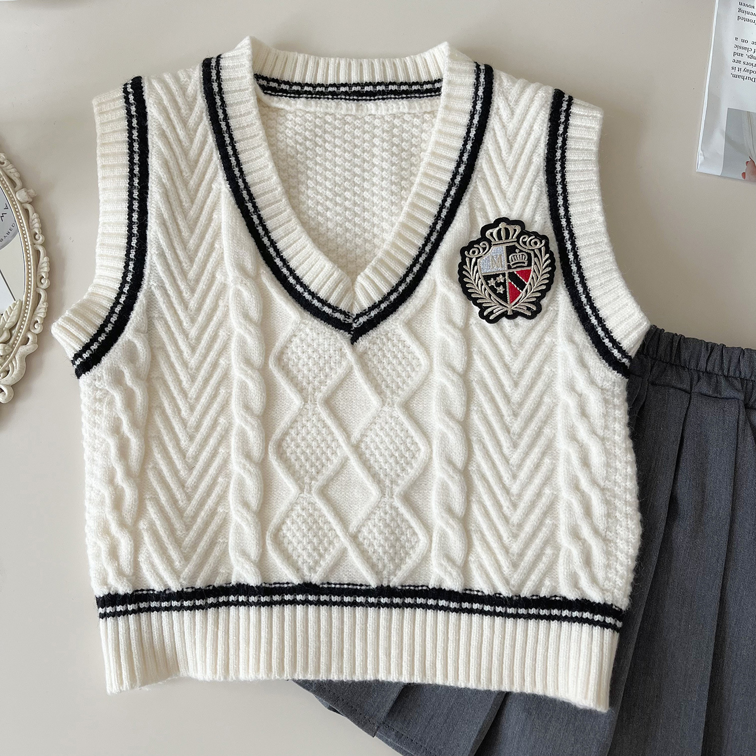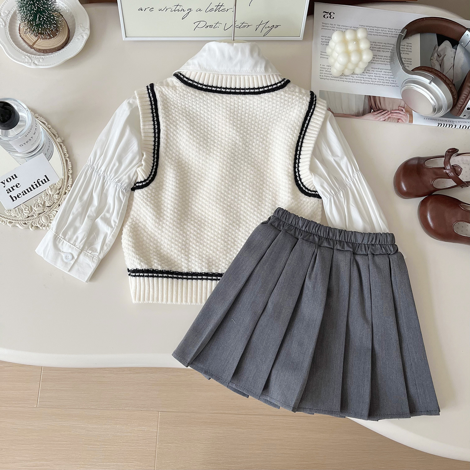 소녀 3 피스 세트 2024 가을 새로운 긴 소매 셔츠 니트 조끼 주름 치마 대학 스타일 세트스토어 가기