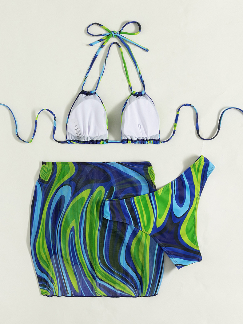 亚马逊新款欧美纯色长裙罩衫比基尼沙滩裙三件套泳衣女高级感泳装