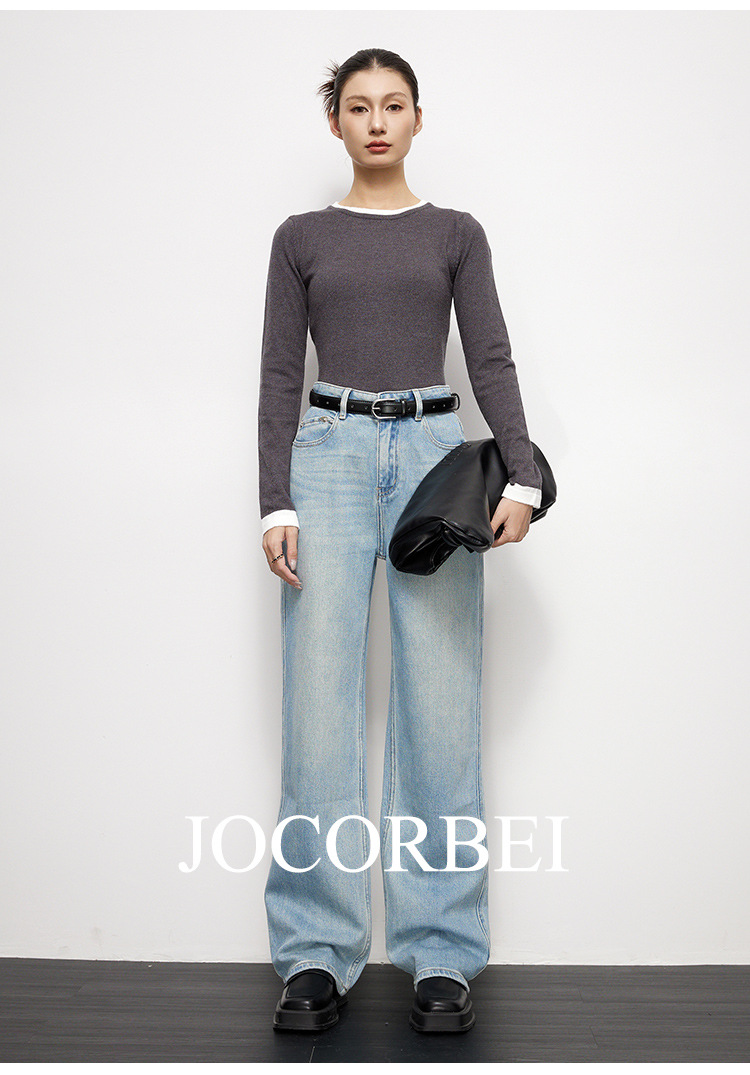 JOCORBEI [Four Seasons Bibei] 세탁 블루 와이드 레그 팬츠 여성용 하이 웨이스트 루즈 스트레이트 청바지 바지