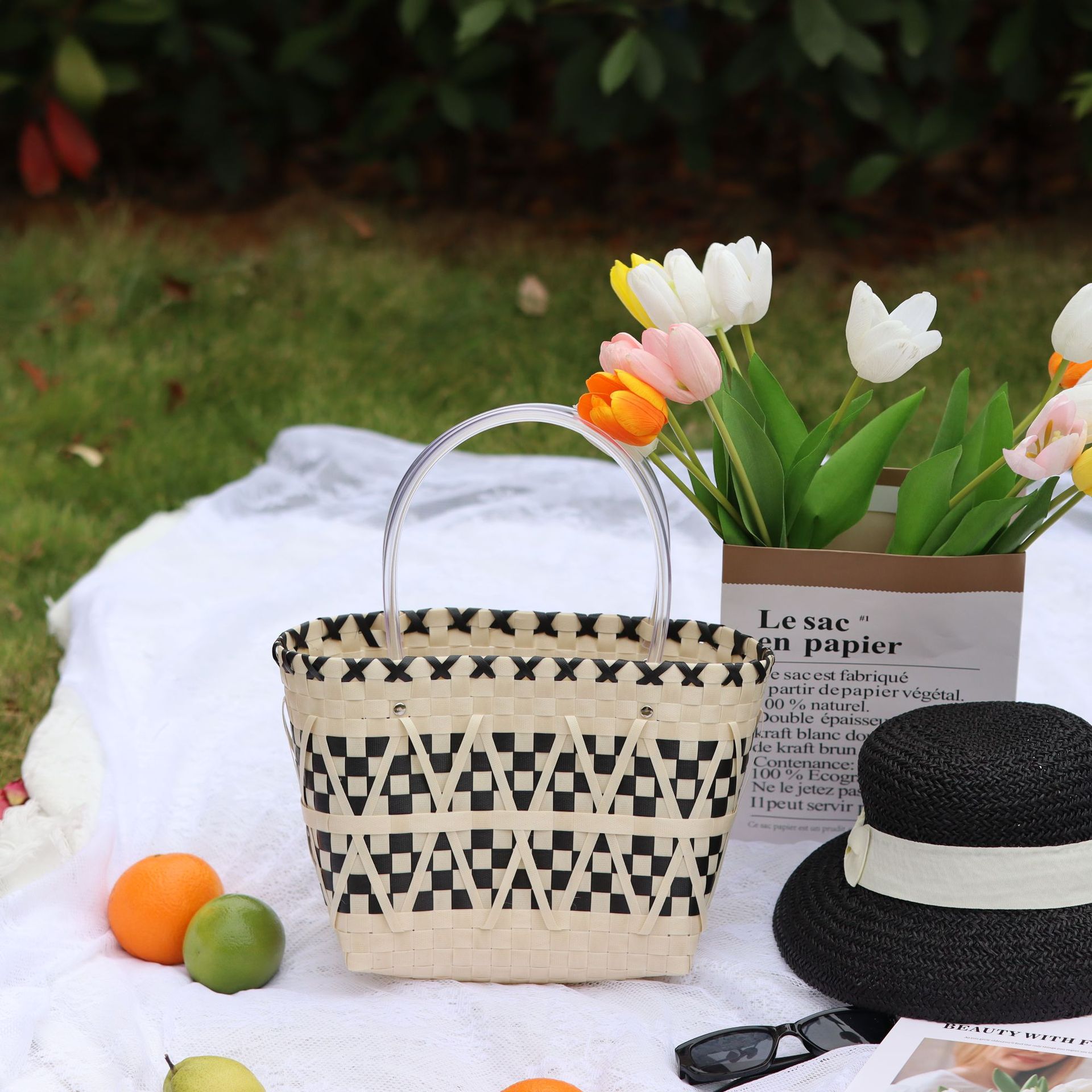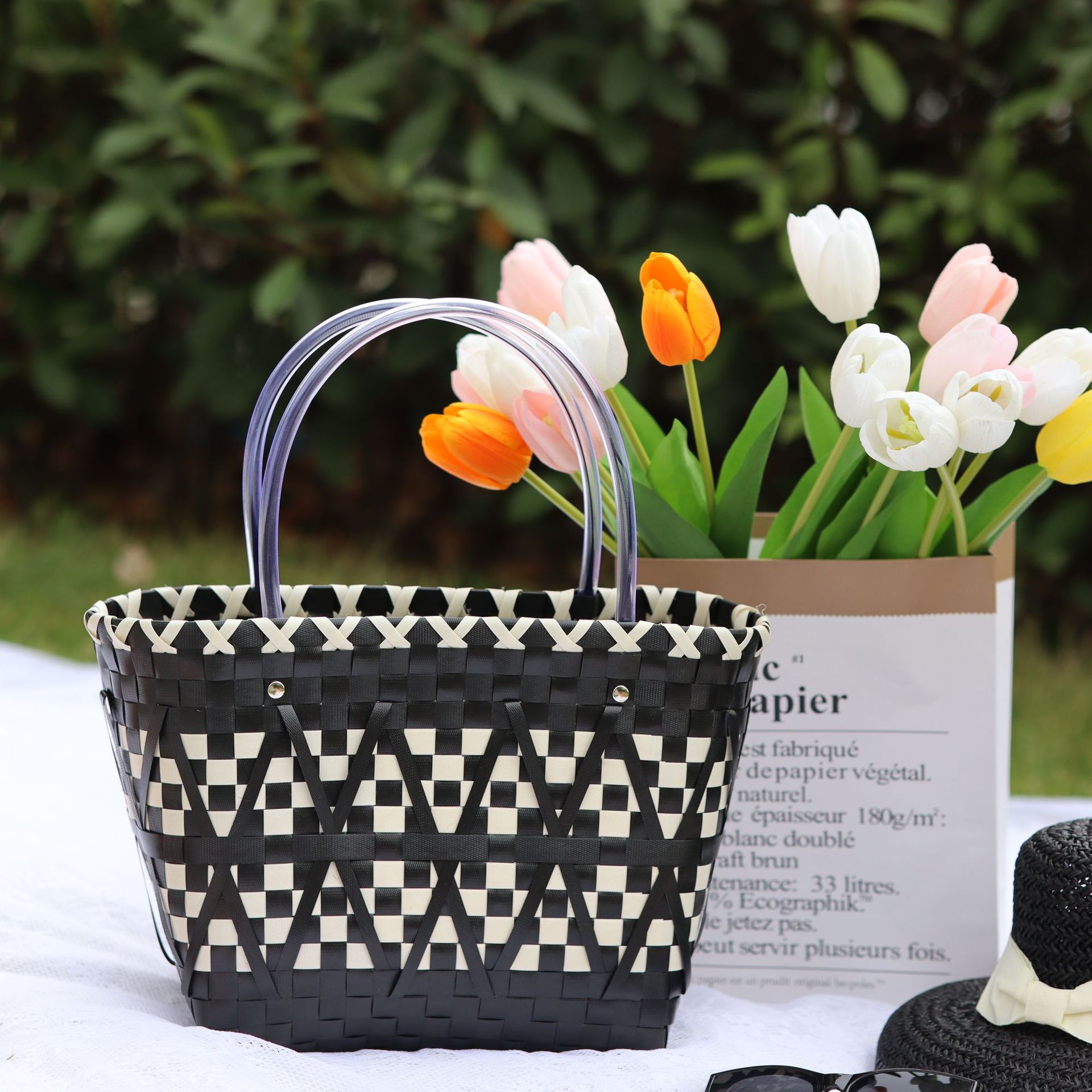 공장 재고 도매 손으로 짠 야채 바구니 플라스틱 짠 가방 밀짚 가방 비치 가방 높은 손 선물 가방