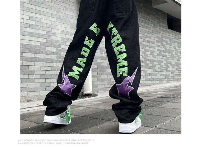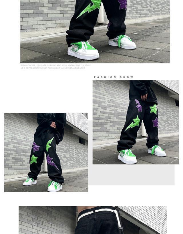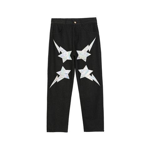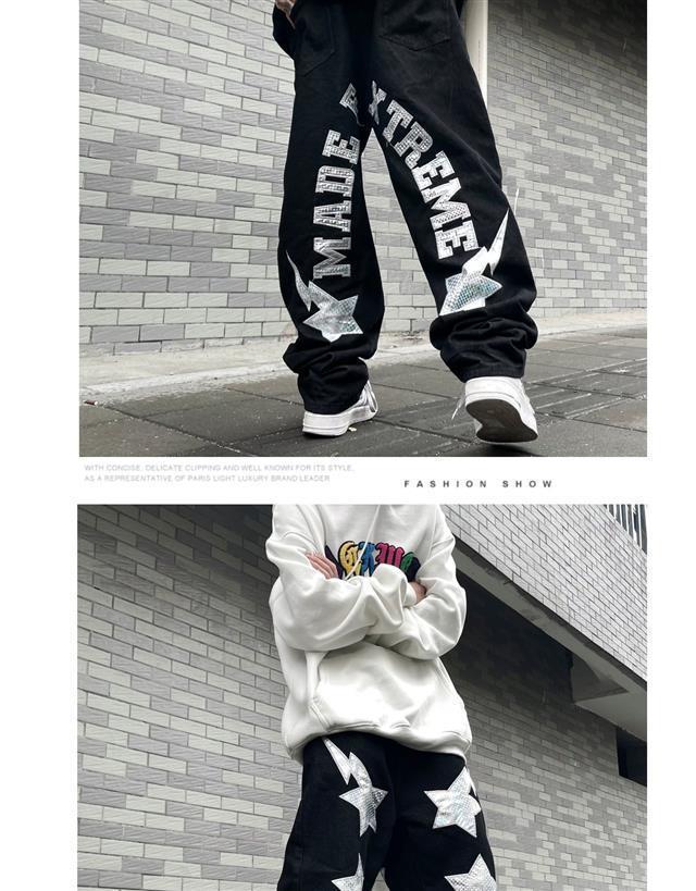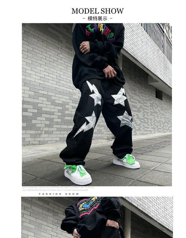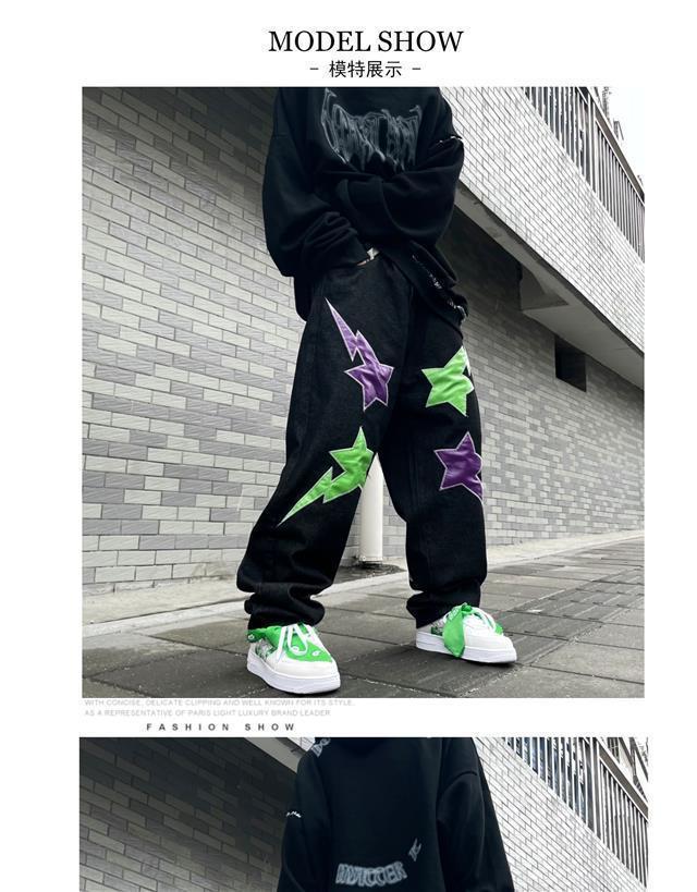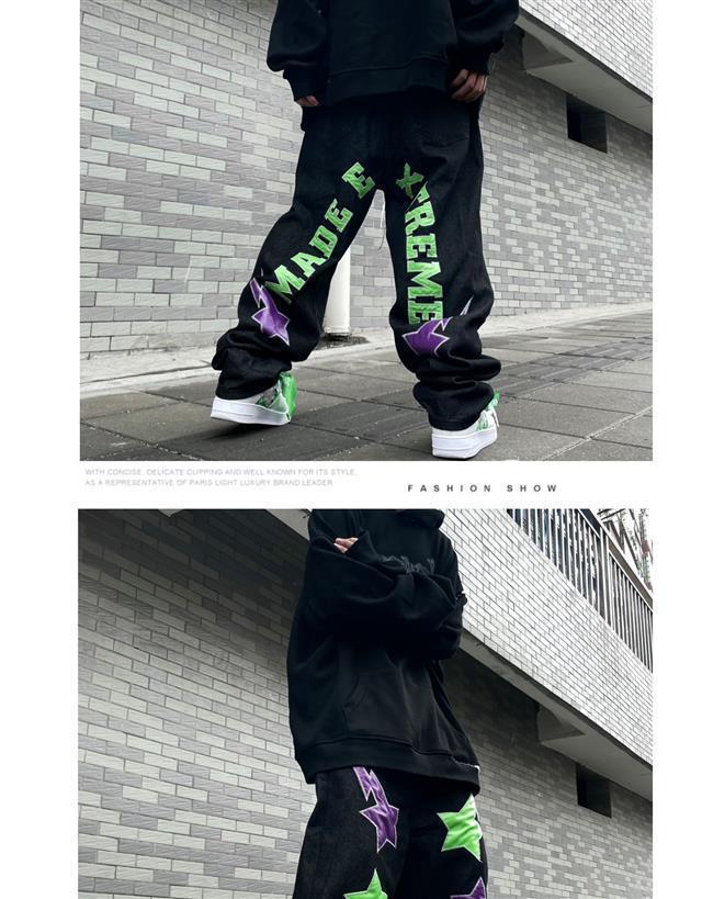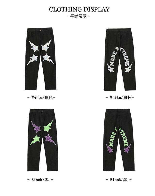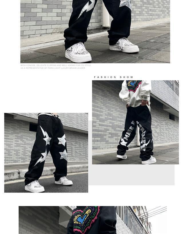 TRB 오리지널 전국 패션 힙합 스트리트 번개 다섯개 별 스티커 느슨한 캐주얼 와이드 레그 Hiphop 청바지 패션스토어 가기