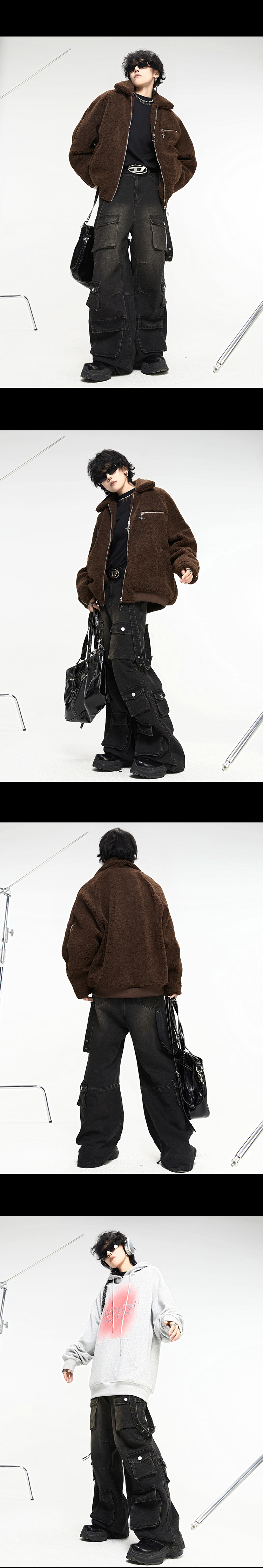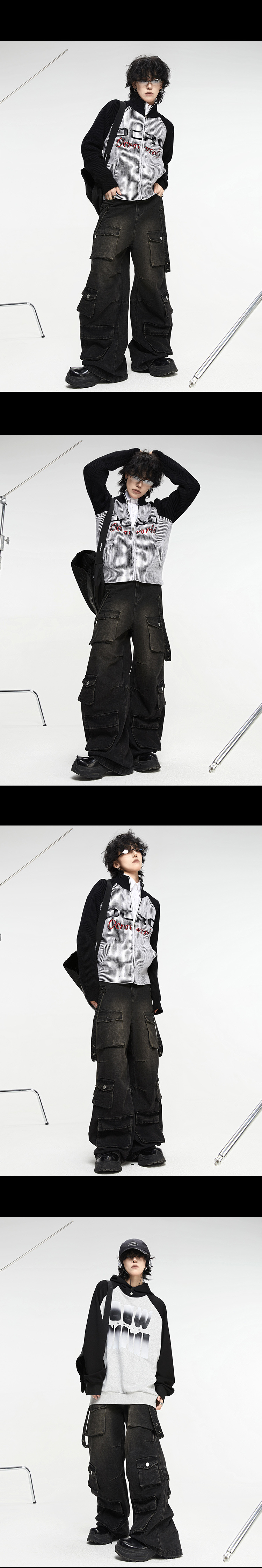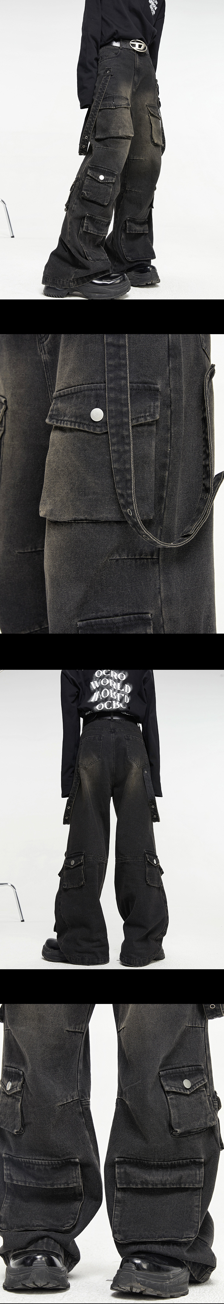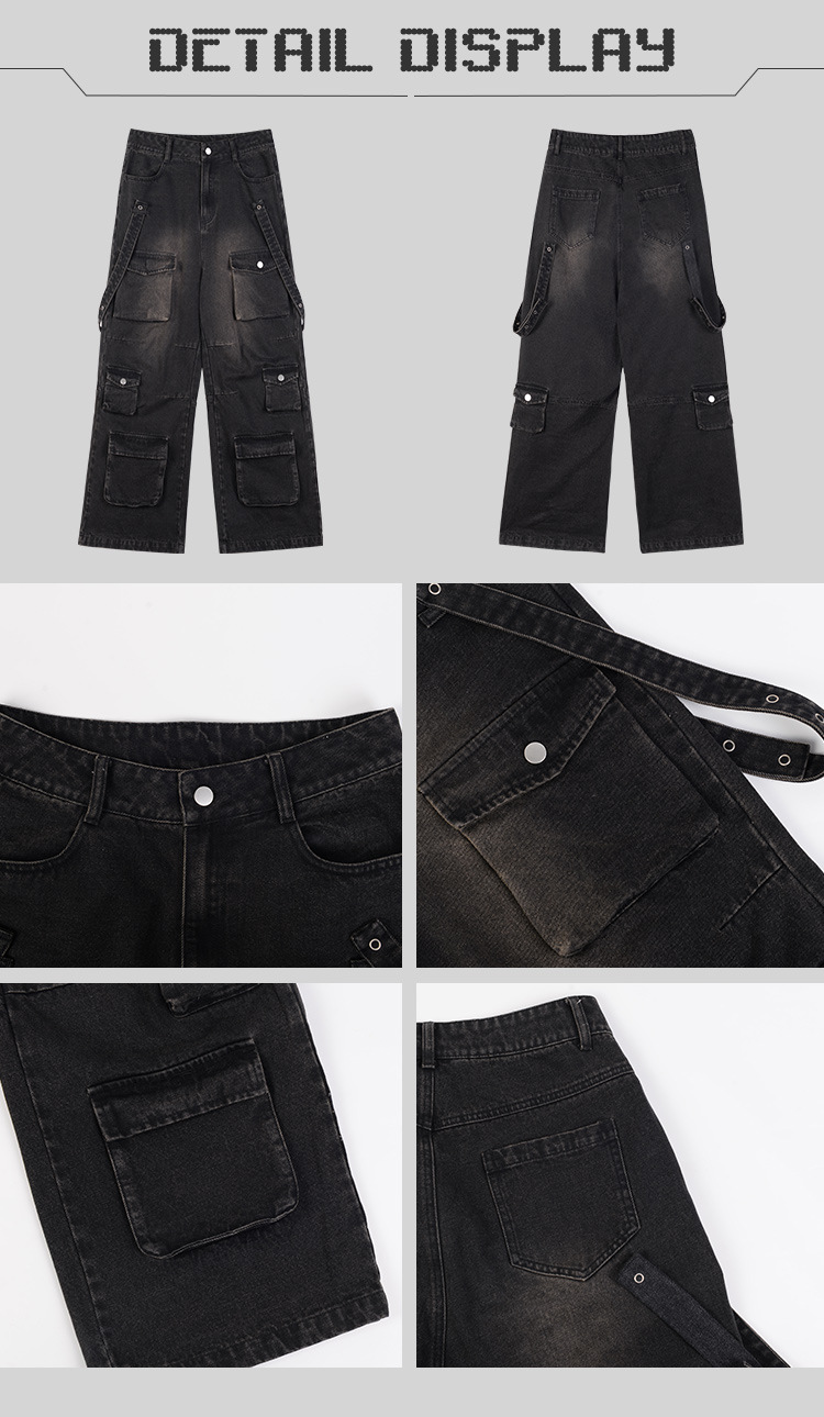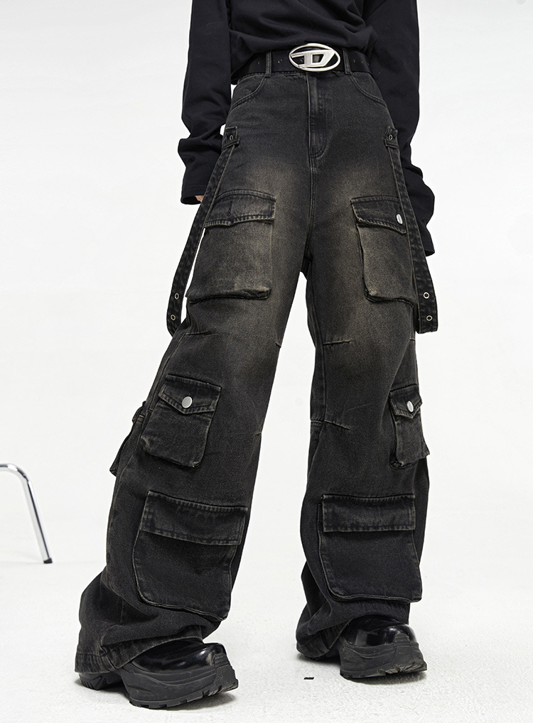2024 하이 스트리트 멀티 포켓 레트로 와이드 레그 청바지 남자 가을 루즈 스트리트 하이퍼 힙합 스트레이트 바지스토어 가기