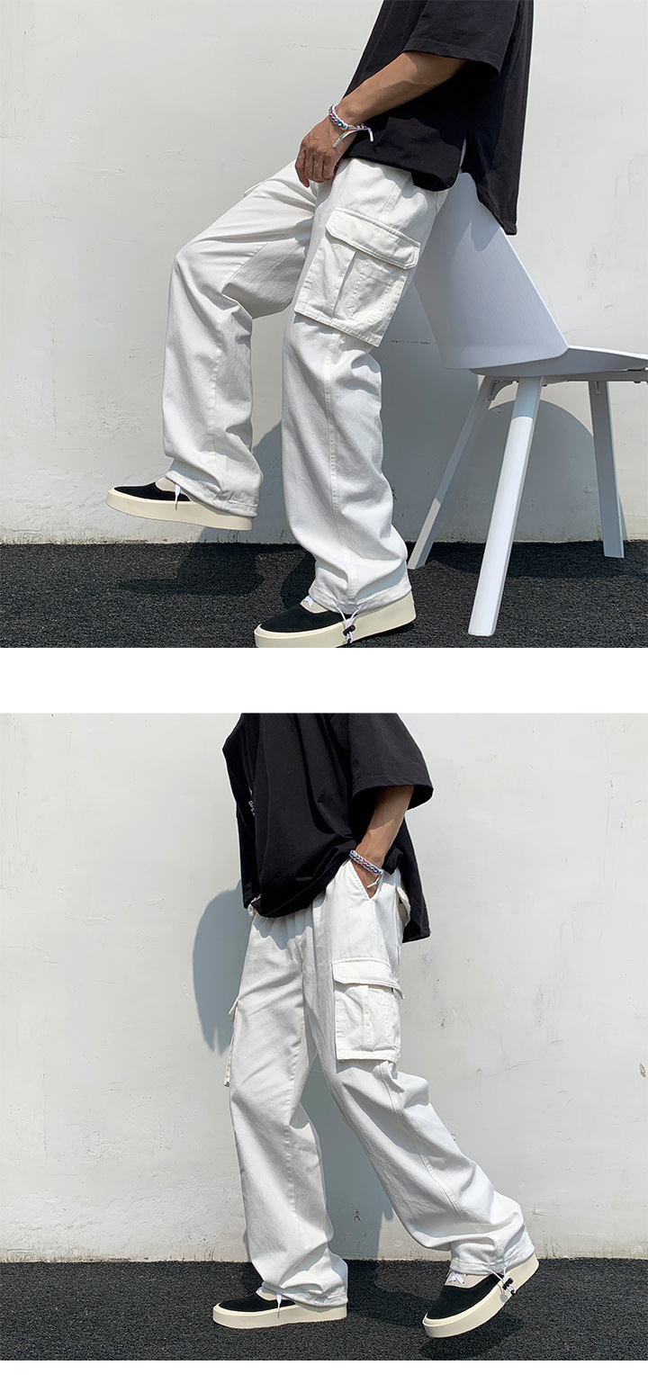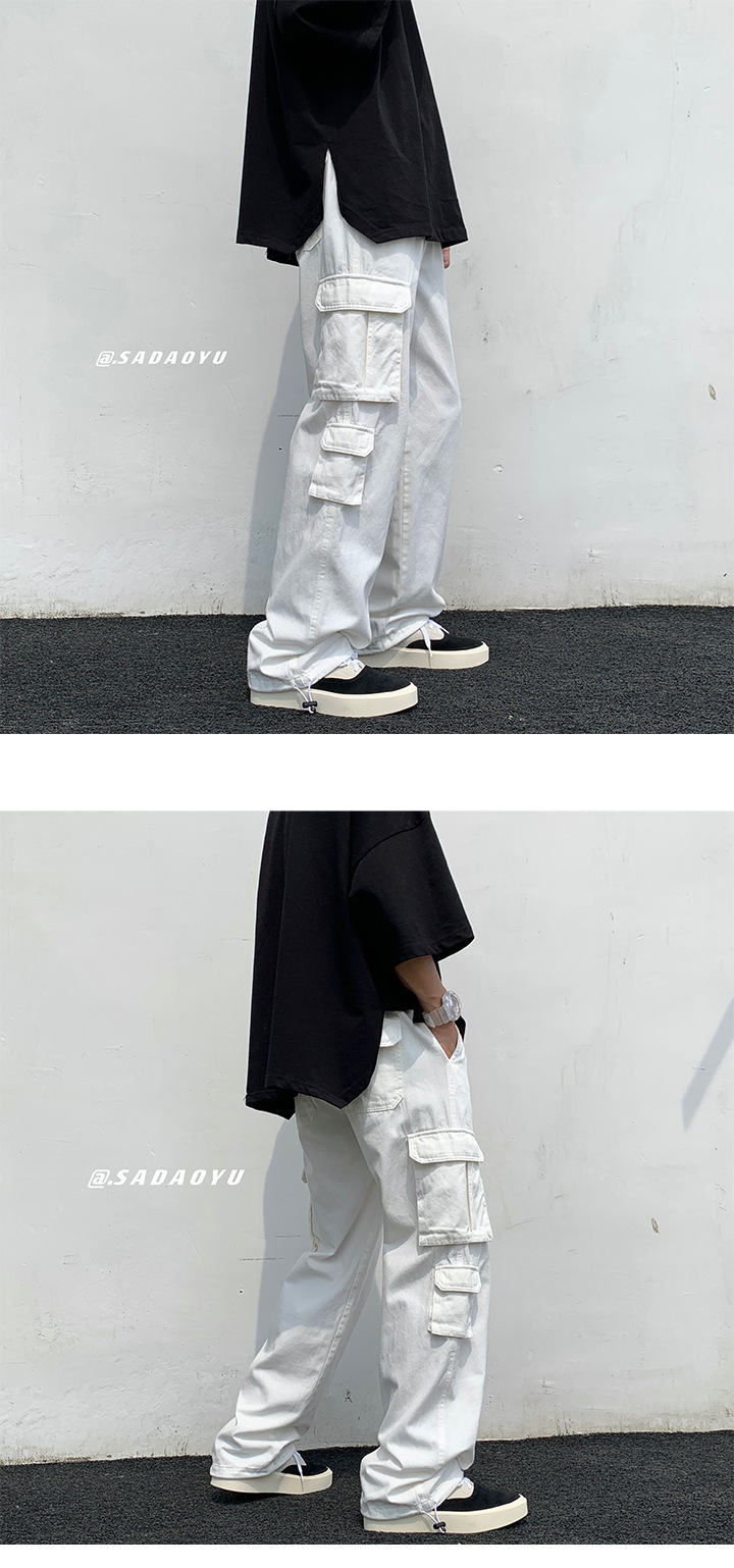 흰색화물 바지 남자 가을 전국 패션 멀티 포켓 바지 하이 스트리트 인 패션 브랜드 덤핑 느슨한 와이드 다리 바지