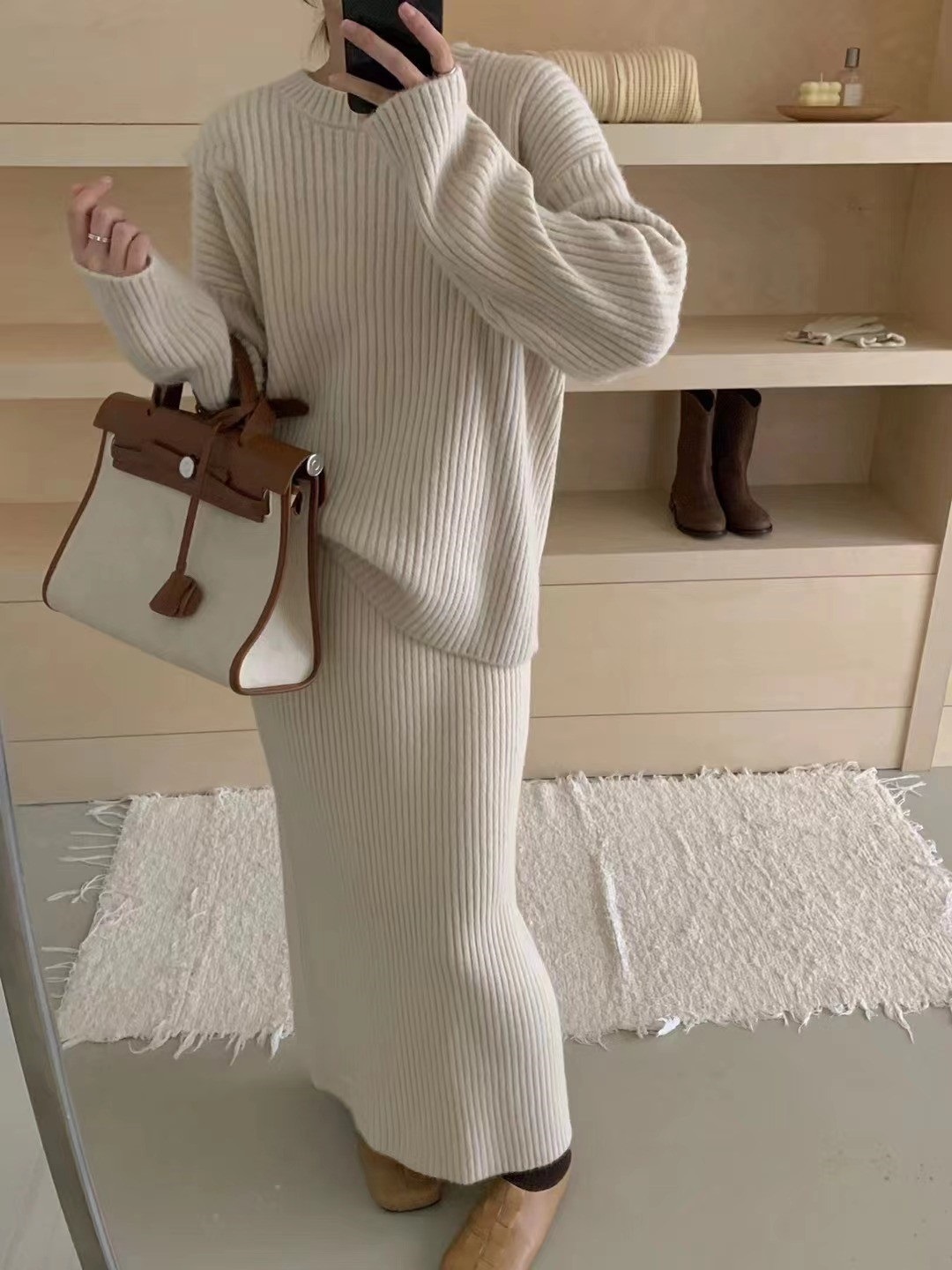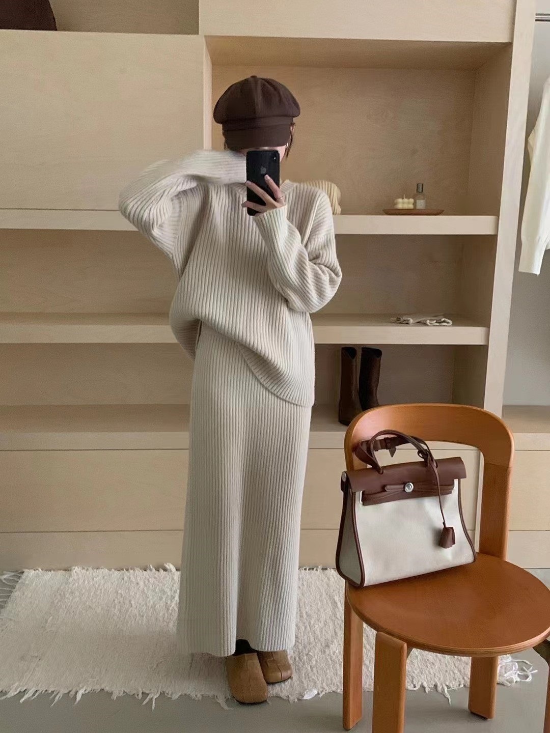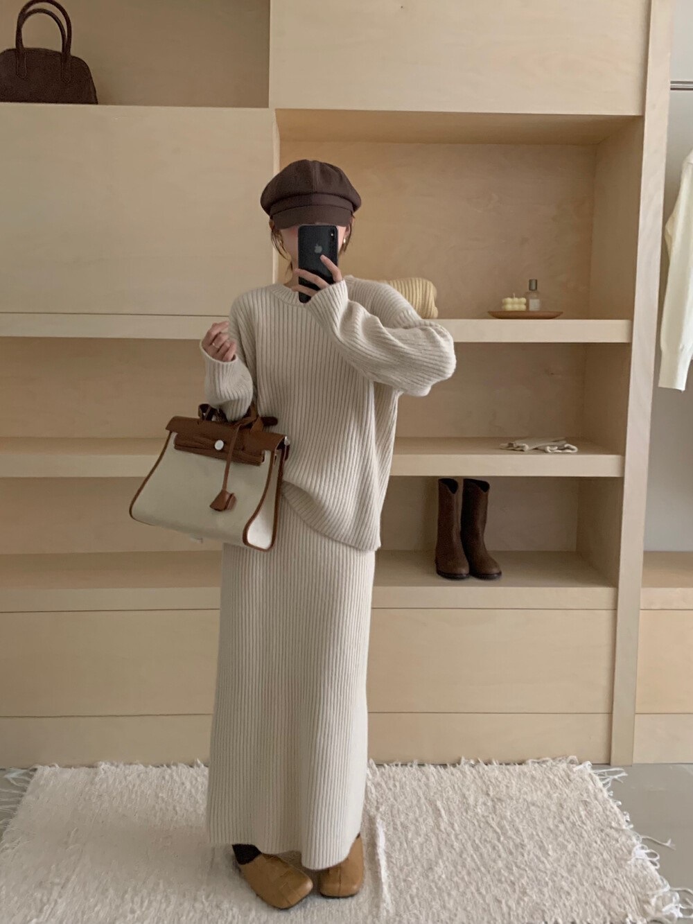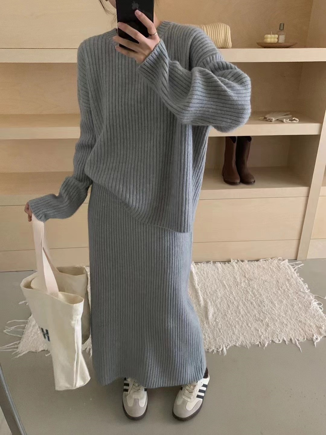 한국식 스웨터 세트 여성의 가을과 겨울 느슨한 게으른 스타일 유행 니트 셔츠 탑 롱 스커트 투피스 세트