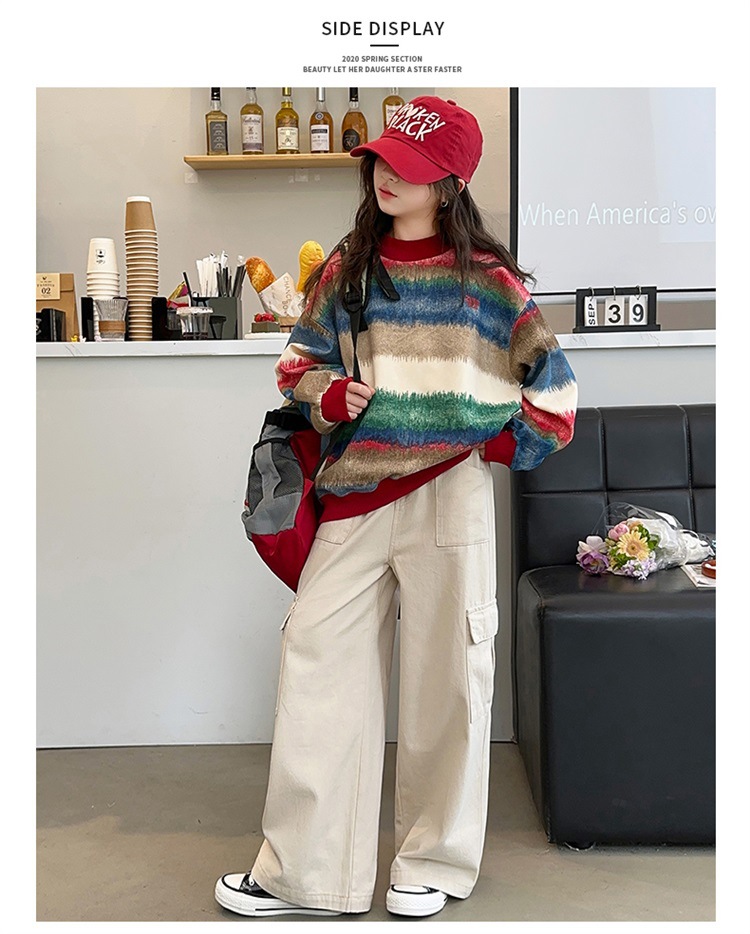 소녀 세트 가을 2024 새로운 어린이 서양식 캐주얼 컬러 스트라이프 스웨트 대형 포켓 크레인 바지 세트스토어 가기