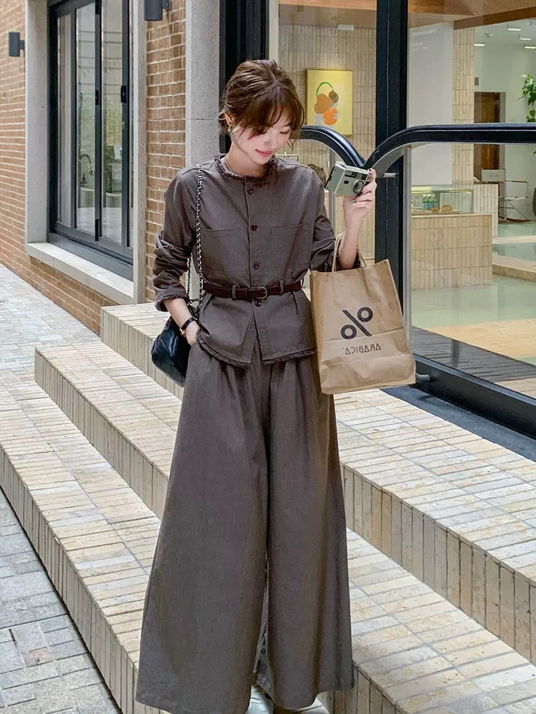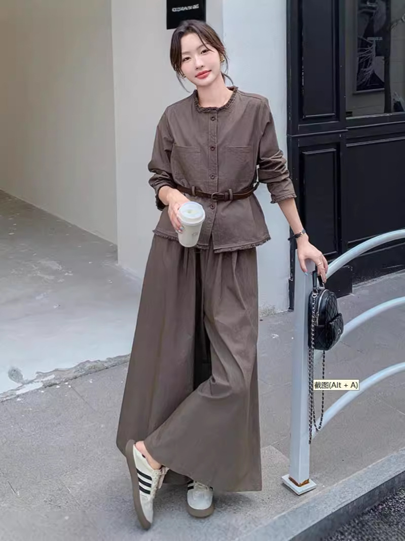 프랑스 레트로 술 탑 스트레이트 와이드 레그 팬츠 2 피스 세트 여성의 이른 봄 가을 새로운 패션 캐주얼 스커트 세트