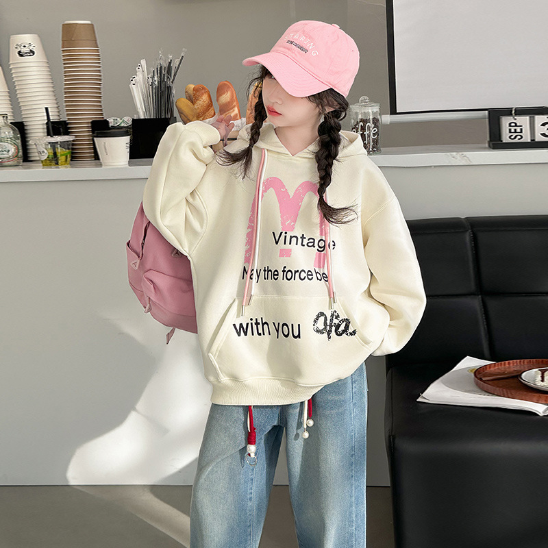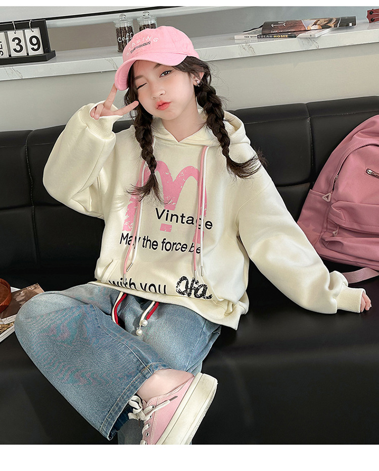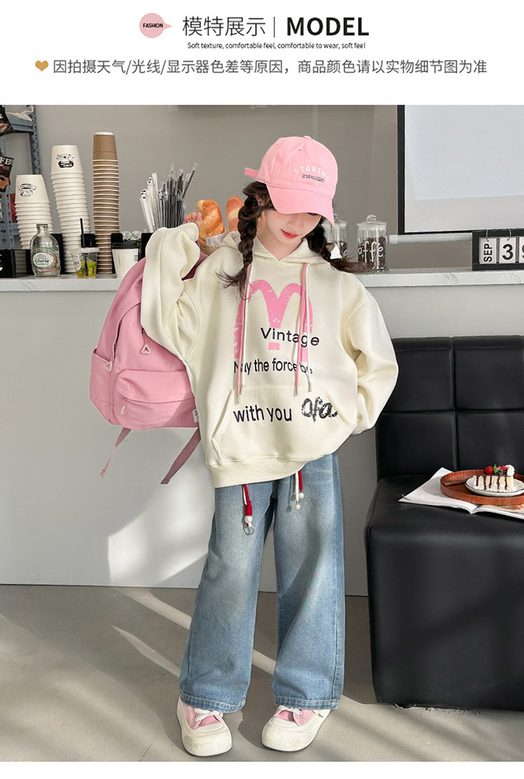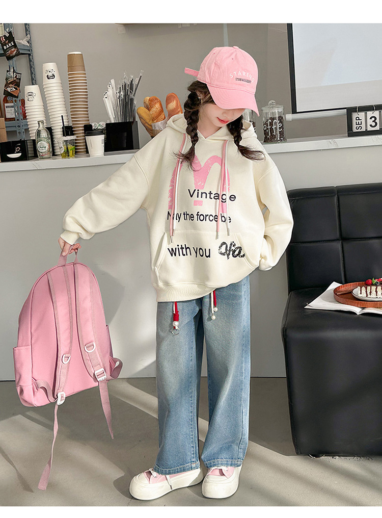 가을 2024 새로운 소녀의 봄 옷 큰 어린이 캐주얼 서양식 인쇄 편지 M 후드 스웨트 셔츠 청바지 세트