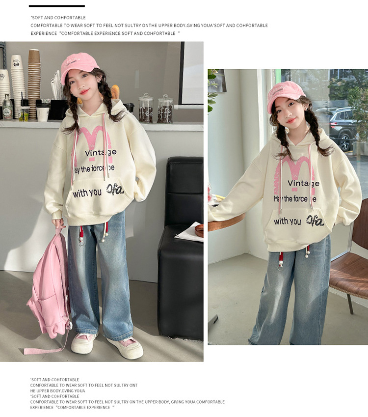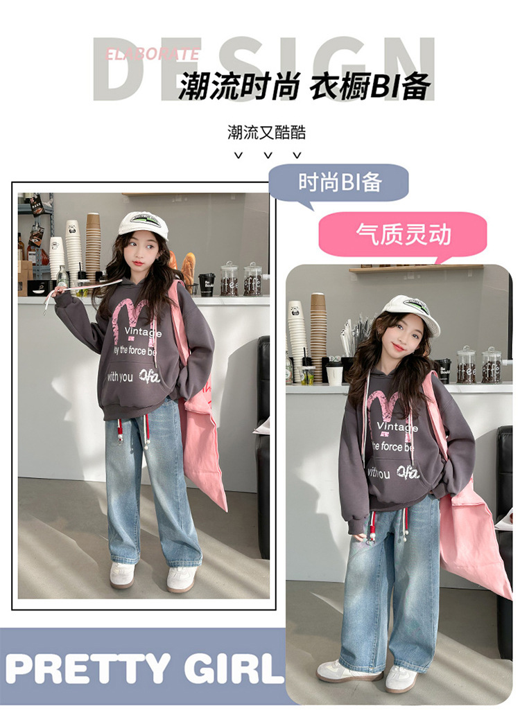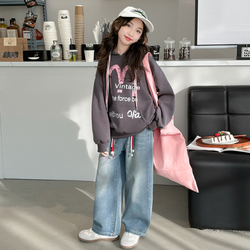 가을 2024 새로운 소녀의 봄 옷 큰 어린이 캐주얼 서양식 인쇄 편지 M 후드 스웨트 셔츠 청바지 세트스토어 가기