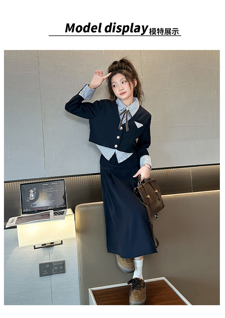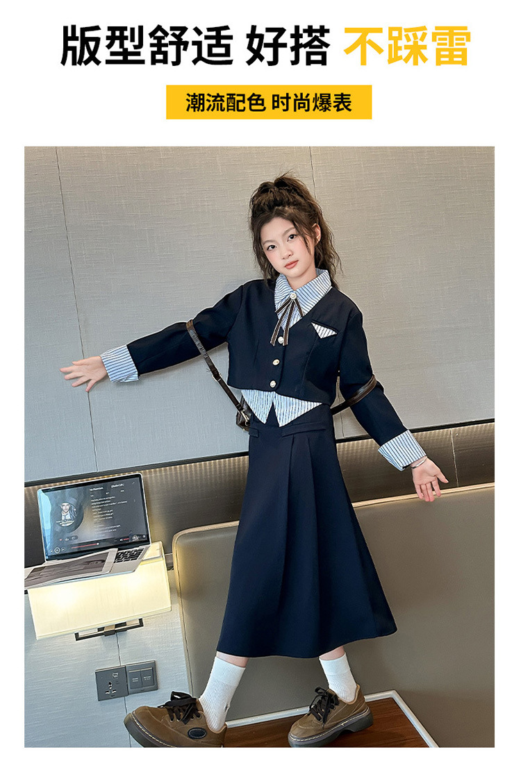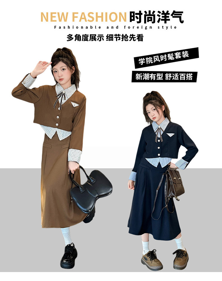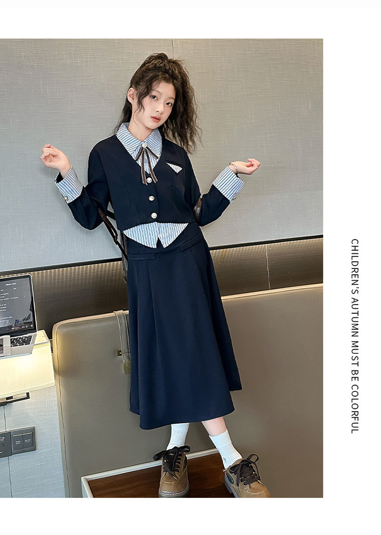 미국 아카데미 스타일 세트 가짜 투피스 스트라이프 패치 워크 최고 여성 가을 플리츠 스커트 롱 스커트 투피스 세트