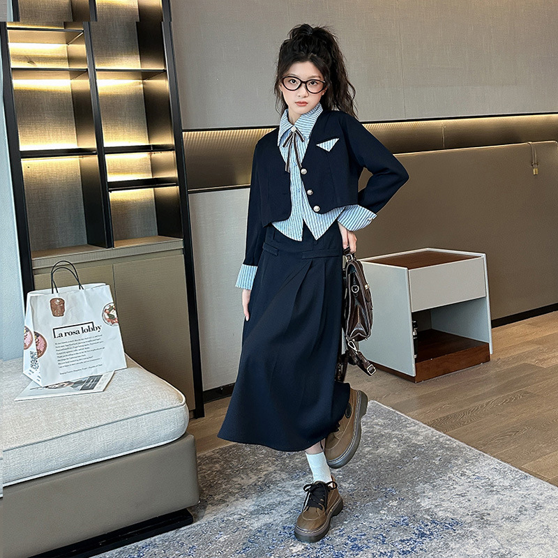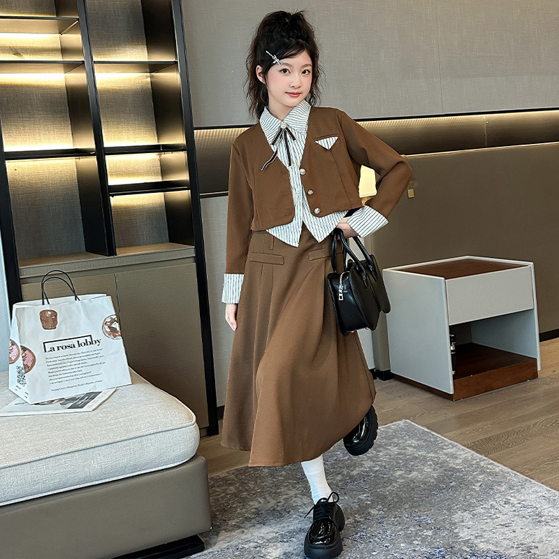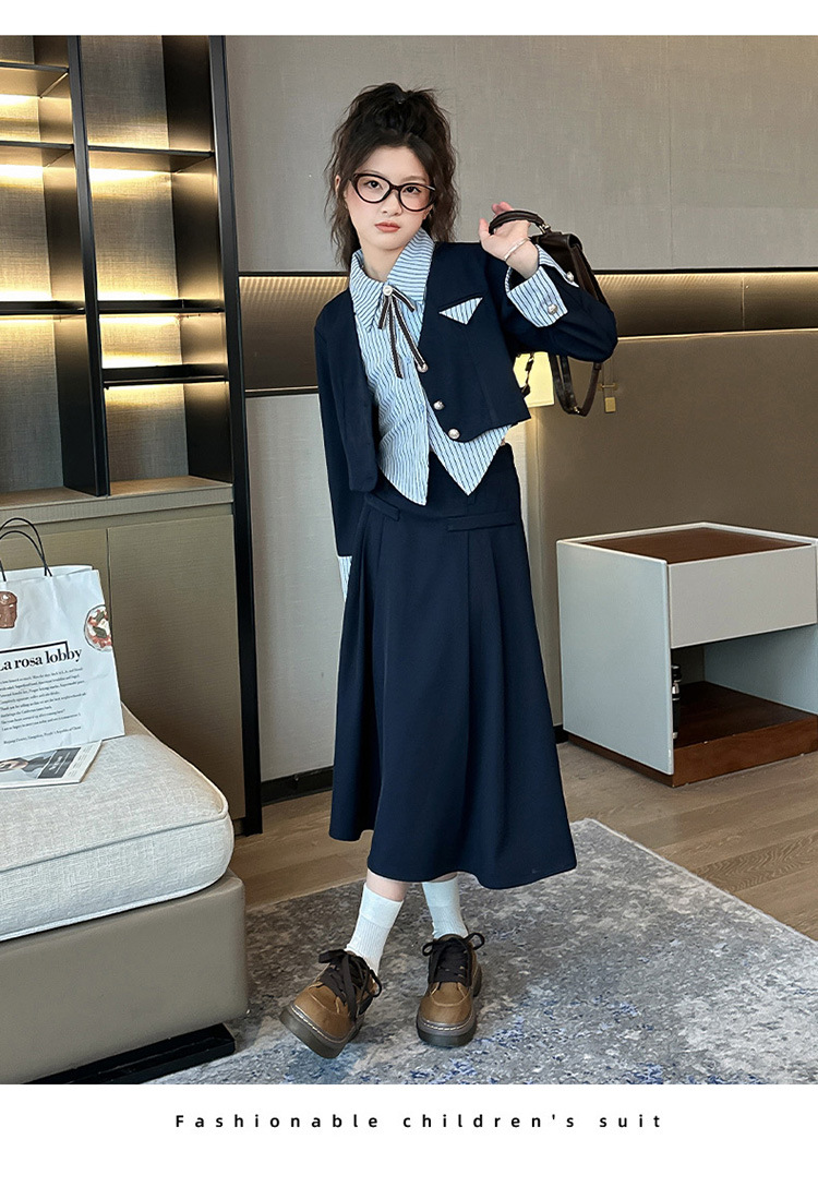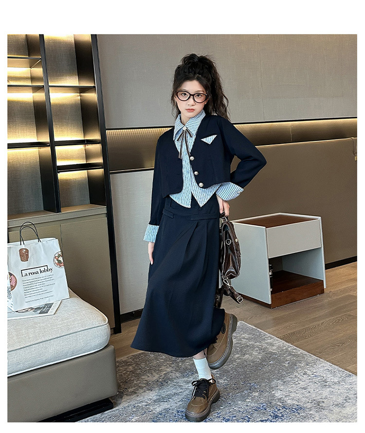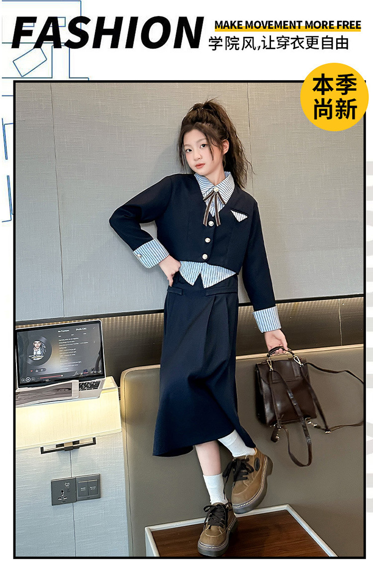 미국 아카데미 스타일 세트 가짜 투피스 스트라이프 패치 워크 최고 여성 가을 플리츠 스커트 롱 스커트 투피스 세트