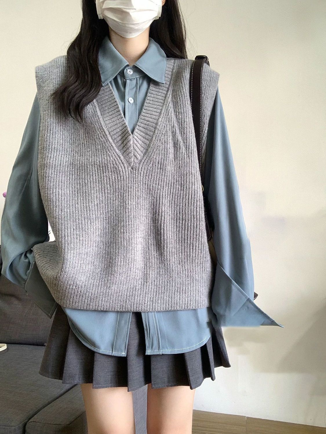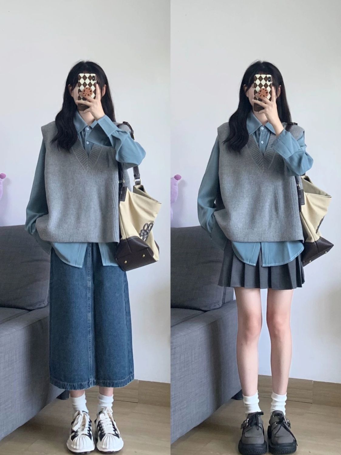 • 니트 조끼 + 셔츠 + 짧은 치마