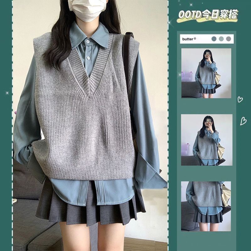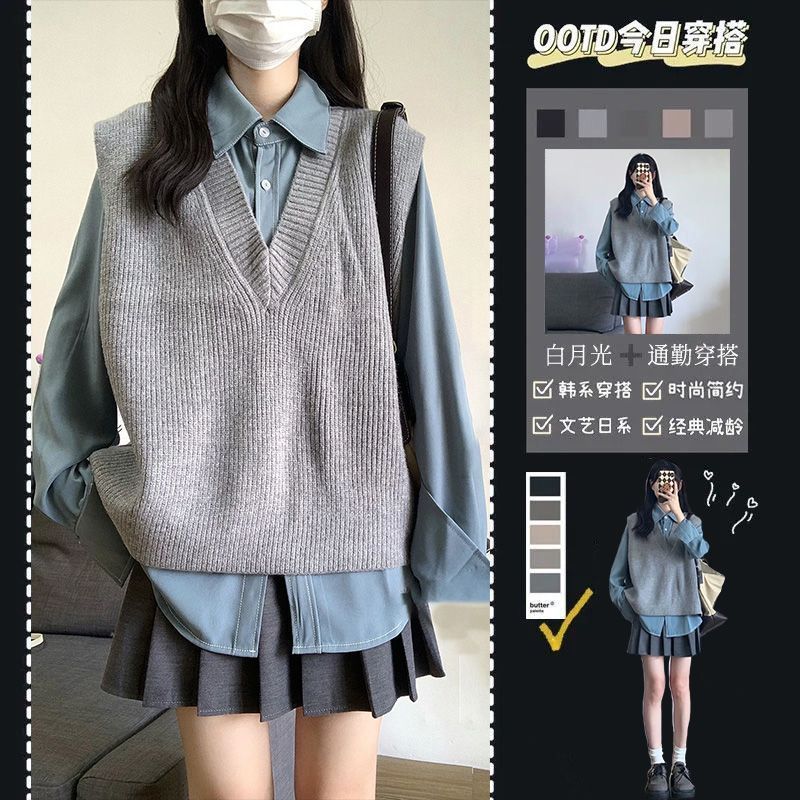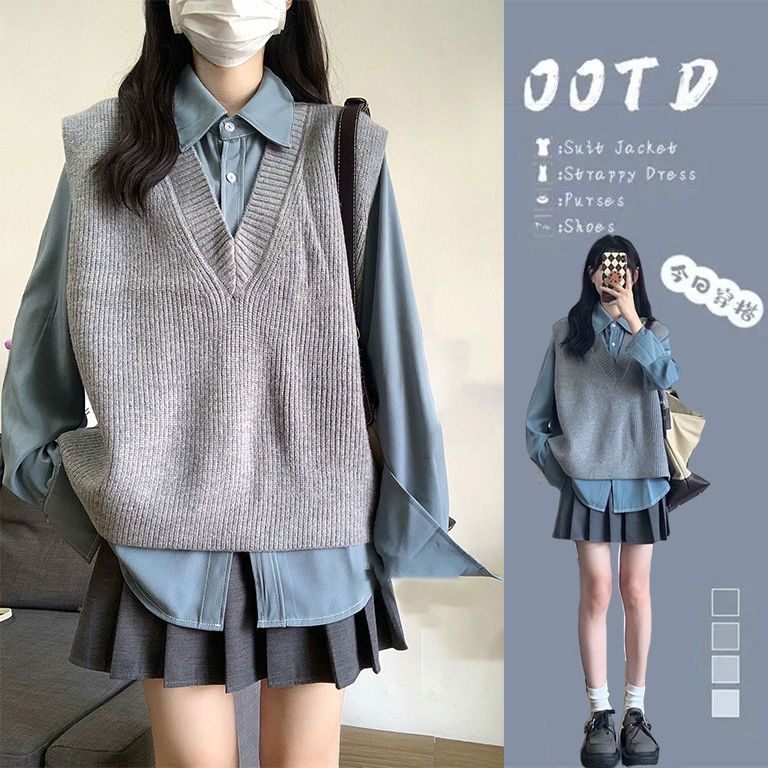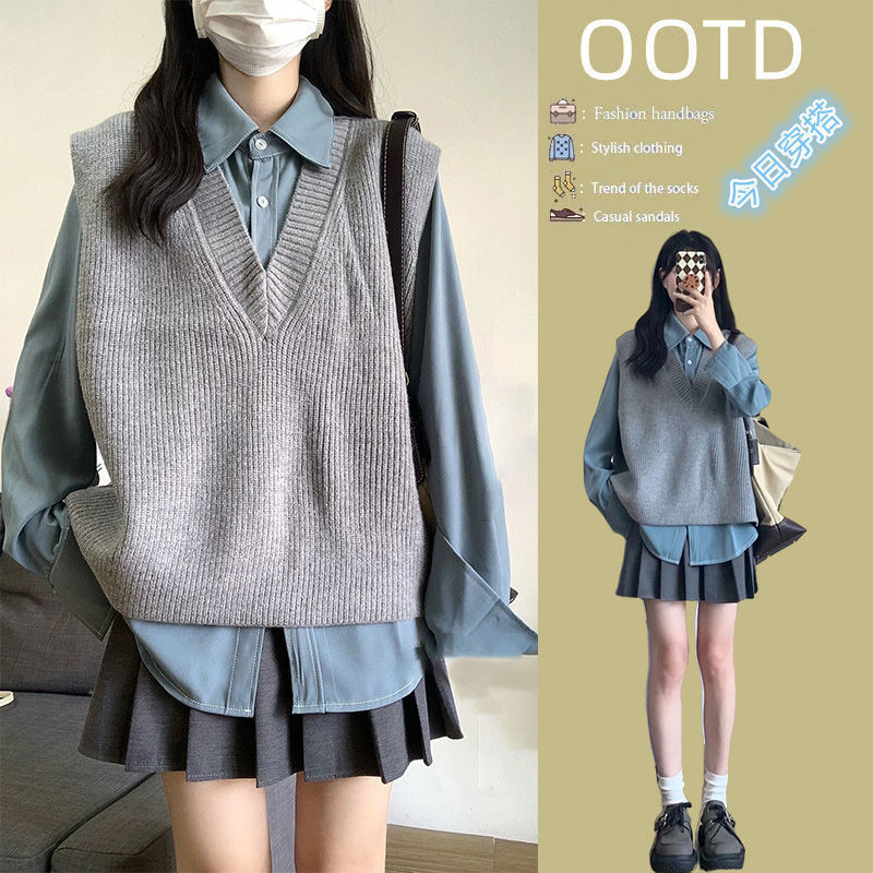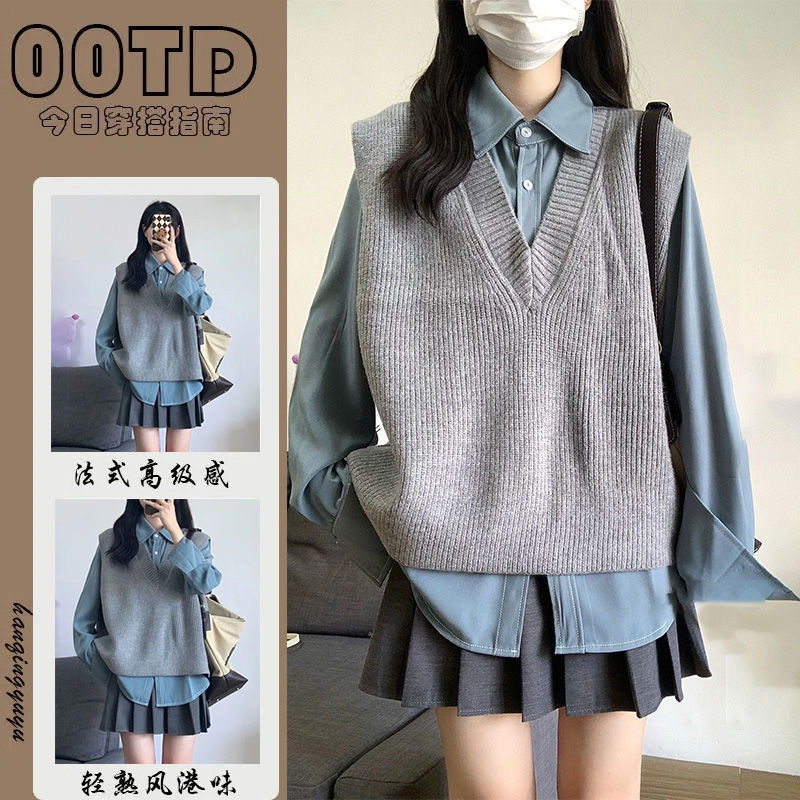 3 피스 세트 봄과 가을 빈티지 틈새 패션 니트 스웨터 스태킹 조끼 어울리는 셔츠 여성용 주름 짧은 치마스토어 가기